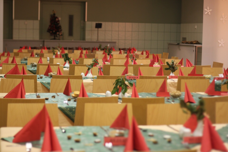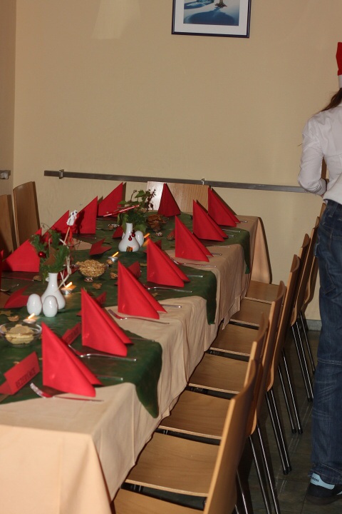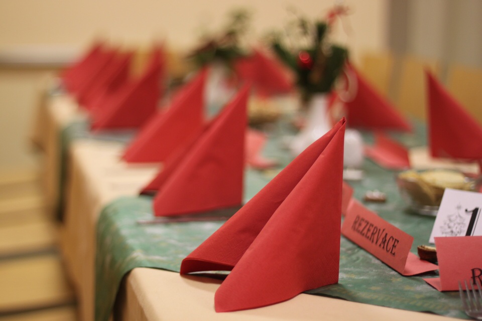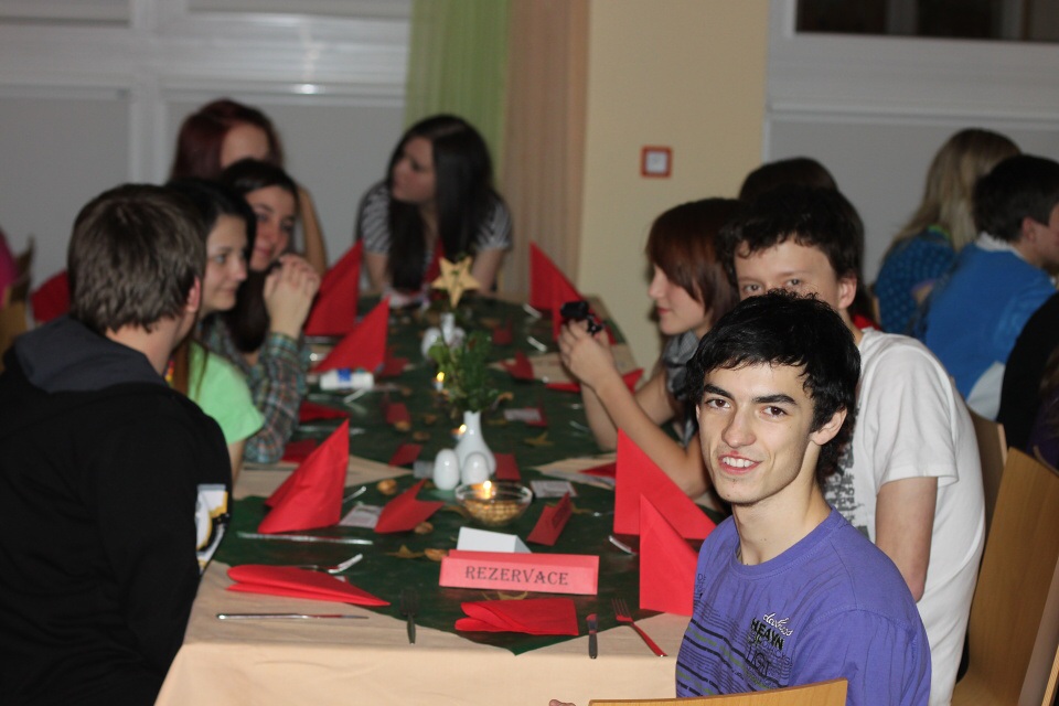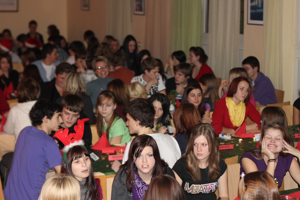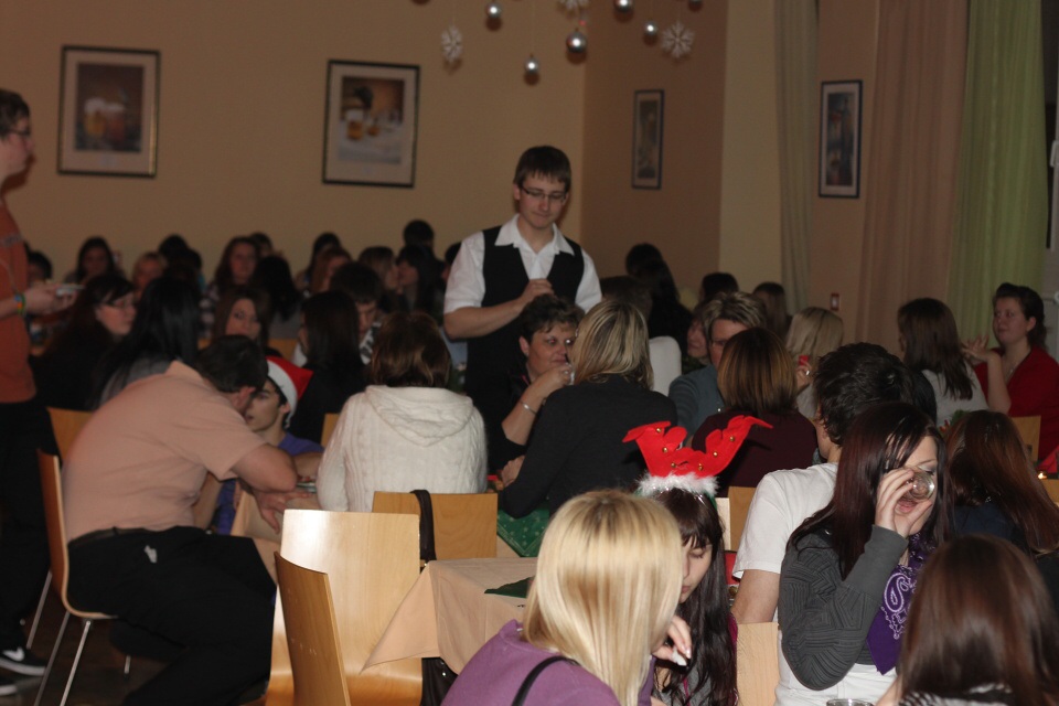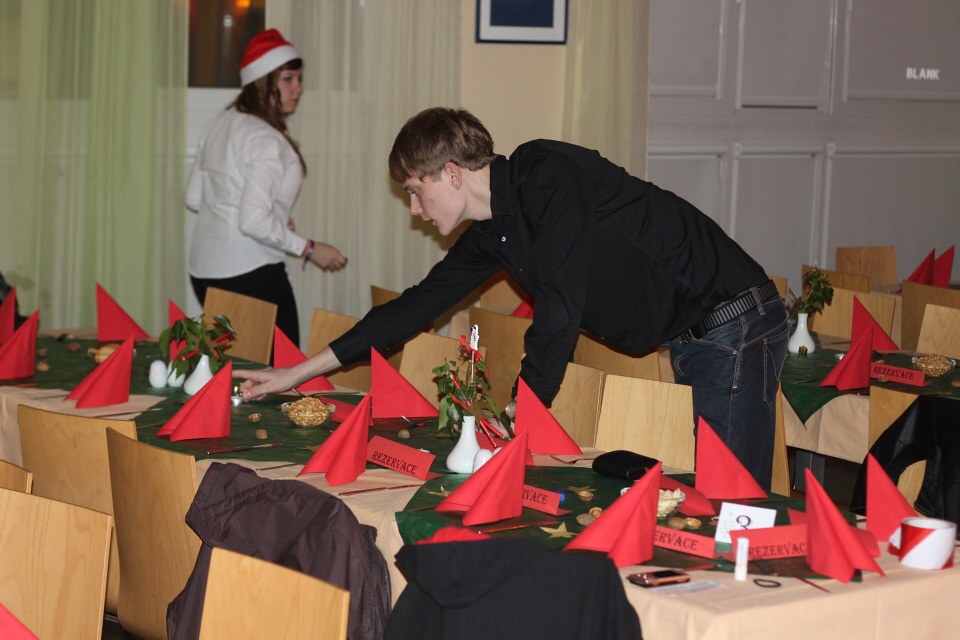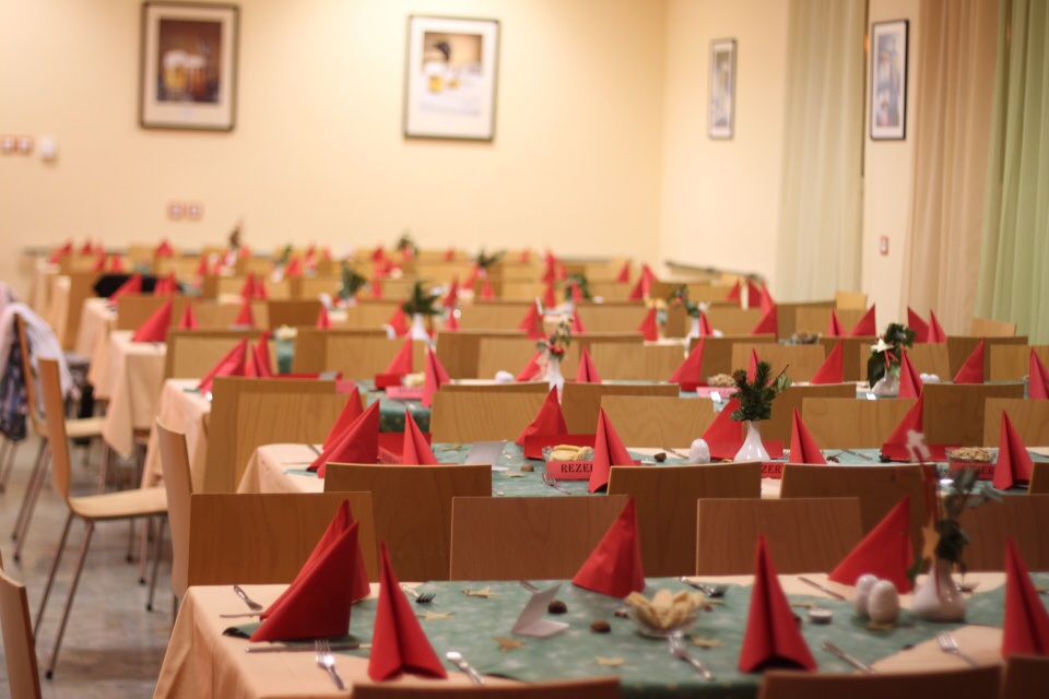 Úderem 18. hodiny se otevírají dveře. Jeden po druhém se vstupenkami v ruce vcházíme do jídelny, kterou stěží poznáváme. Stoly jsou netradičně uspořádány do řad a celá místnost je ozdobena vánoční dekorací.