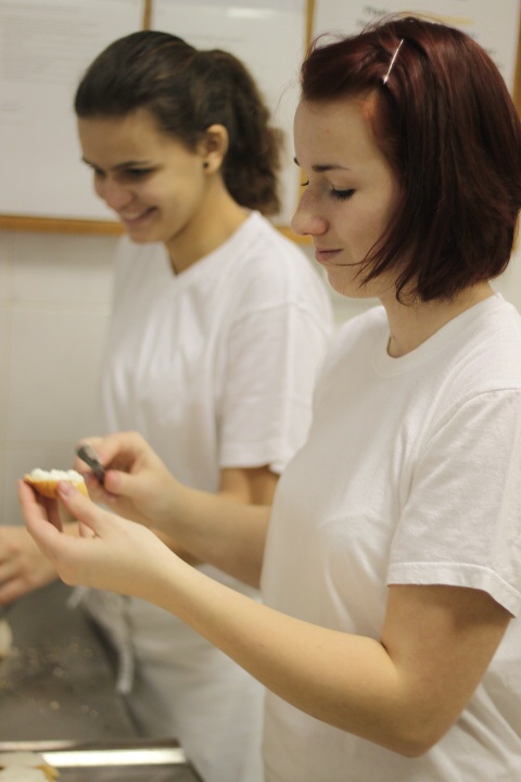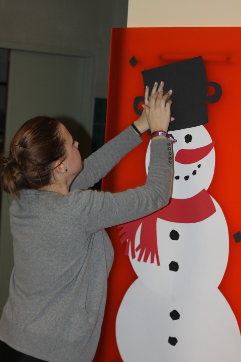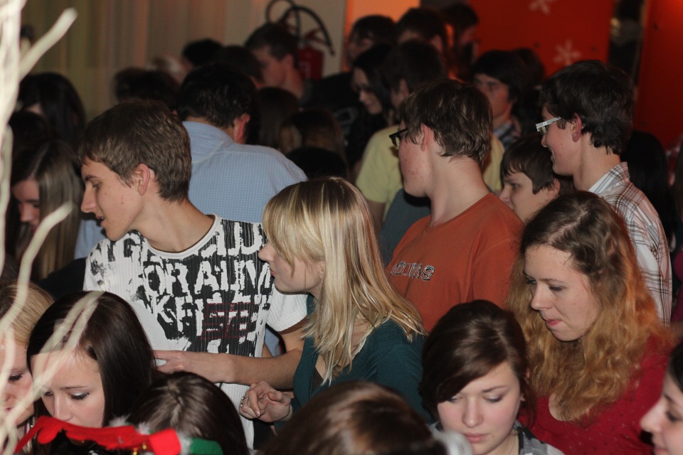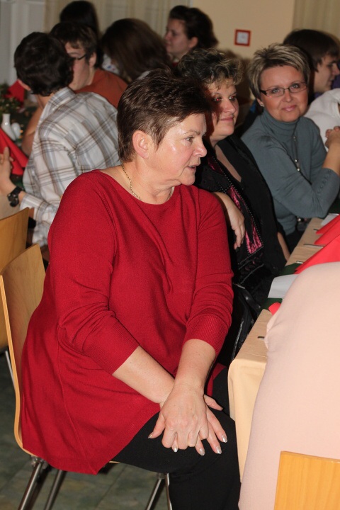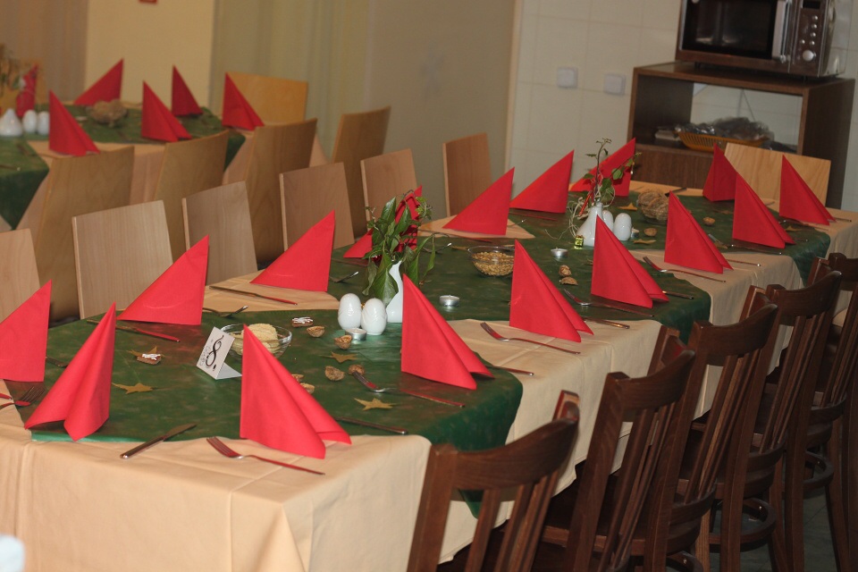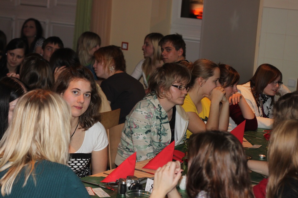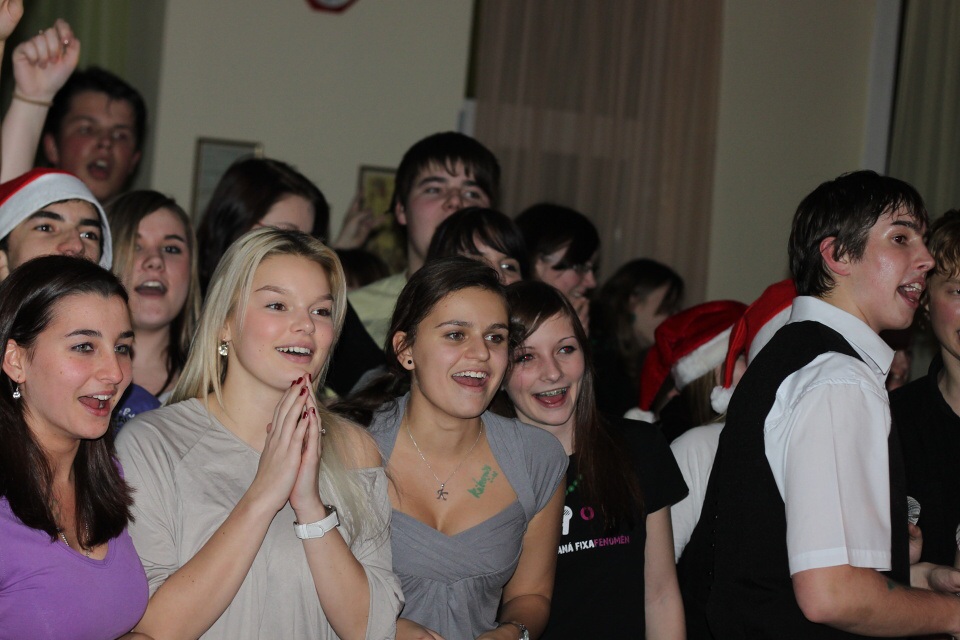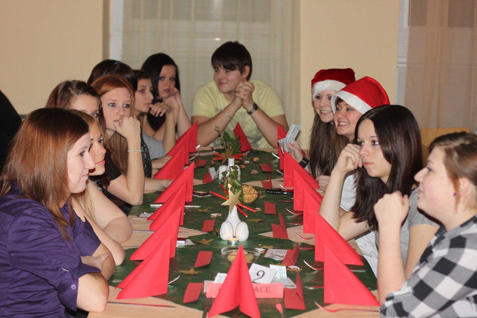 Úderem 18. hodiny se otevírají dveře. Jeden po druhém se vstupenkami v ruce vcházíme do jídelny, kterou stěží poznáváme. Stoly jsou netradičně uspořádány do řad a celá místnost je ozdobena vánoční dekorací.