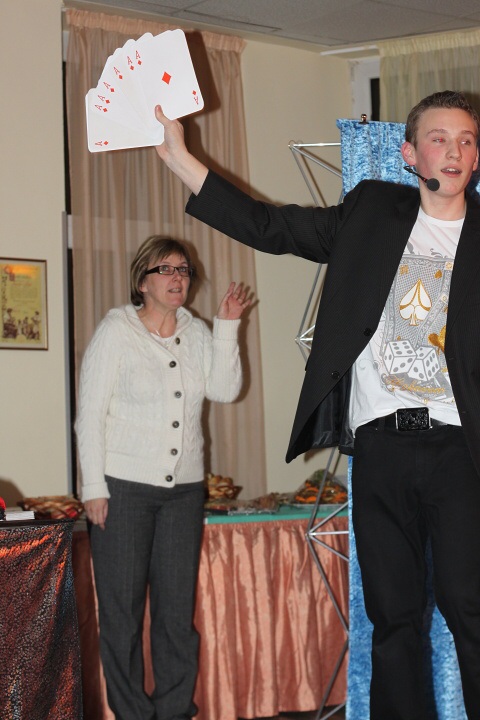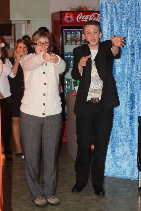 Druhé je velmi zajímavé. Paní učitelka si vybírá jednu kartu, kterou následně vkládá k ostatním. Karty jsou poté položeny na stůl několik metrů od paní učitelky, která má pistolí vystřelit do karet. Bylo evidentně vidět, že paní Drobná s pistolí každý den do kontaktu nepřijde, což je však naprosto pochopitelné. První ani druhá rána cíl nezasahuje a třetí dokonce strefí stůl. Čtvrtá střela již zasáhne svůj cíl. Nyní bohužel nevidím vyvrcholení kouzla, což mě mrzí.