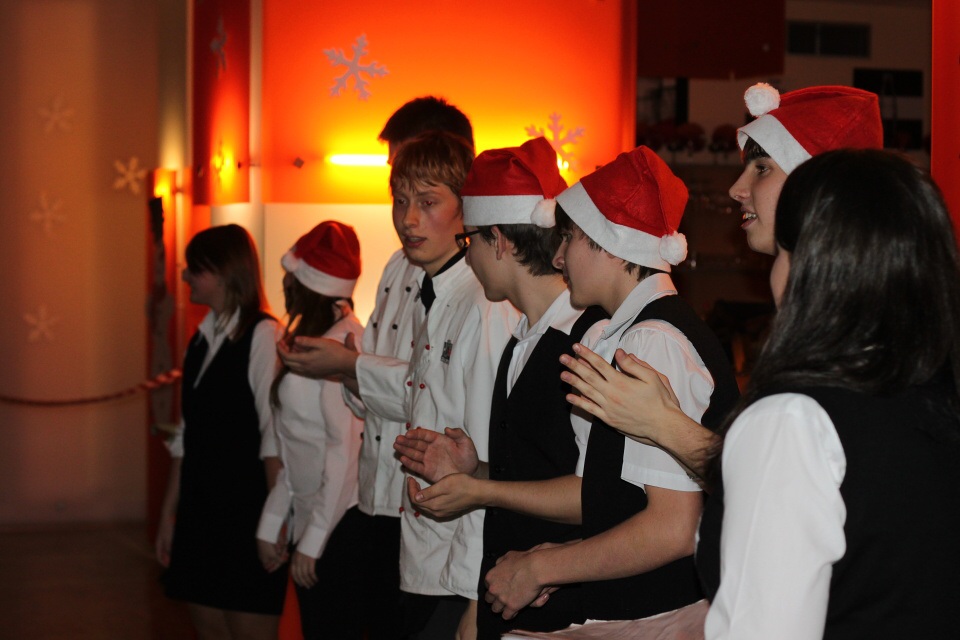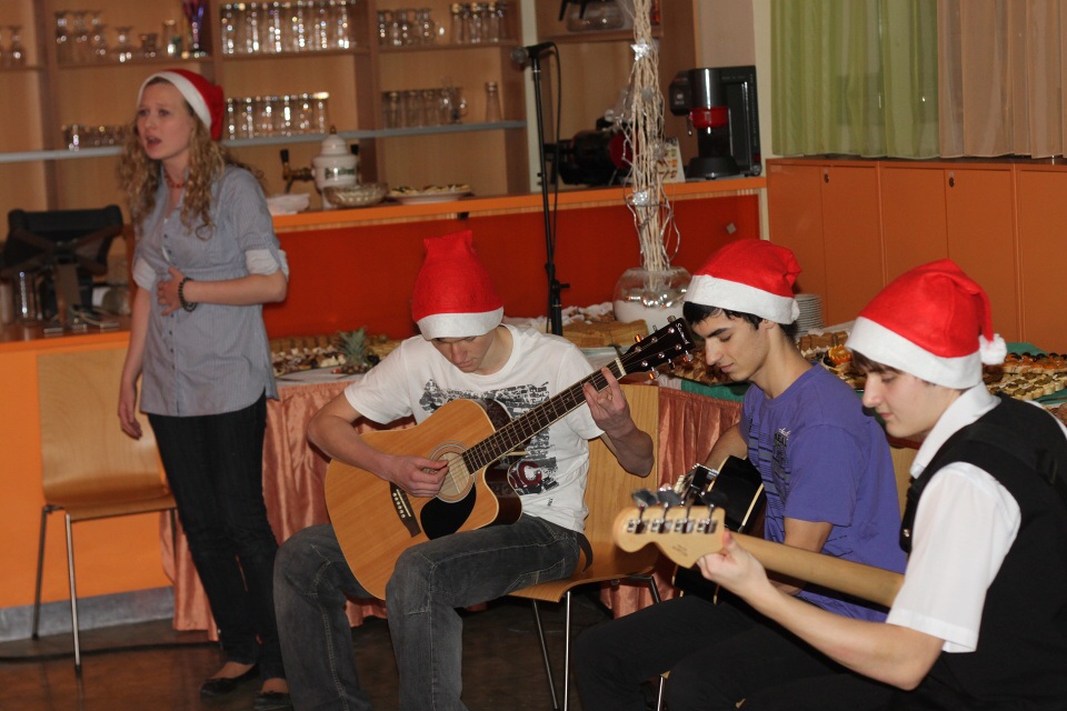 Co by to bylo za vánoční raut, kdyby nezazněli vánoční koledy. Hudební skupina, složená z řad naších studentů, nám nejprve hraje několik písní, poté jsou vyzváni vychovatelé a učitelé ke zpěvu vánočních písní. Sbor nezní vůbec špatně a posléze se ke zpěvu přidávají i mnozí z nás.