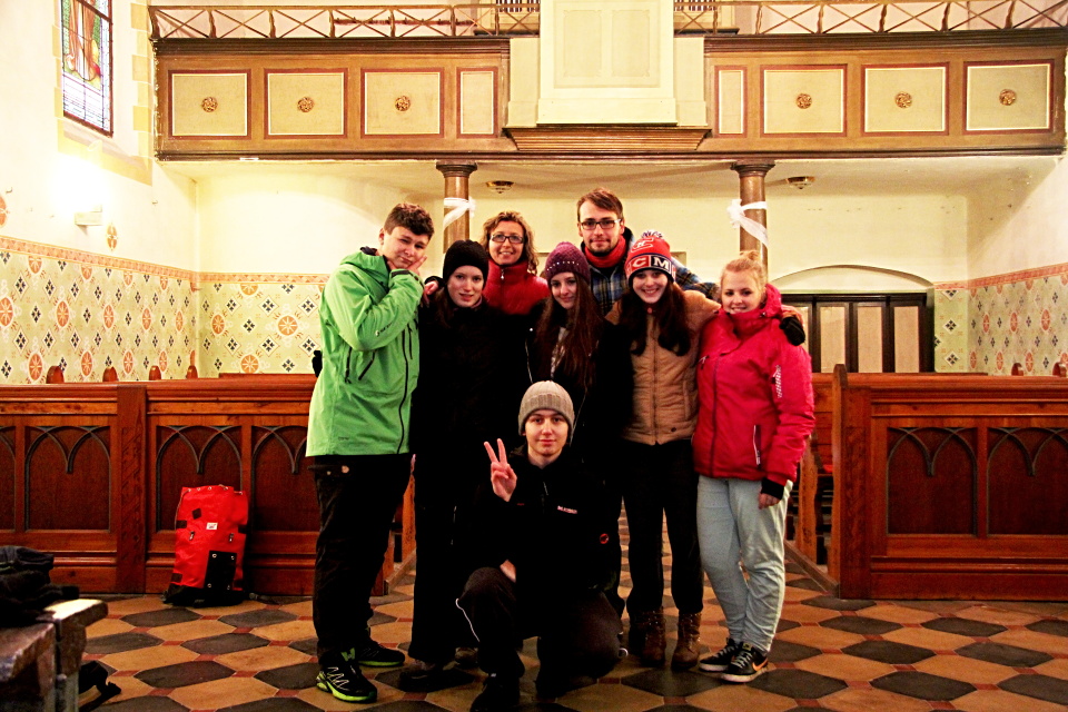 V sobotu večer nás ještě čekalo spaní v Havířském kostelíku v Poděbradech, na jehož místě bylo v 15. století popraveno 10 kutnohorských havířů. Po příchodu do kostela nastaly přípravy našich postelí, které se skládaly z rozložených kartonových krabic, spacáku, polštářku a popřípadě deky. Před spaním jsme skládali různé obrazce ze sirek, které nás měly ochránit. Plni emocí a zážitků v tomto dni jsme se rozhodli, že je čas jít spát.