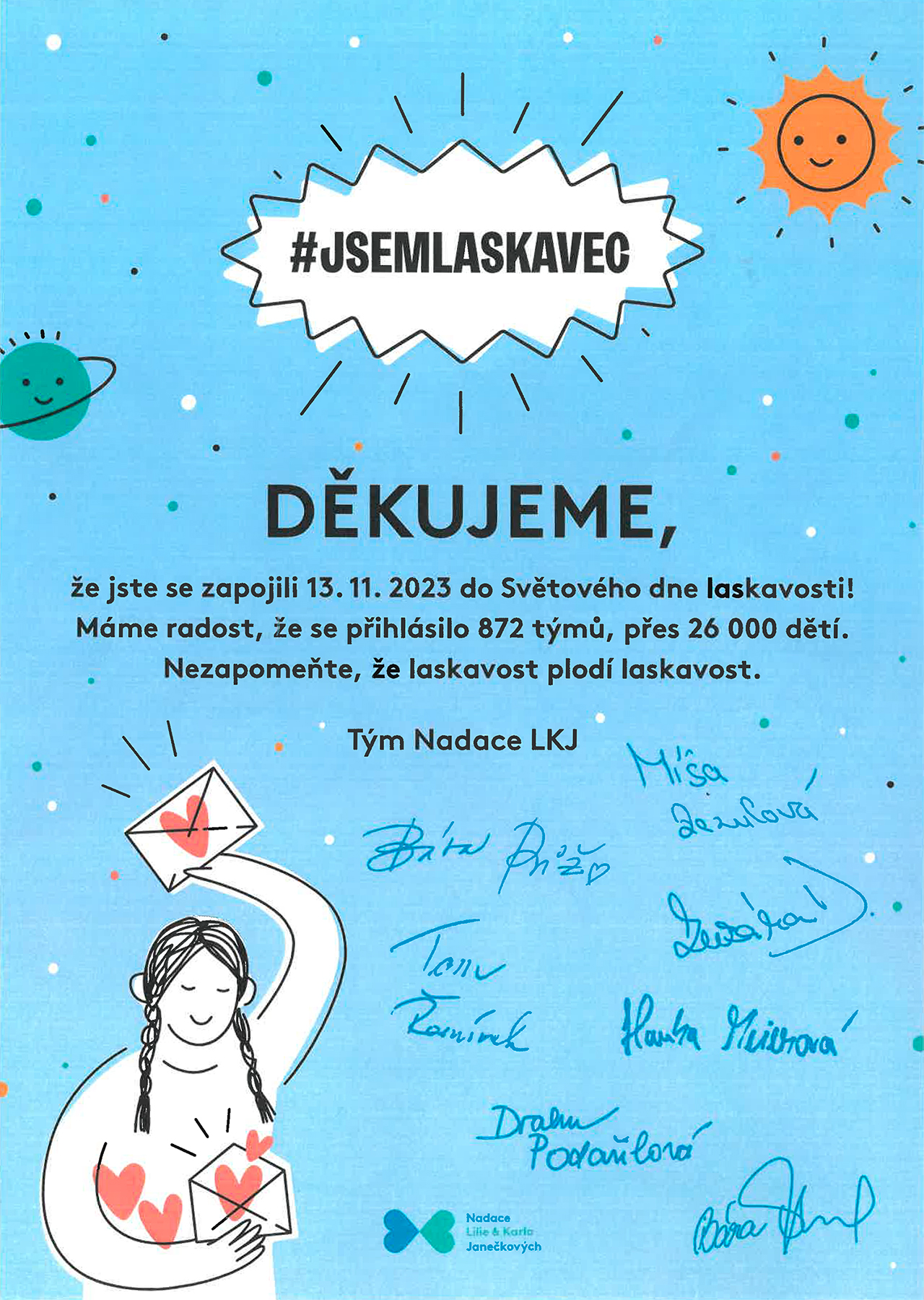 Dobrých skutků není nikdy dost, a proto se třída 2.B společně s paní učitelkou Procházkovou rozhodla připojit ke Světovému dni laskavosti. Do projektu se zapojilo celkem 6 žáků.