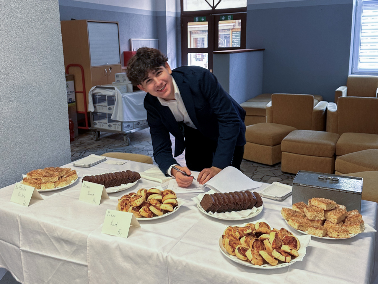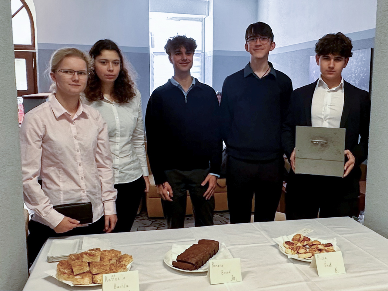 Ve středu někteří z nás napekli dobroty, jiní chystali cenovky a kasírky či hlášení do školního rozhlasu. Ve čtvrtek 9. 11. jsme se sešli již brzo ráno, abychom vše přichystali na prodej. Během prvních přestávek se nám podařilo prodat téměř všechen banana bread, margot řezy i pizza šneky. Dobroty jsme nabídli i našim učitelům, kteří také rádi ochutnali a přispěli na dobrou věc.