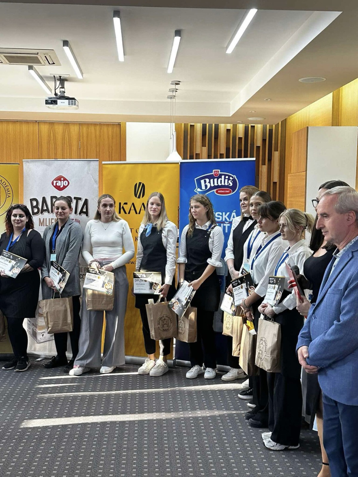 V úterý ráno jsme po snídani vyrazili do Hotelové akadémie Prešov, kde se celá událost konala. Nejprve jsme si šly vylosovat pořadí, ve kterém půjdeme, poté jsme měly pár minut na trénink a na zkoušku mlýnku a kávovaru. V 9:00 nás přivítali pořadatelé a vysvětlili nám všechny pokyny a pravidla. V této soutěži jsme měly za úkol připravit pro porotu 2x espresso, 2x capuccino a 2x vlastní koktejl na bázi Espresso Martini, a to v časovém rozmezí 10 minut. Po celou dobu jsme s úžasem koukali na ostatní soutěžící, kteří předvedli dechberoucí techniky. Ačkoliv jsme se neumístily, byl to pro nás velký zážitek, získaly jsme mnoho zkušeností do budoucna a celou soutěž jsme si velmi užily i s menší trémou, která nemohla chybět. Po soutěži jsme se vydali na procházku po městě, ochutnali pirožky a večer oslavili naši účast v soutěži. Abychom domů nejeli s prázdnou, nakoupili jsme různé sýry a klobásy.