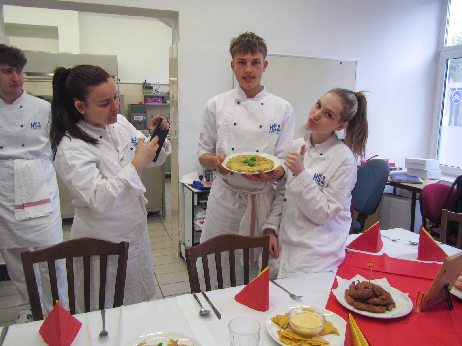 Clase de cocina espaňola – hodina španělského vaření s 2.D se opět nesla v rytmu temperamentní hudby, tance a přípravy typických pokrmů. U stolu nechyběla ani sangría, což akcentovalo jak dobrou náladu, tak rozhovory ve španělštině. Podávalo se gazpacho, paella, tortilla espaňola clásica, z Mexika k nám zabloudily nachos a tři fantastické dipy, flambovala se crema catalana, podávaly churros s karamelem a s naprosto úžasnou salsou z čokolády a chilli.