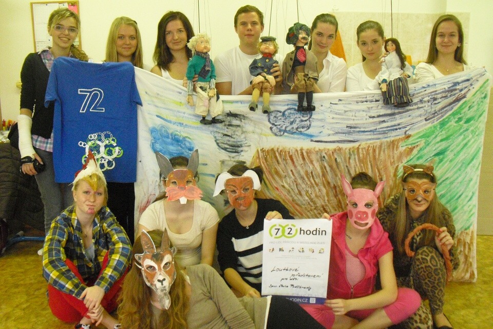V rámci projektu 72 hodin se část naší třídy rozhodla nacvičit krátkou pohádku, kterou jsme nakonec utvořili jako kombinaci loutkohry a vlastního hraní. Jelikož jsme měli na nácvik pár dní, tak se původní scénář hry Loupežníci a zvířátka musel upravit na 3 krátká dějství. Pro oživení hry jsme vytvořili pro každou zvířecí roli masku a na bílá prostěradla nakreslili prostředí lesa a dvorku.
