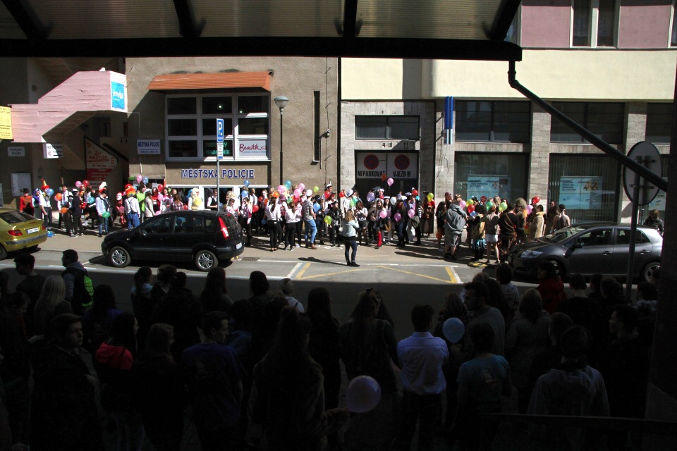 Celá škola se shromáždila před školou a mohly začít studentské oslavy, a to poděbradský Majáles, pořádaný studenty naší školy.