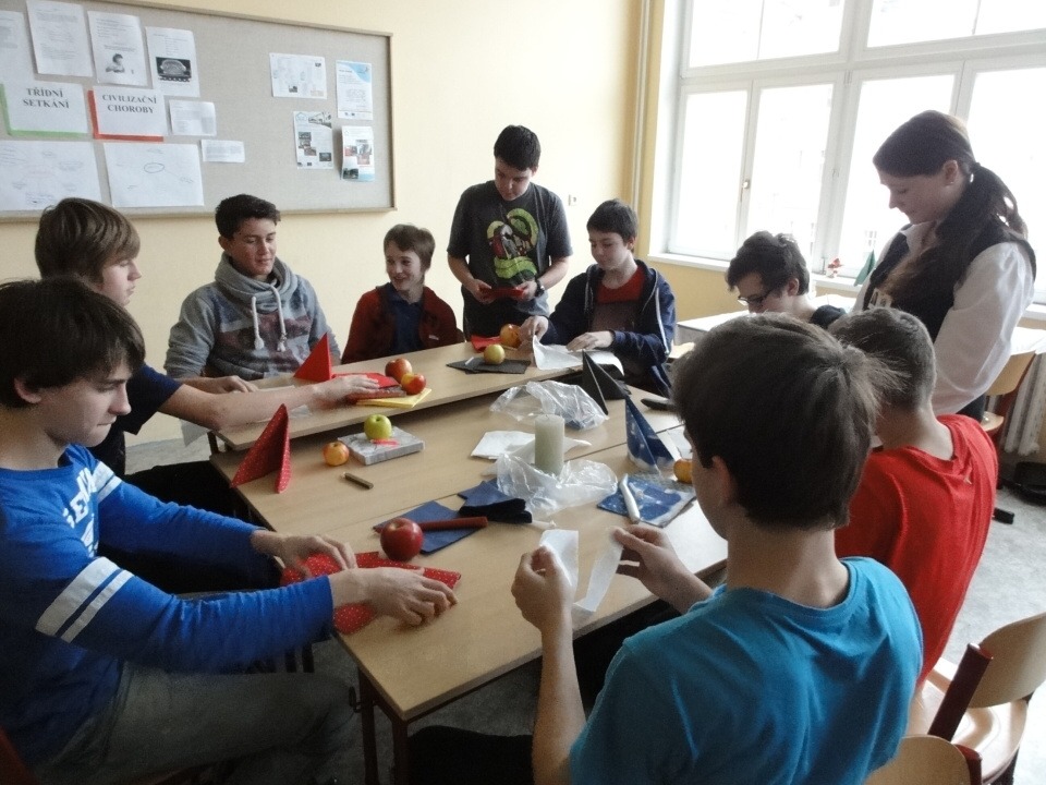 Dne 6. prosince 2013 jsme navštívily místní základní školu, abychom i zde žákům 8. tříd předvedly zajímavé činnosti, kterým se mohou na naší škole naučit. V předvánočním čase jsme si vybraly ukázku vánočně laděného stolu, příborů vhodných ke konzumaci jednotlivých štědrovečerních jídel a přípravu tematické dekorace. Den byl pro nás velmi náročný, protože jsme prováděly ukázky postupně pro 2 třídy vždy po 2 hodinách. Žáci byli pozorní, přesto bylo zapotřebí našeho plného soustředění na práci, a v této situaci jsme si uvědomily, jak náročná je práce učitele.