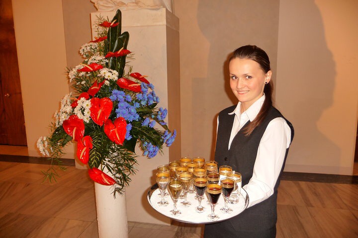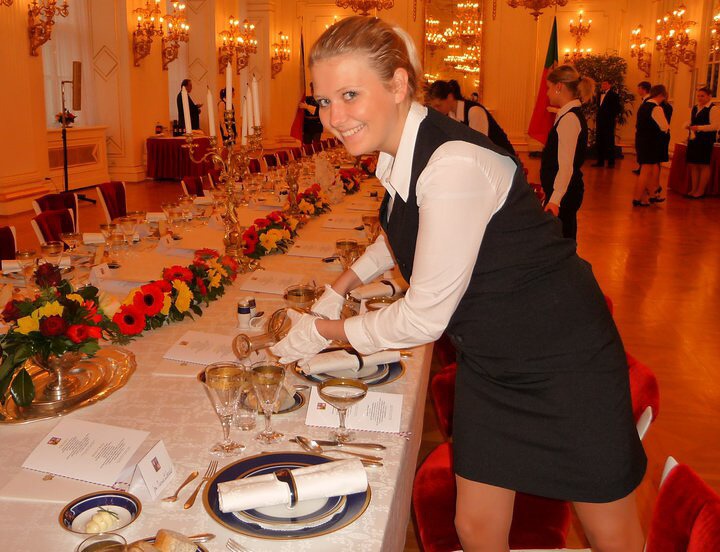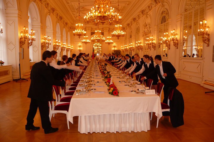 Ihned po příjezdu jsme se s chutí pustily do přípravných prací. Odměnou za to nám byla výborná večeře. Po krátkém zkoušení nástupů jsme byli připraveni na příchod prezidentských párů. Po projevech obou prezidentů a poslechnutí hymny České a Portugalské republiky byla zahájena obsluha, která probíhala bezproblémově. Dovolím si říct, že byla jednodušší než náš banket.