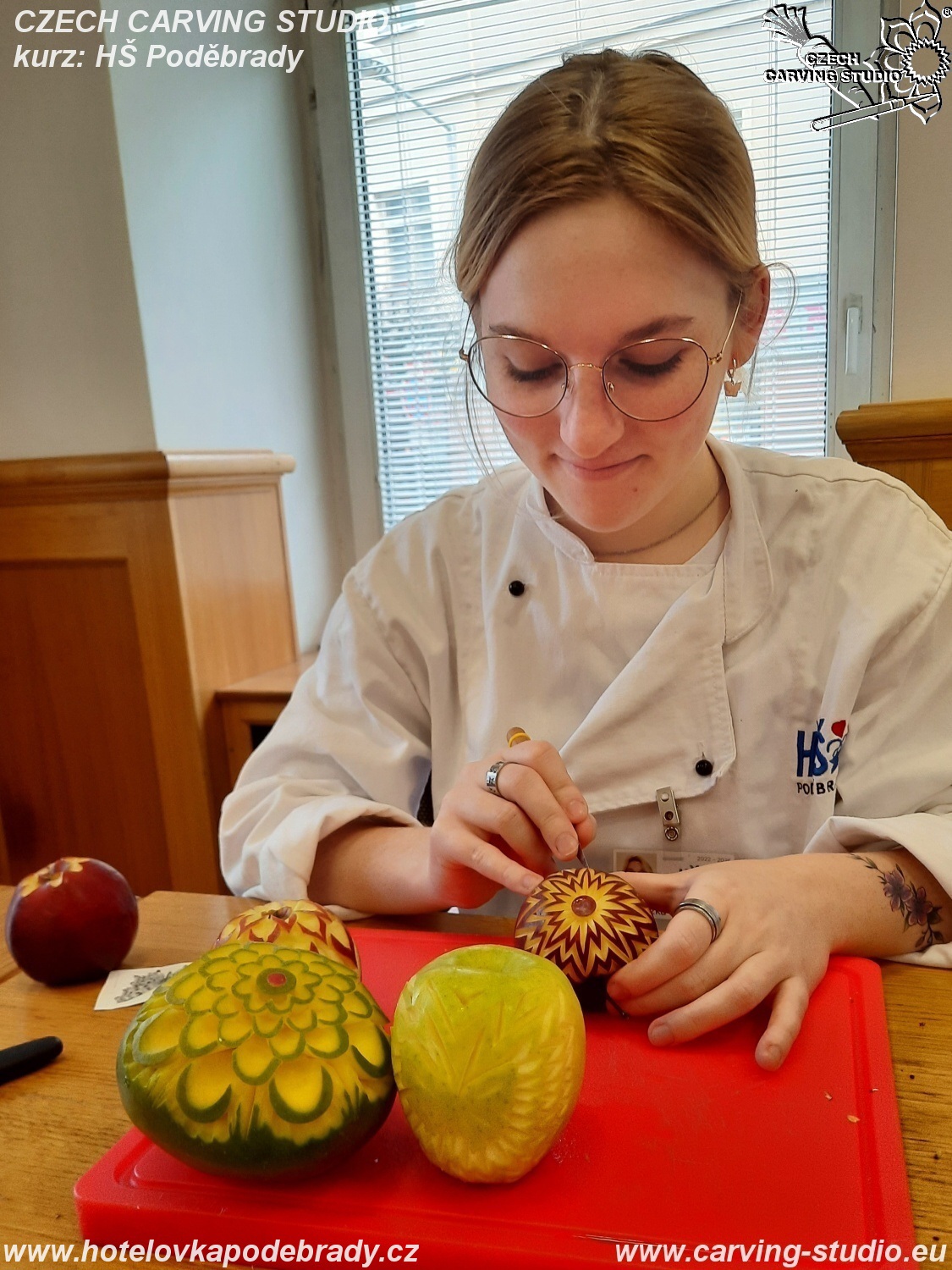 Druhý den jsme se sešli už v sedm hodin ráno a začali zpracovávat ovoce. Pomocí dlátek jsme naše jablka a manga ozdobili hvězdami a květinami, z pomerančů jsme vyrobili vlnky a z kiwi se staly želvičky. Na konci kurzu se všichni podívali, jak vyřezat růžičku z ředkve a listy z okurky.