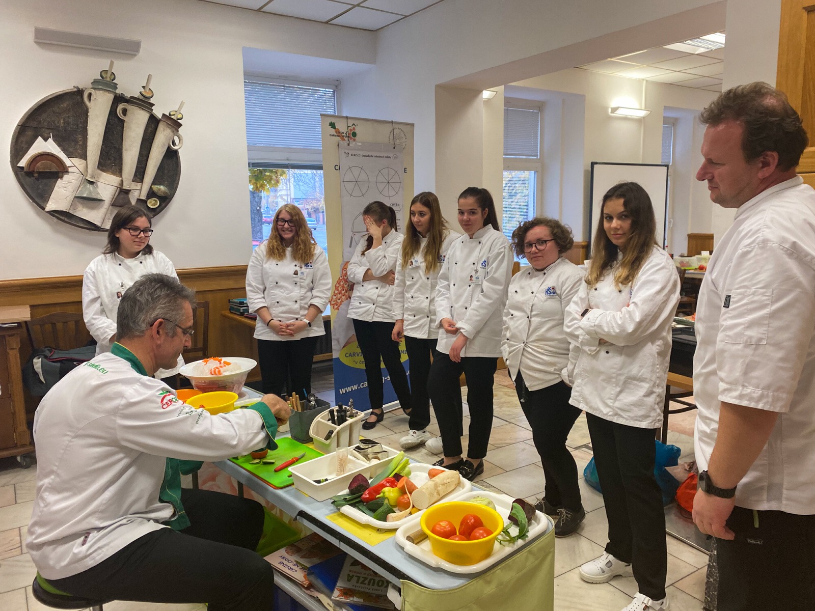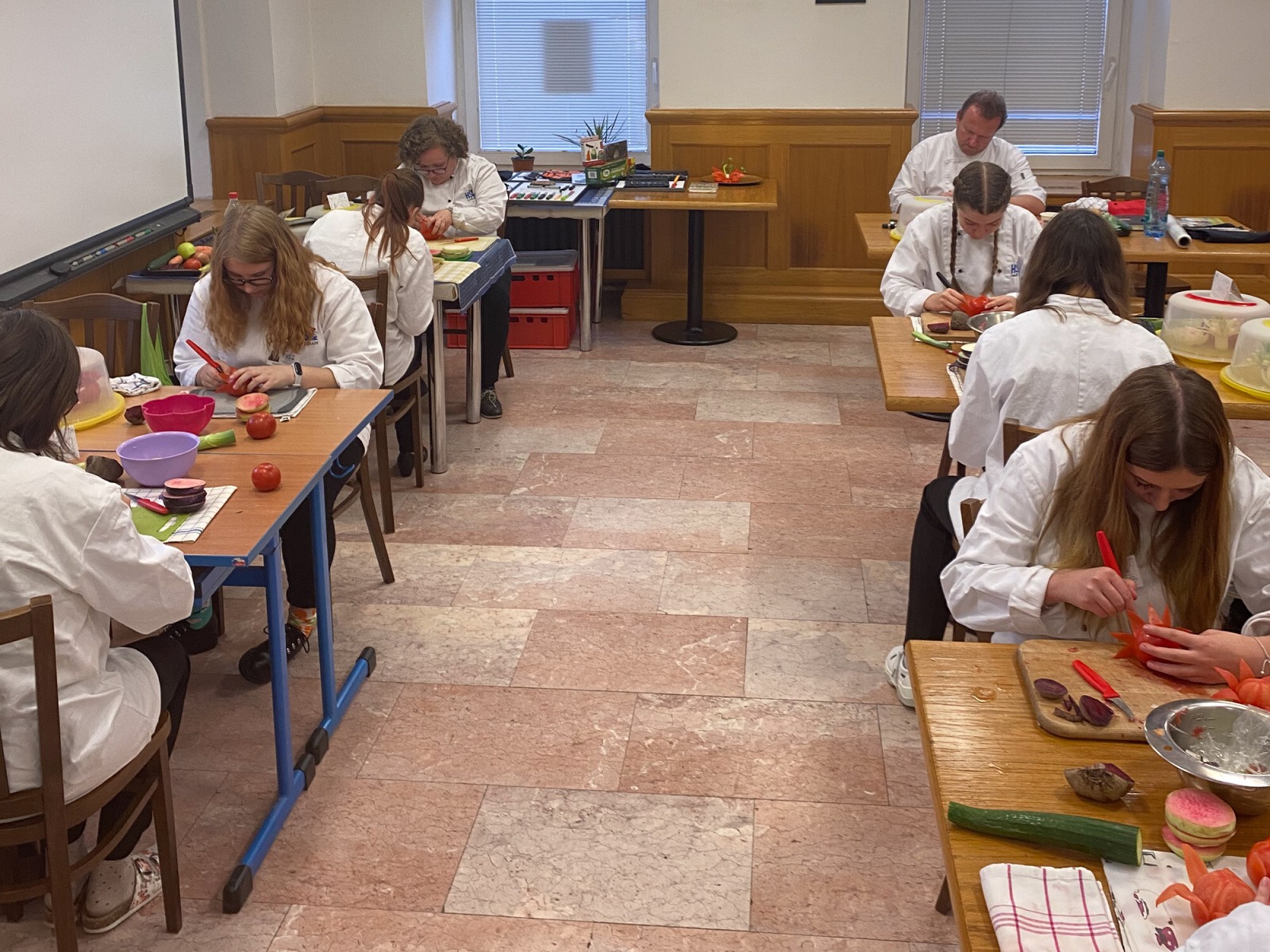 První den jsme se učili, jak dělat jednoduché zeleninové ozdoby, které nože používat a jak je správně držet. Také jsme se naučili s různými dlátky ve tvaru U nebo V.