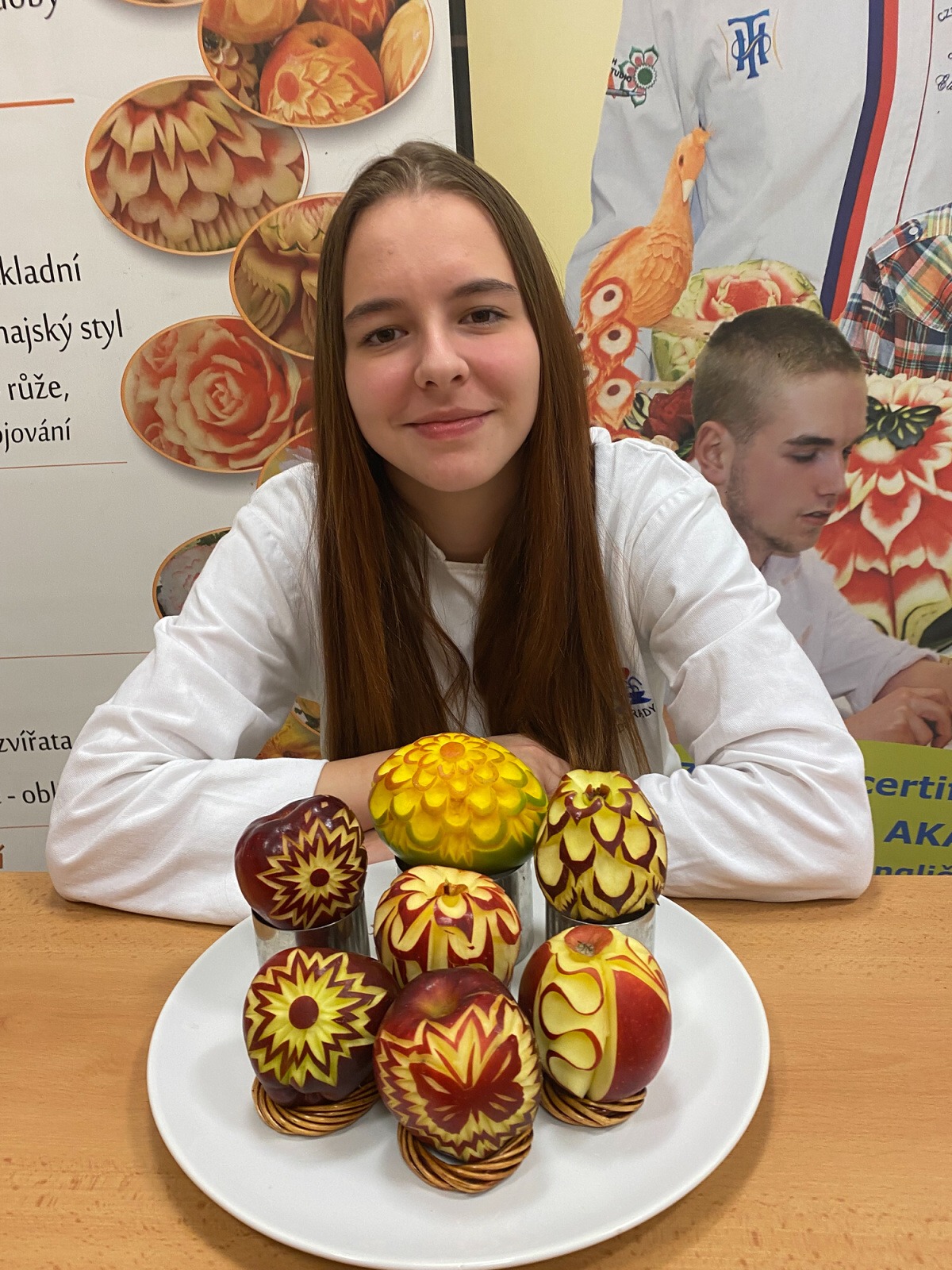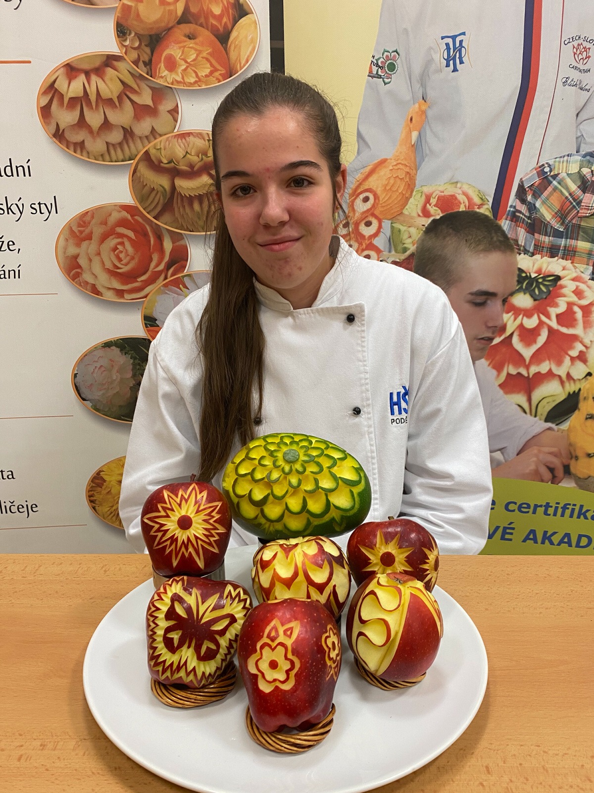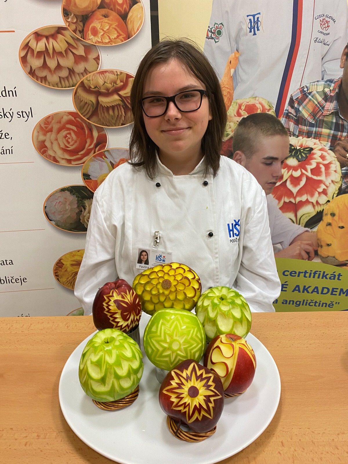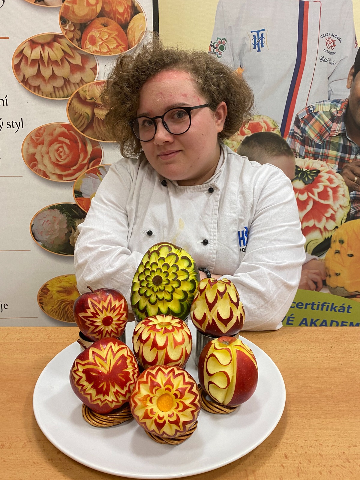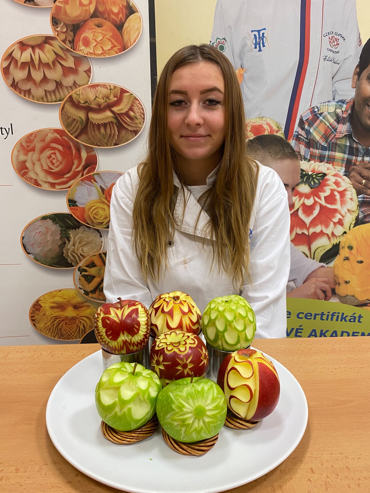 Na konci kurzu jsme soutěžili o to, kdo vyřeže za 45 minut nejhezčí jablko, vyfotili jsme se s našimi výrobky a obdrželi jsme certifikáty z kurzu.