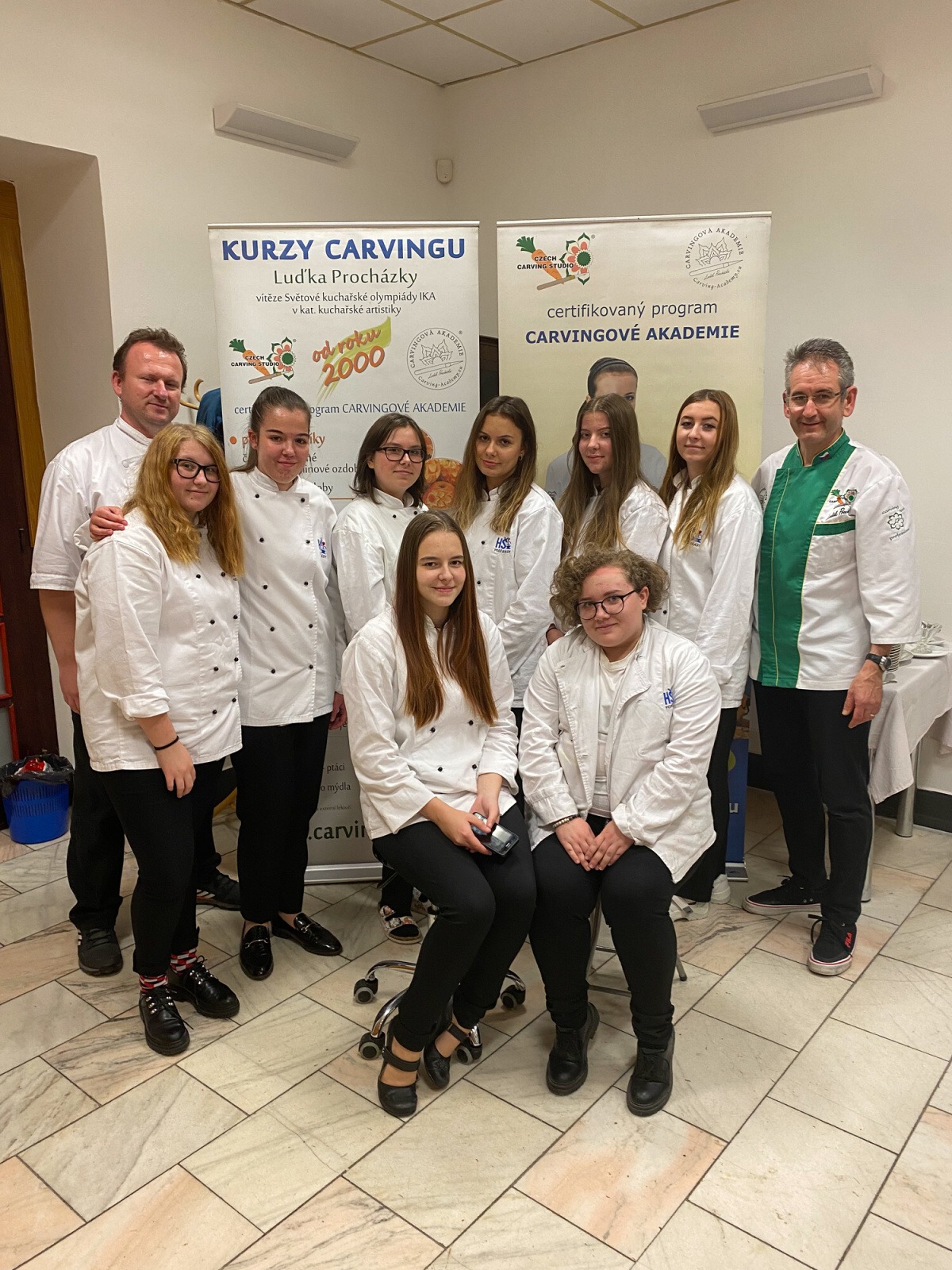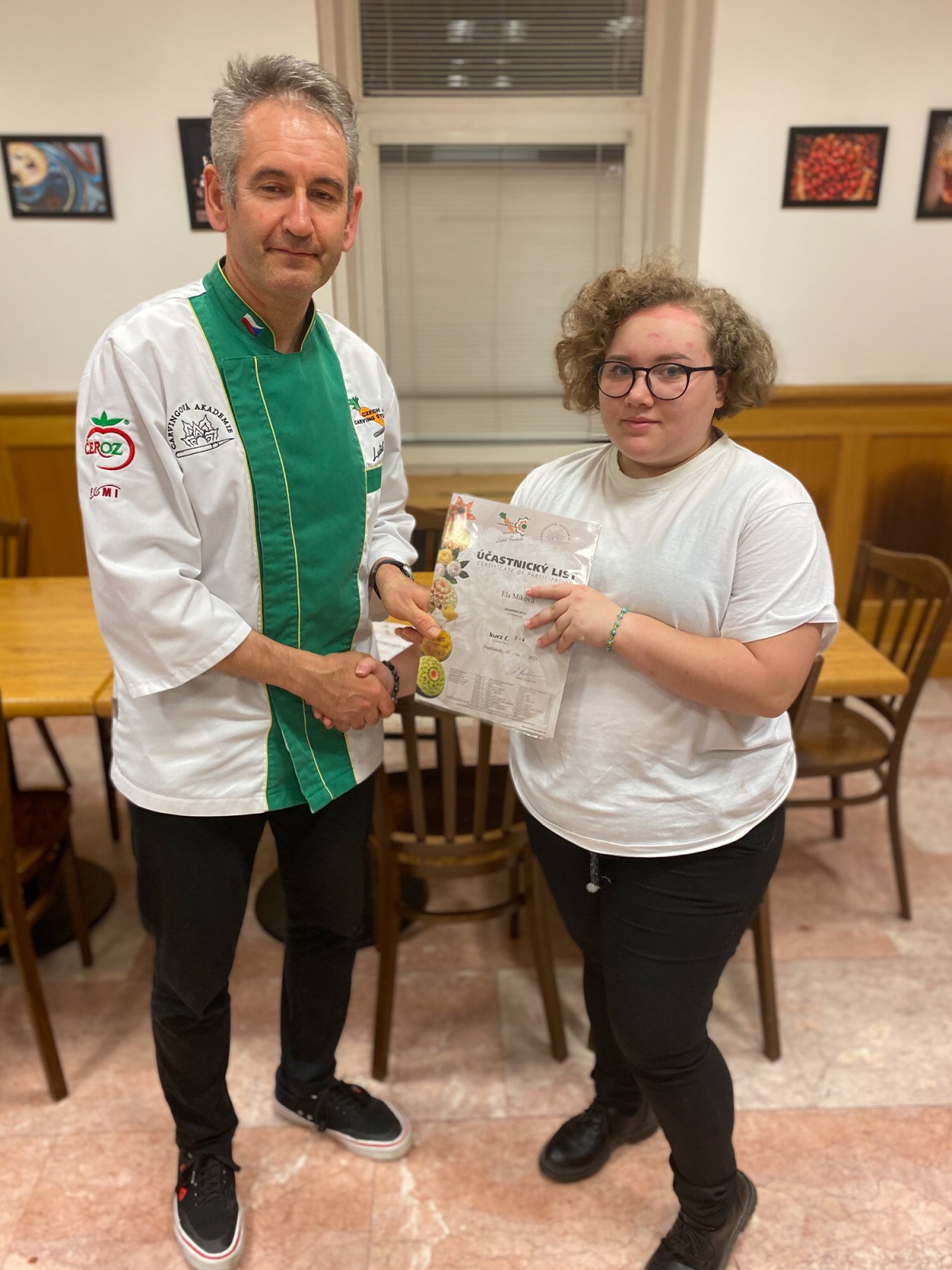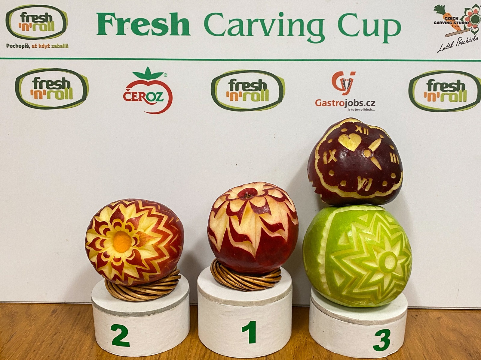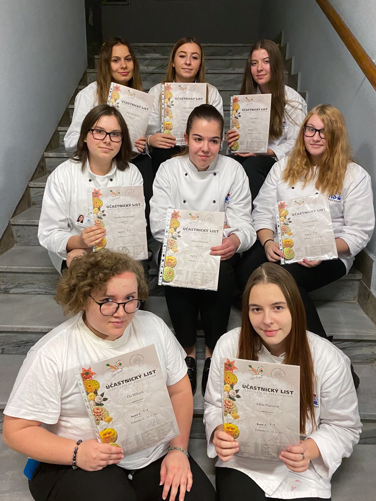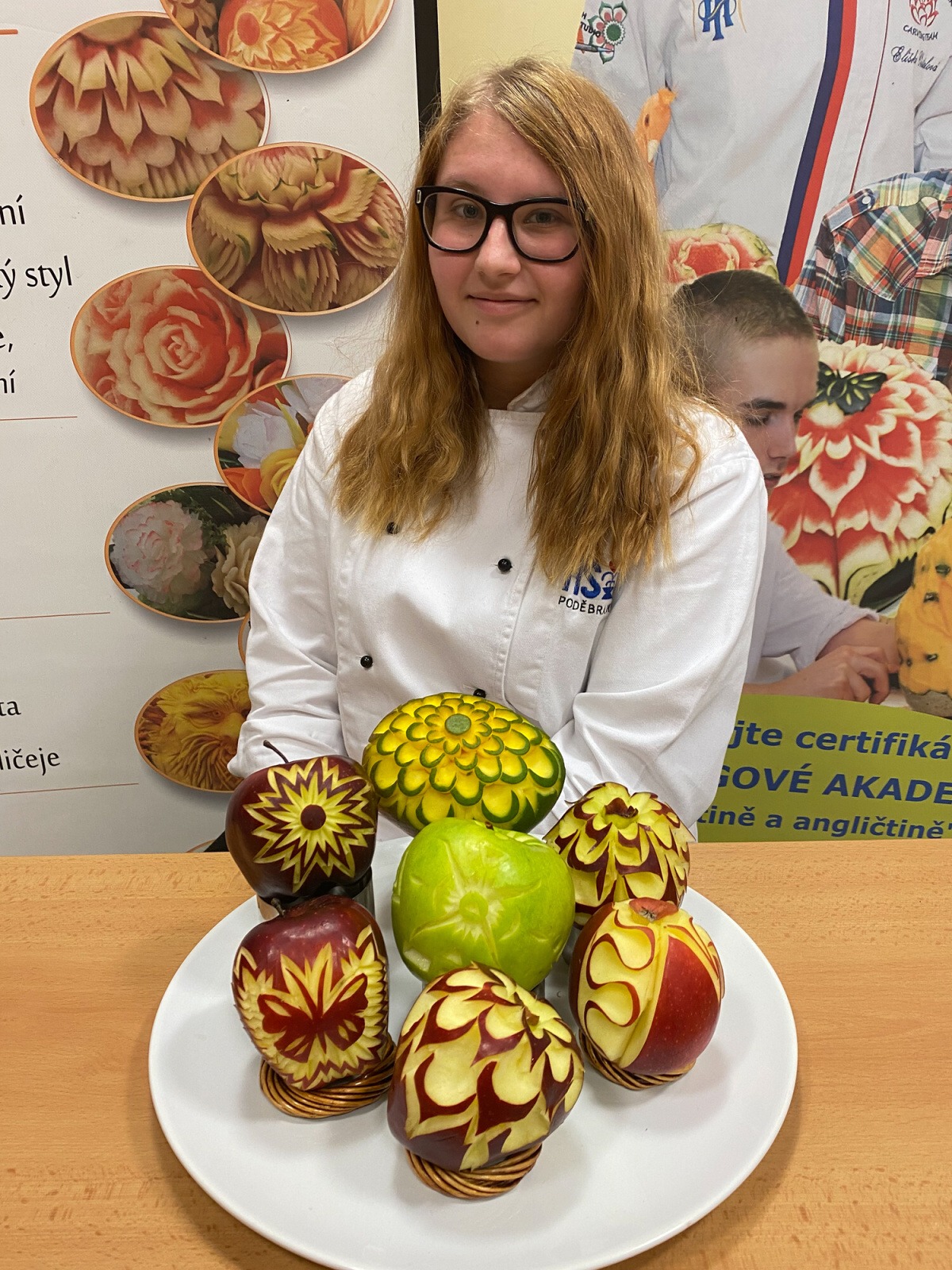 Na konci kurzu jsme soutěžili o to, kdo vyřeže za 45 minut nejhezčí jablko, vyfotili jsme se s našimi výrobky a obdrželi jsme certifikáty z kurzu.