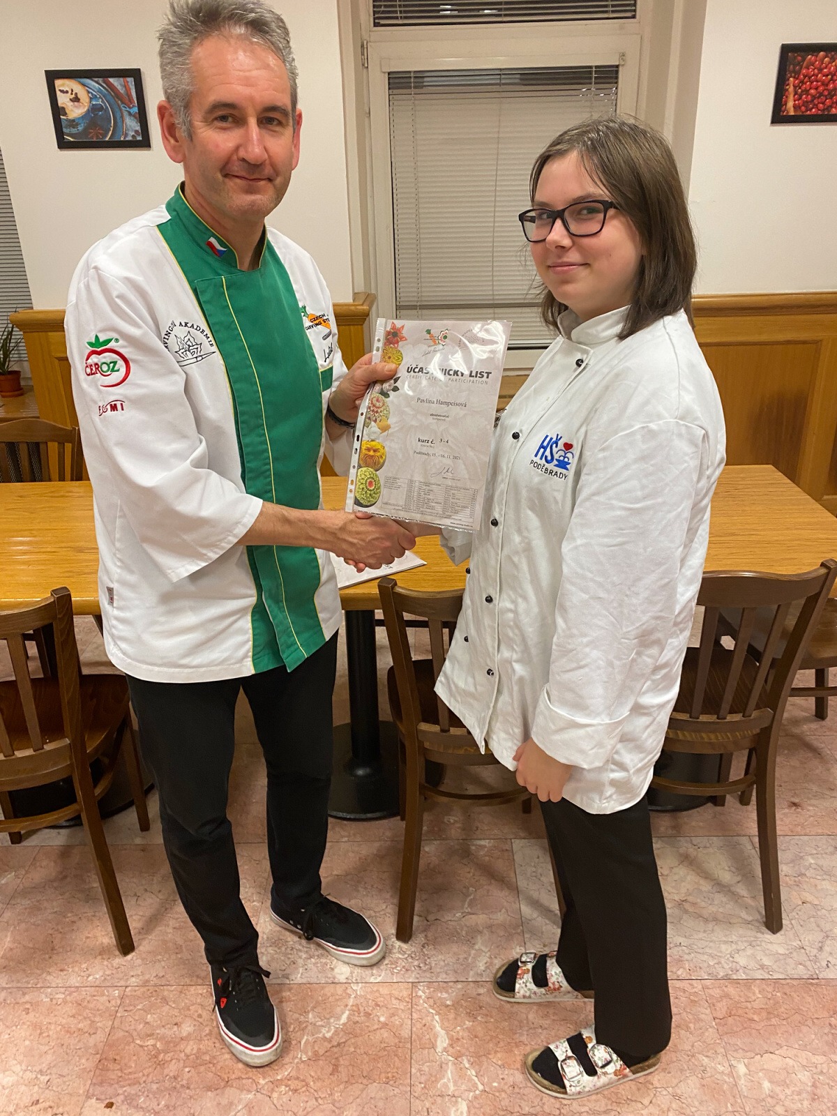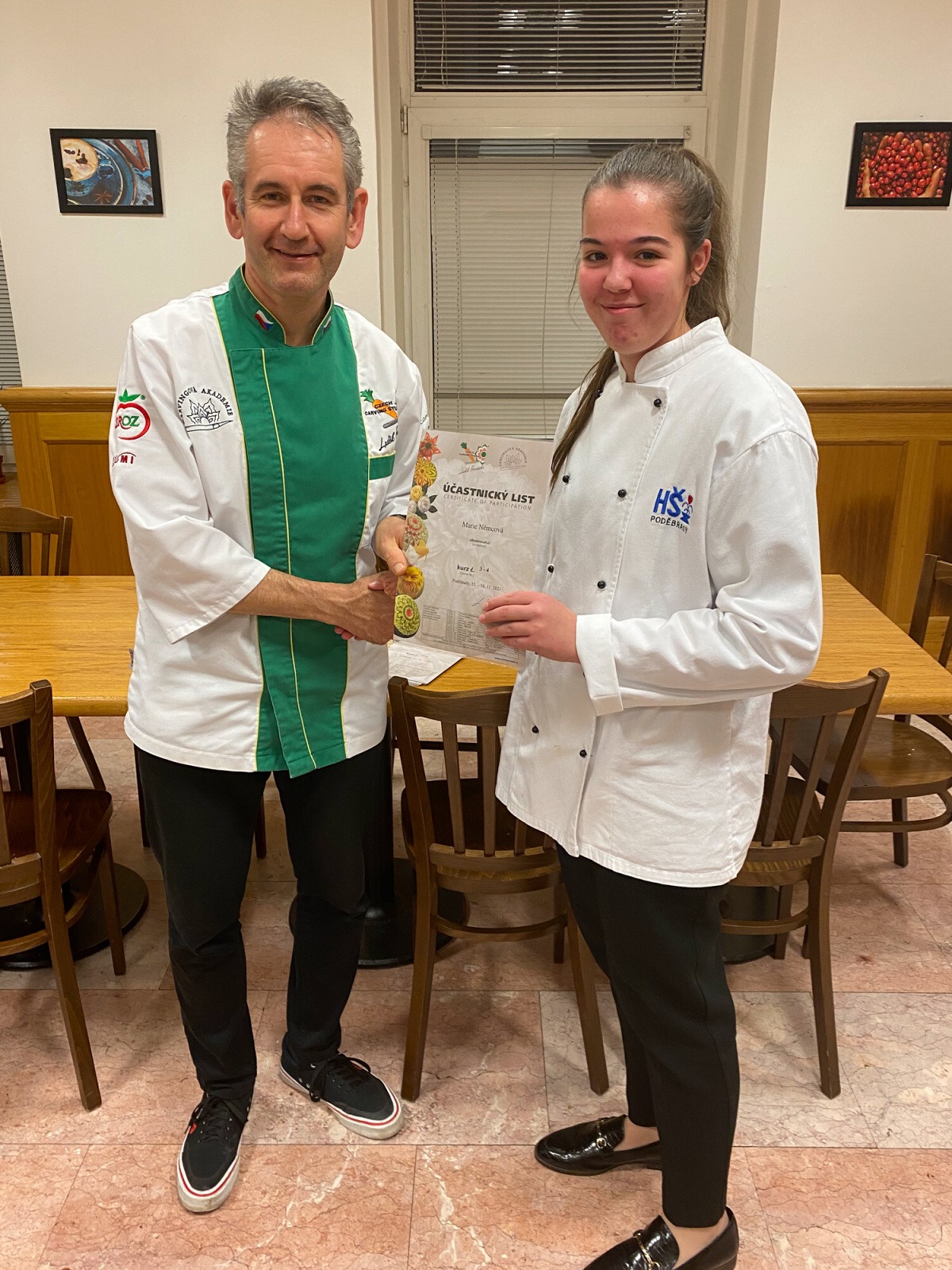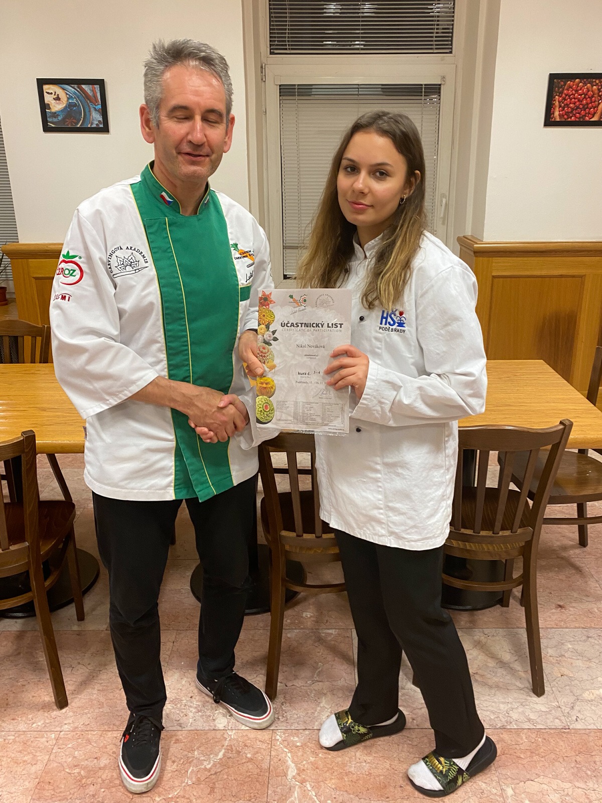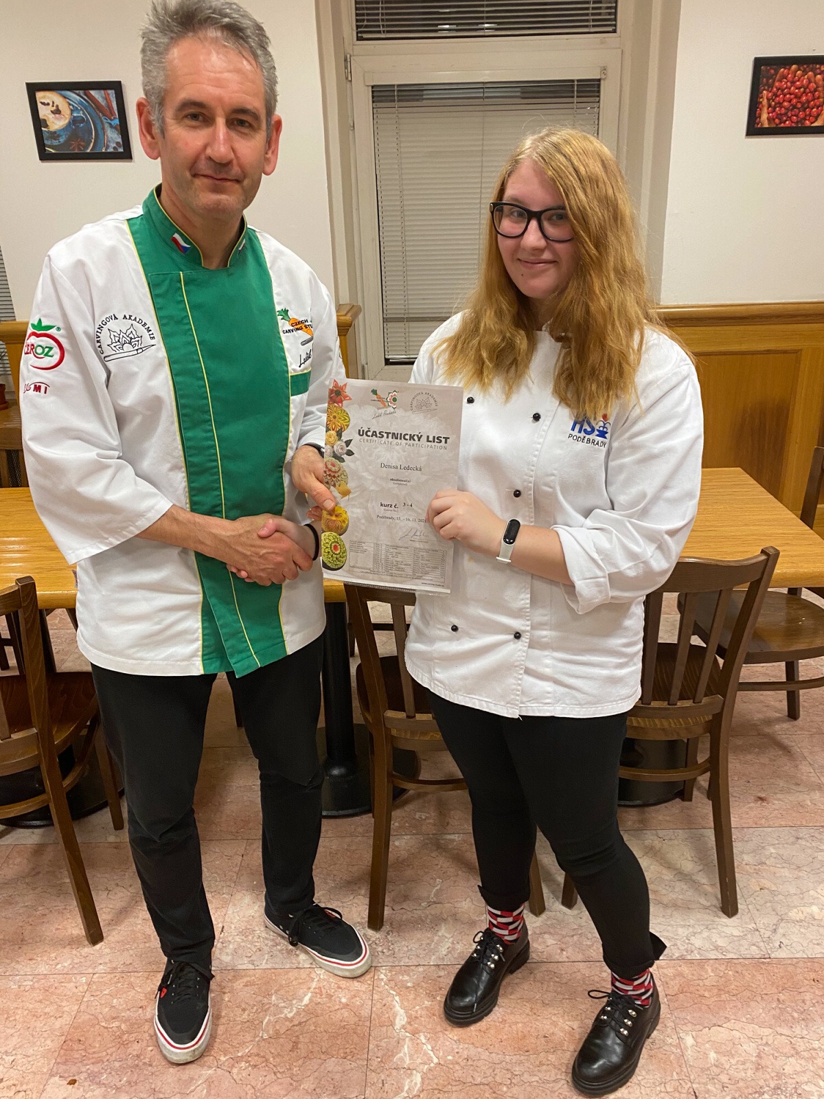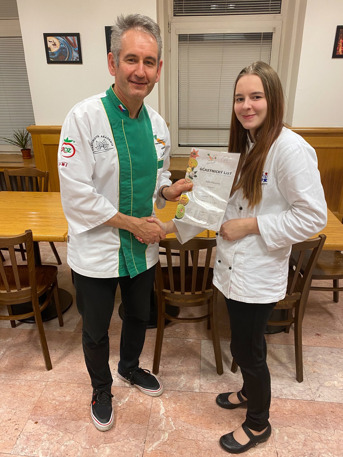 Na konci kurzu jsme soutěžili o to, kdo vyřeže za 45 minut nejhezčí jablko, vyfotili jsme se s našimi výrobky a obdrželi jsme certifikáty z kurzu.