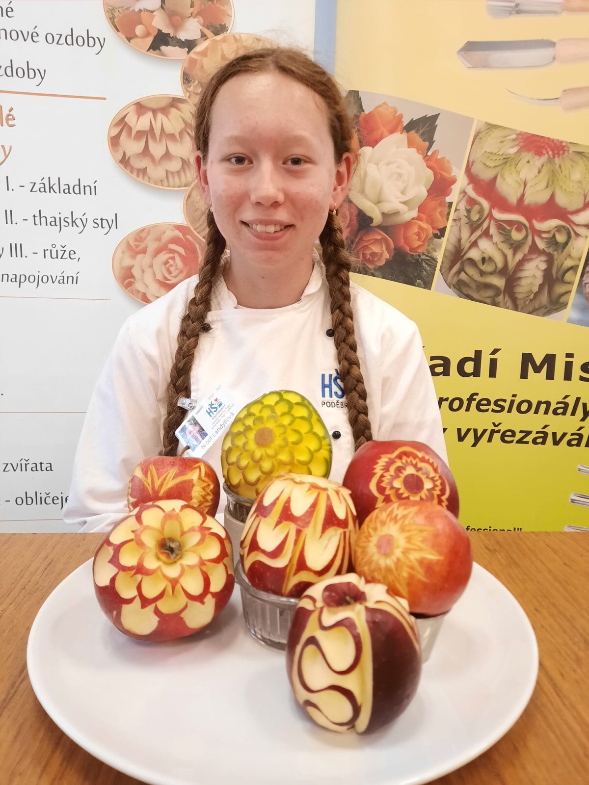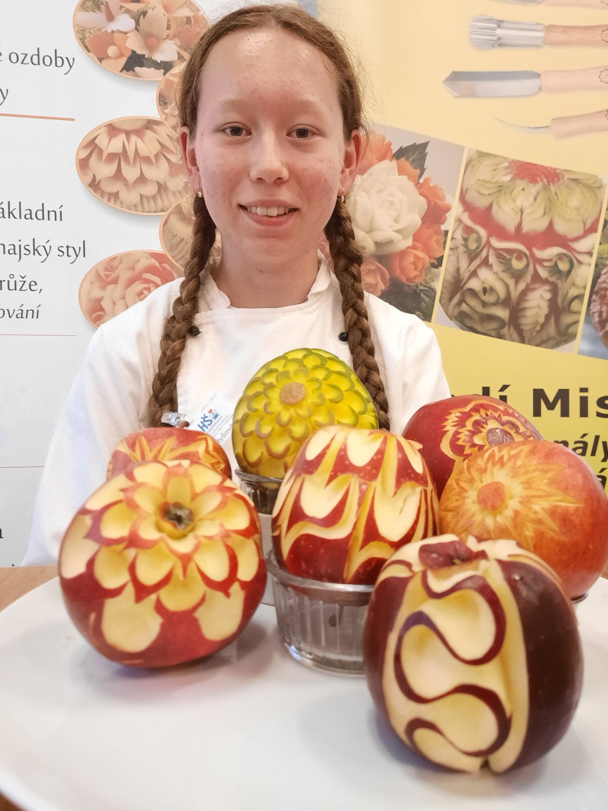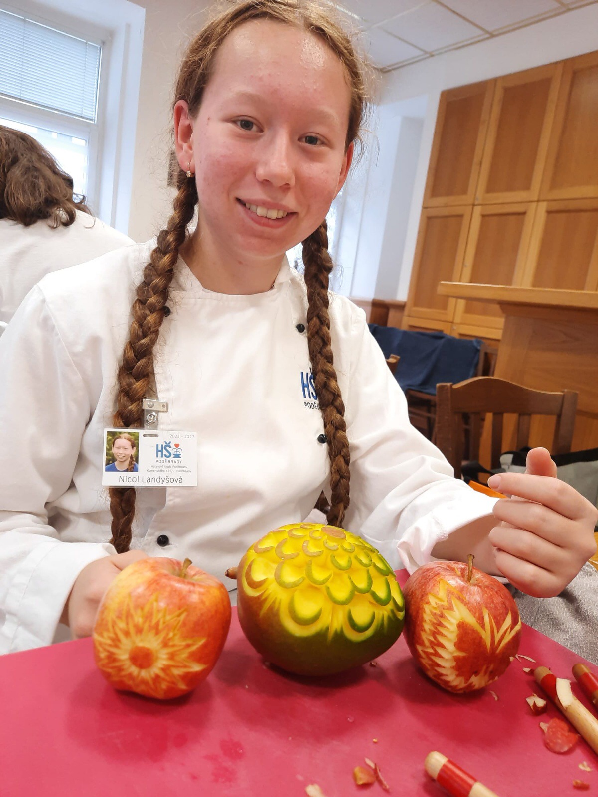 Druhý den jsme se sešli brzy ráno a začali jsme vyřezávat do ovoce. Naučili jsme se na jablkách různé řezy, pomocí dlátek jsme do manga udělali květinu a na konci kurzu si ukázali, jak se z červené řepy dá udělat růže.