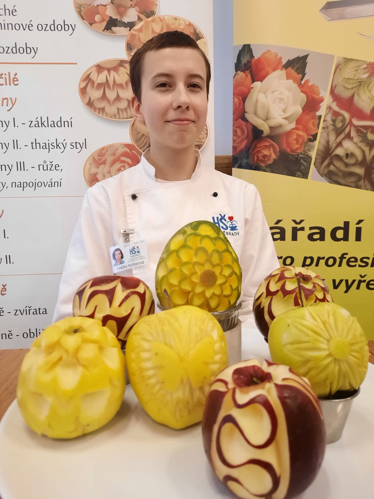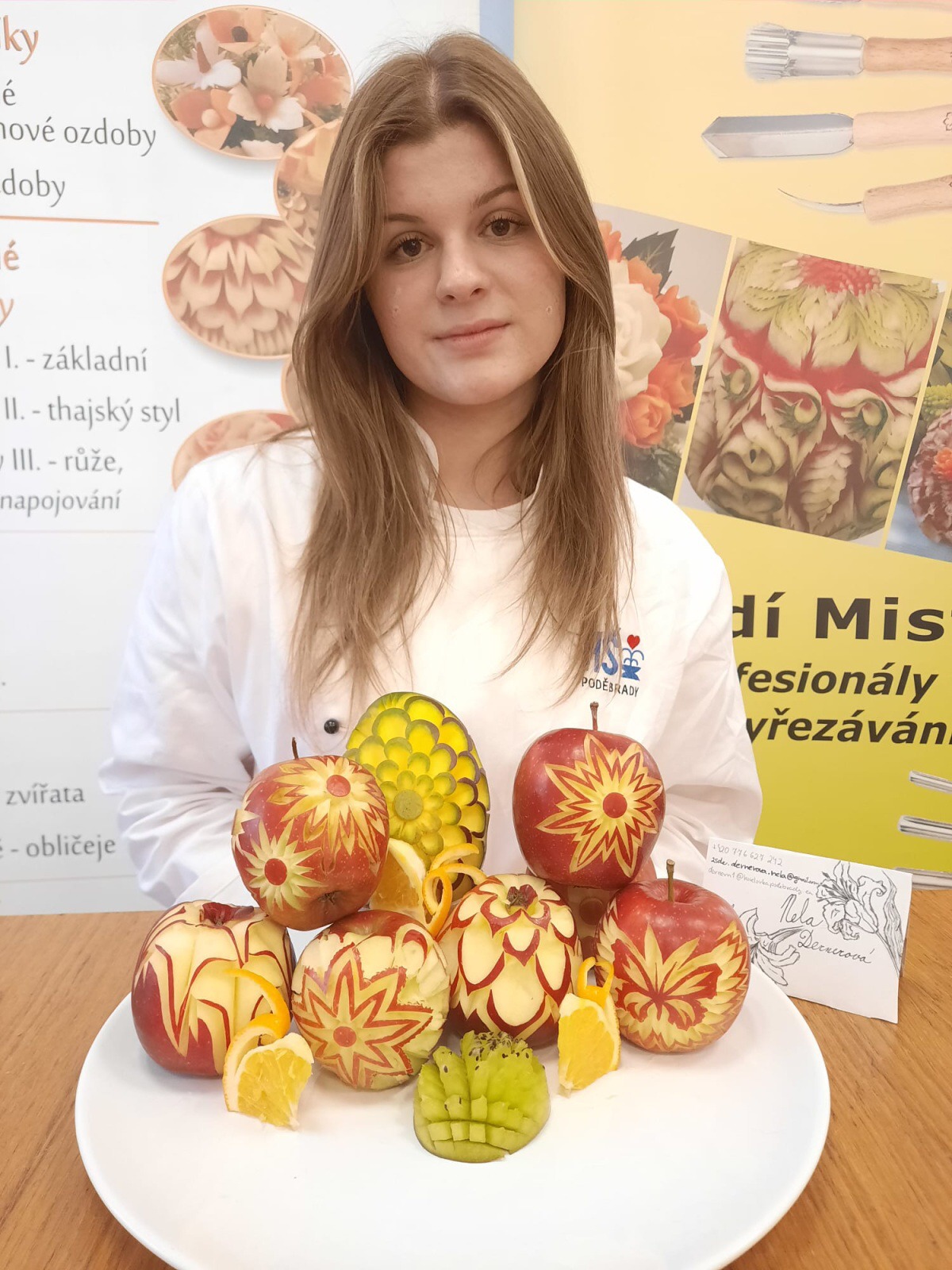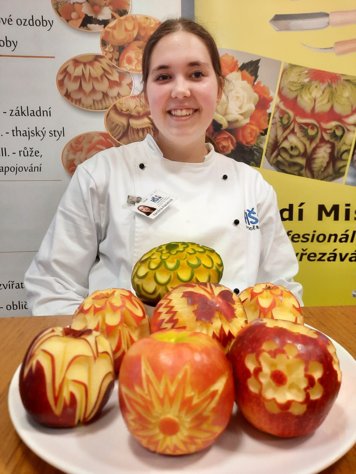 Druhý den jsme se sešli brzy ráno a začali jsme vyřezávat do ovoce. Naučili jsme se na jablkách různé řezy, pomocí dlátek jsme do manga udělali květinu a na konci kurzu si ukázali, jak se z červené řepy dá udělat růže.