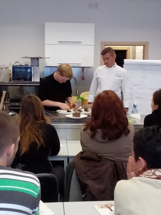 Za účast na soutěži CALLEBAUT CUP 2014 jsme dostali já, Gabriela Jirsáková, a Jakub Pospíšil pozvánku na prezentaci pod vedením technical advisor Marcina Pazdziora na téma Talířové dezerty, minidezerty a lehká vánoční inspirace, která se konala 8. 10. 2014 v Úvalech. Vydali jsme se na cestu. Na nádraží v Poděbradech jsme museli 10 min. čekat, protože vlak měl zpoždění. Pak jsme jeli do Kolína, kde jsme přestoupili do vlaku na Úvaly. Prezentace začínala v 10:00 hodin. Dostali jsme recepty na vše, co se vyrábělo. Viděli jsme, jak se dělá čokoládové suffle, mousse dessert, mousse dessert pomeranč a mousse z bílé čokolády. Poté následovala přestávka, během níž jsme mohli ochutnat 2 druhy makronek, zmrzliny a spoustu dalších sladkostí. Po přestávce přišly na řadu ovocné mousse - maliny, maracuja, glazé, kakaové glazé, crunch s čokoládovým mousse, ovocné želé a krém dezert. Na konci programu proběhla ochutnávka všech hotových výrobků a venku na nás čekalo grilování. Jsem ráda, že jsem se této prezentace mohla zúčastnit a získat užitečné informace o čokoládě a cukrářství.