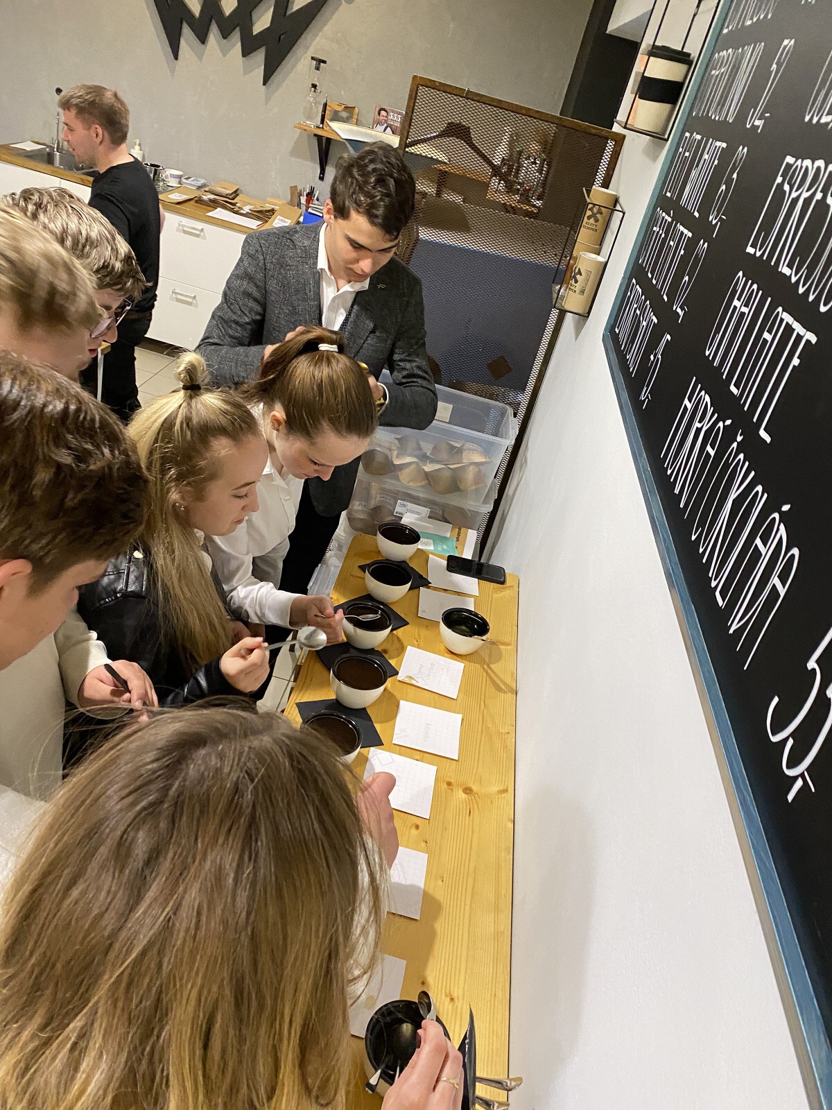 Po úvodní chvilce teorie – pěstování, sběru a základním dělení druhů kávy – nám ukázal, jakým způsobem se káva praží a jak zrna během pražení mění barvu. Dále jsme měli možnost vyzkoušet „Cupping“ čili degustaci kávy a zjistit, co nám nejlépe chutná. Porovnávali jsme tak vnímání chutí a vůní kávy, ochutnávali jsme různé druhy kávy (např. Brazílie, Cascara, Peru...).