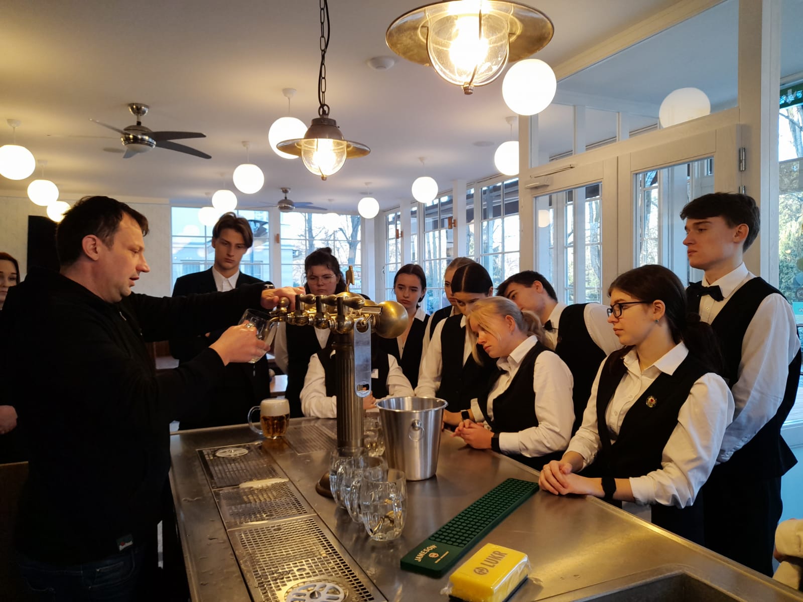 O týden později, 10. března, jsme navštívili restauraci Náš Hostinec. Zde jsme byli obeznámeni s místním provozem a s druhy čepování piva, ať už šlo o ty, které využívá tento podnik, nebo podniky ostatní. Ukázali jsme si, jak se naráží sud, v našem případě soudek od Plzeňského Prazdroje, naučili jsme se, jak připravit výčep a jak čepovat hladinku, šnyt a mlíko.