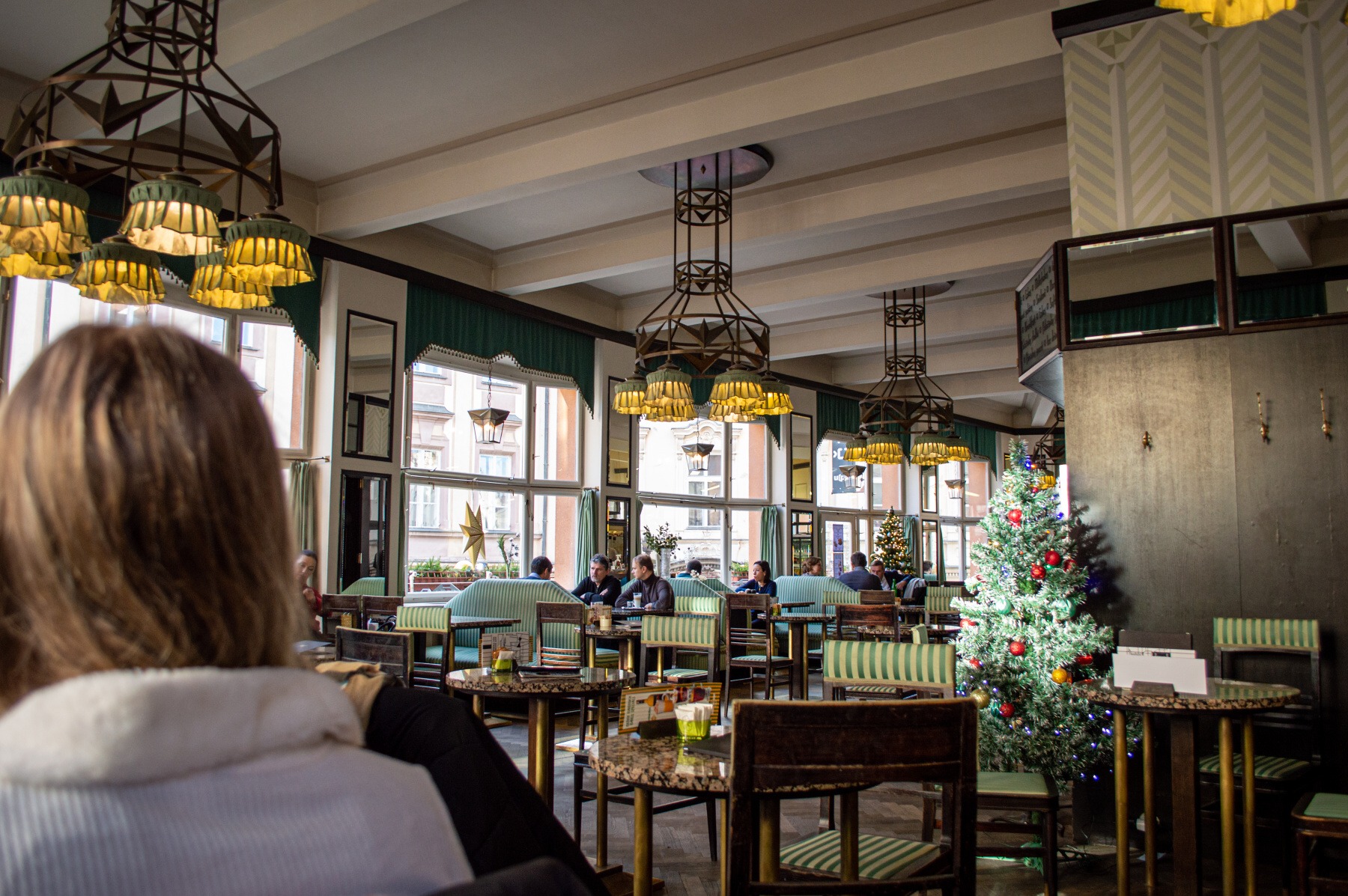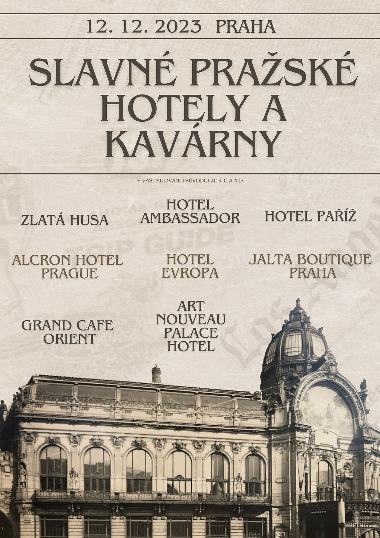 Naše exkurze oficiálně započala před historickou kavárnou Arco, která ve své době fungovala jako místo pro setkávání pražské smetánky. Naše další kroky vedly k Obecnímu domu. Tuto monumentální stavbu jsme již navštívili během prohlídky Královské cesty, tentokrát jsme se ale místo její historie zaměřili na její kavárnu. Zajímavostí je, že jsme během celé akce pozorovali ve všech kavárnách ceny kávy. Tady nás ale poměr cena/výkon moc neoslovil.