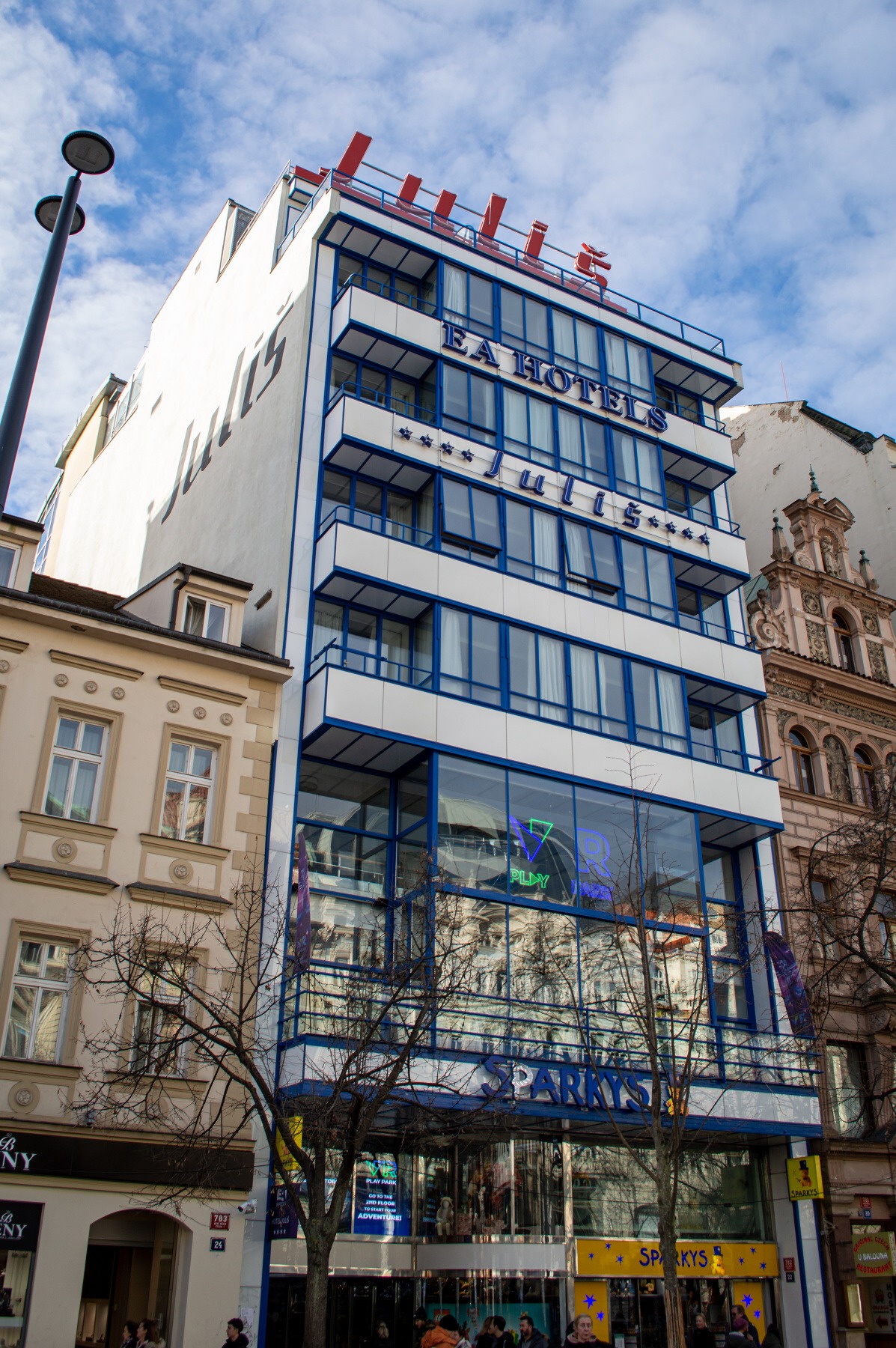 Od Obecního domu jsme se přesunuli k hotelu Paříž, kde jsme mohli na sebe prvorepublikovou atmosféru nechat přímo dýchnout, šli jsme se totiž podívat přímo dovnitř hotelu. Hned vedle se nacházel hotel Grand Bohemia, ze kterého je nyní luxusní pětihvězdičkový hotel. Poté následovala krátká pauza na kávu a kubistický věneček v domě U Černé Madony. Další klasicistní stavbou na trase bylo Stavovské divadlo, vedle kterého se nachází Karolinum.