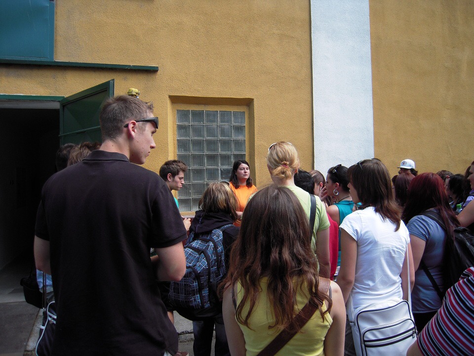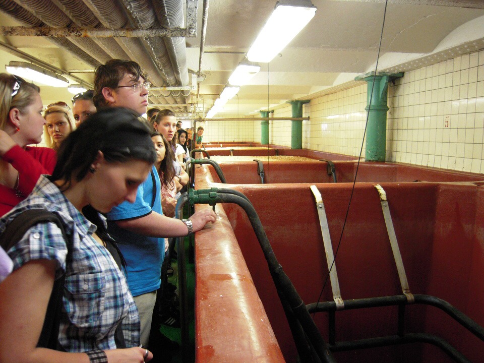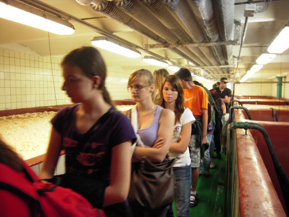 Konečně! Za mohutnými dveřmi se nám naskytl pohled do ležáckého sklepa. Tam proběhla také ochutnávka výborné kvasnicové dvanáctky. Naší čtrnáctičlenné skupině byly přiděleny 2 mázy piva. Pro nezasvěcené napovíme, že máz piva je doporučená dávka piva pro dospělého muže na dva dny. :-)