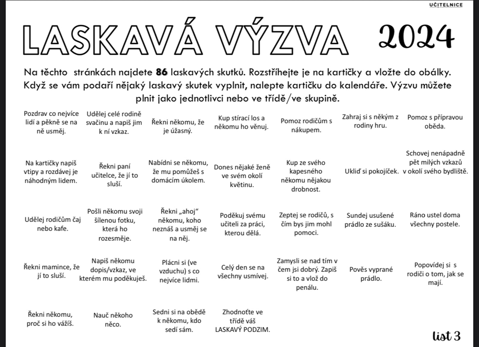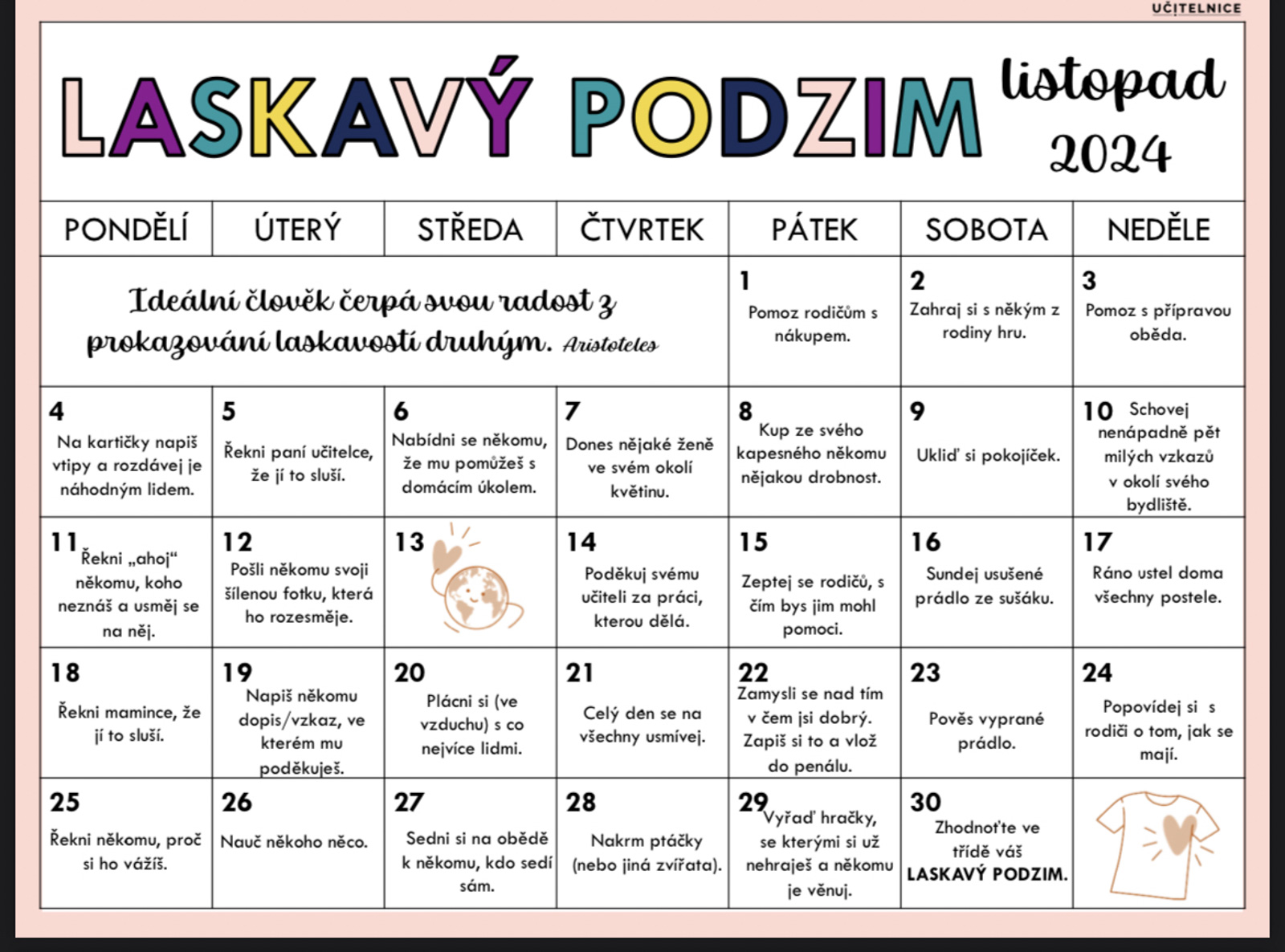 I tento rok se naše škola připojuje k celorepublikovému happeningu #jsemlaskavec, který oslavuje laskavost a dobré skutky. Naši Dofáci z 3.B se i v letošním roce aktivně zapojují, a to charitativním prodejem sladkého a slaného pečiva. Novinkou tohoto roku je Laskavý kalendář – originální způsob, jak se stát laskavcem. Každý den po celý podzim plníte různé úkoly, které mohou být buď náhodně vylosované, nebo předem určené, záleží jen na vás, jak se rozhodnete.