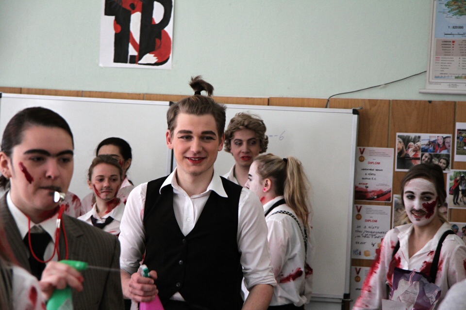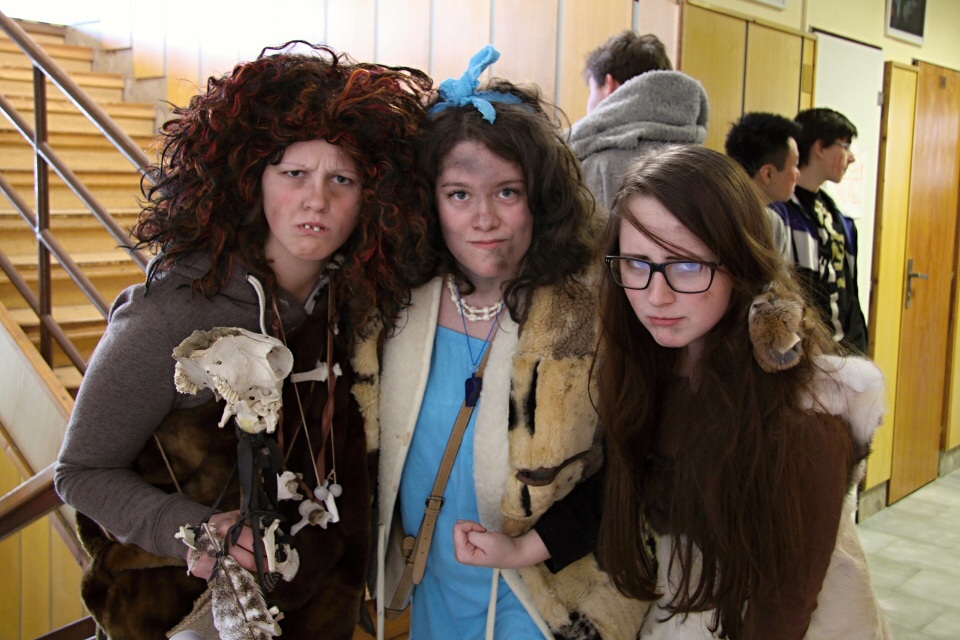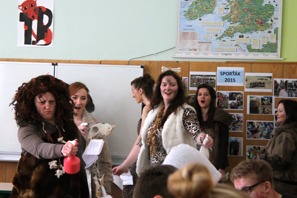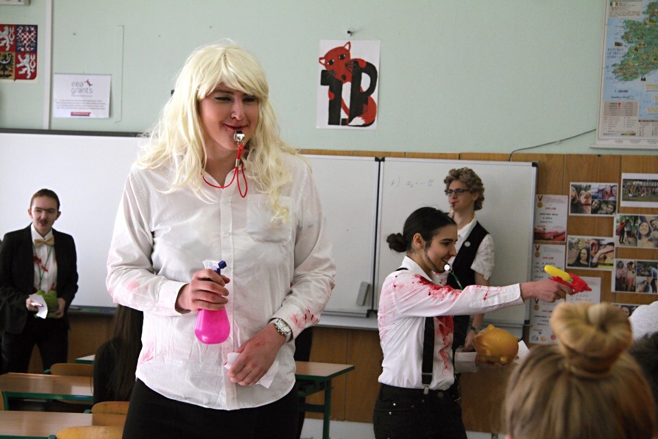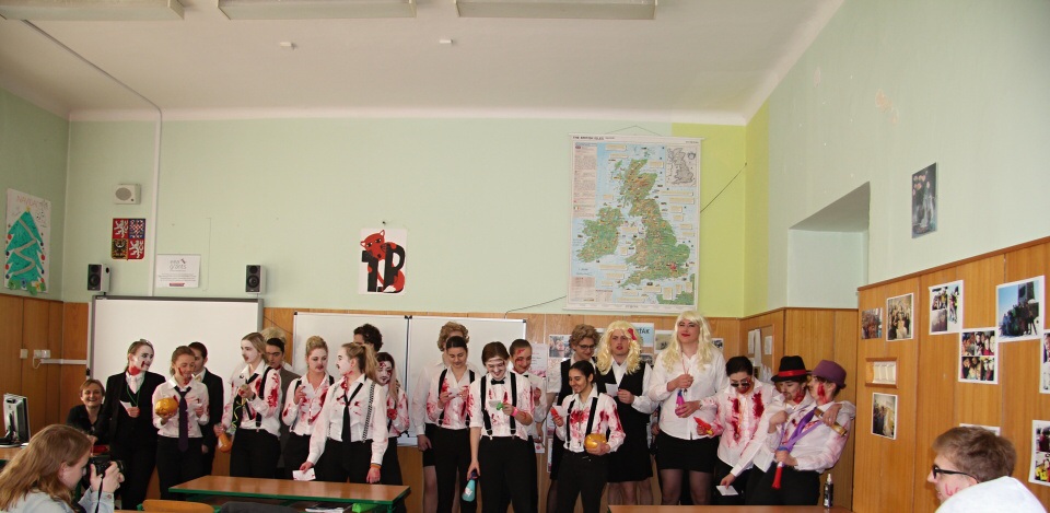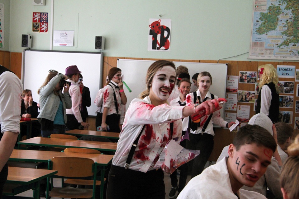 Celá škola se shromáždila před školou a mohly začít studentské oslavy, a to poděbradský Majáles, pořádaný studenty naší školy.