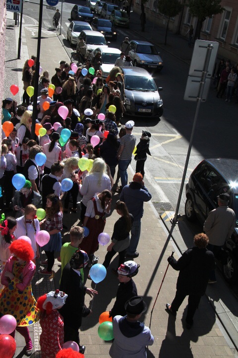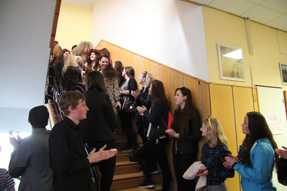 V deset hodin odstartovalo samotné poslední zvonění, maturanti šli průvodem po schodech ze 4. patra až do přízemí, kde na ně čekalo symbolické vykopnutí od paní ředitelky.