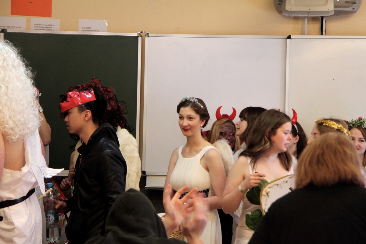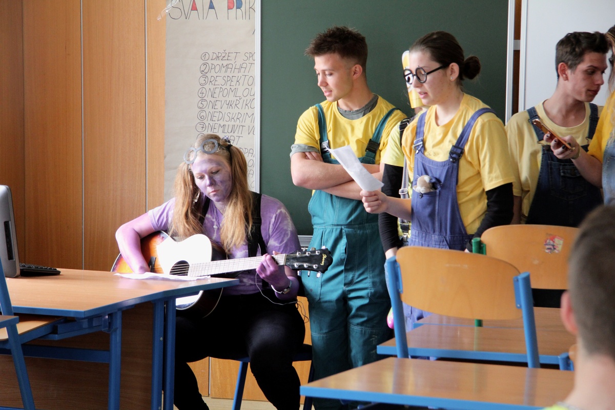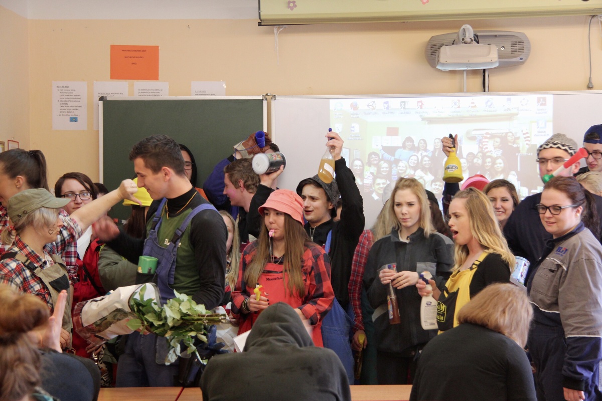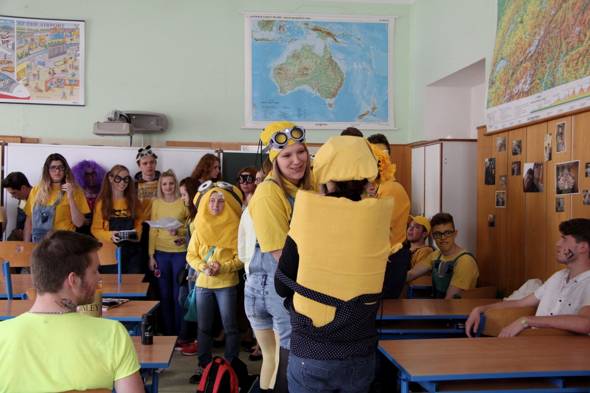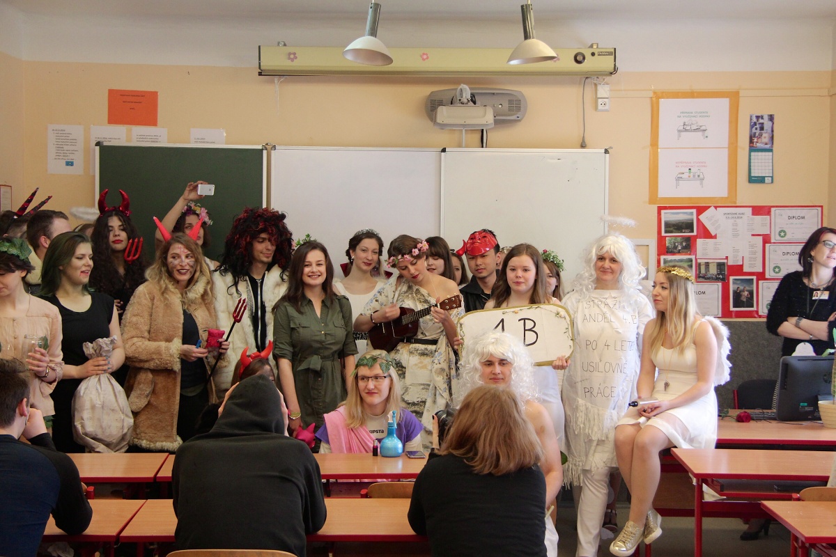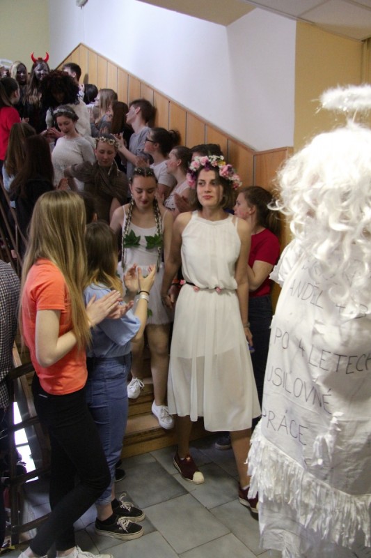 V pátek 28. dubna 2017 se uskutečnilo tradiční poslední zvonění. Vše začalo už ráno, kdy maturanti chodili po škole. Každá třída měla kostýmy podle svého. Mohli jsme vidět popeláře, mimoně a Nebe, peklo, ráj. Nechyběly ani písně, které si maturitní třídy pro ostatní připravily. Po 11. hodině se podél schodů vytvořil špalír a vykopávání mohlo začít. Paní ředitelka vybavena svými špičatými botami „vykopla“ všechny maturanty. Pokračovalo se na kolonádu, kde odstartovalo překvapení hotelovky, a to taneční Flash mob.