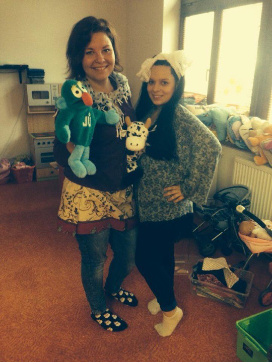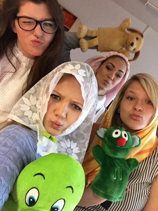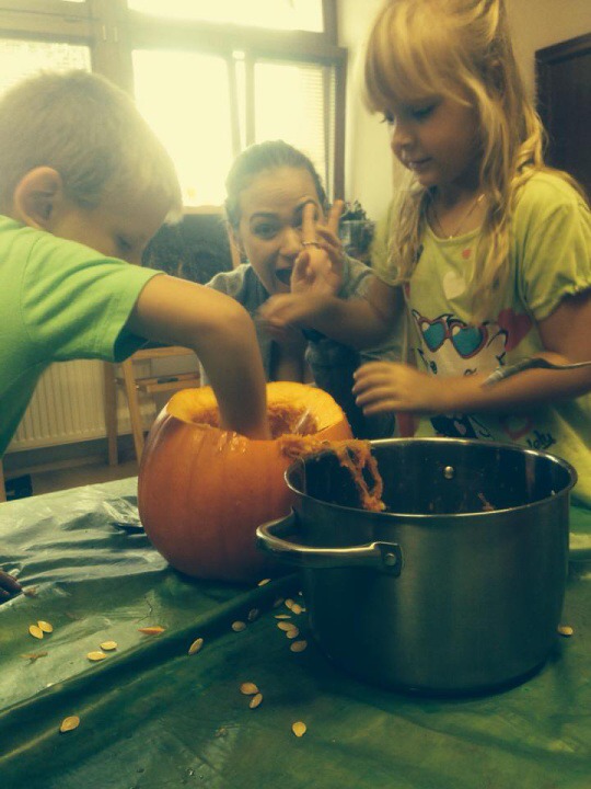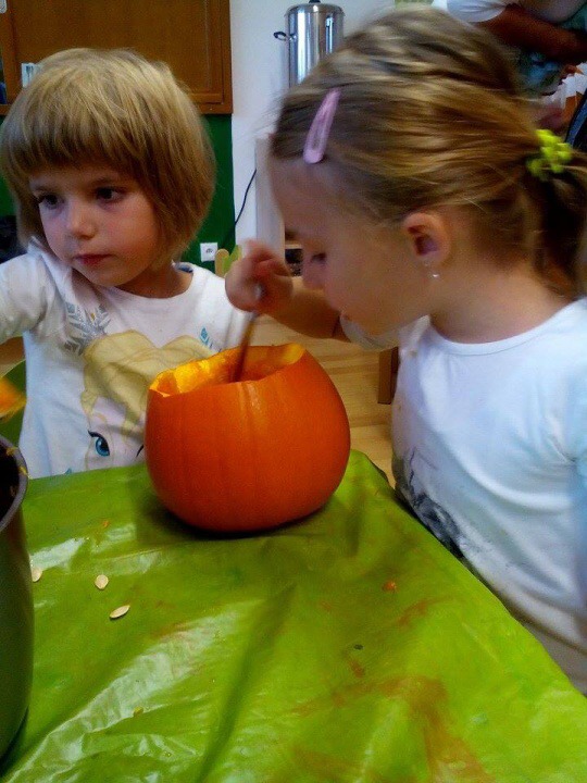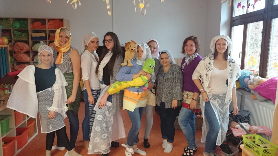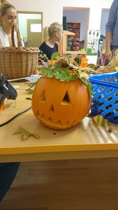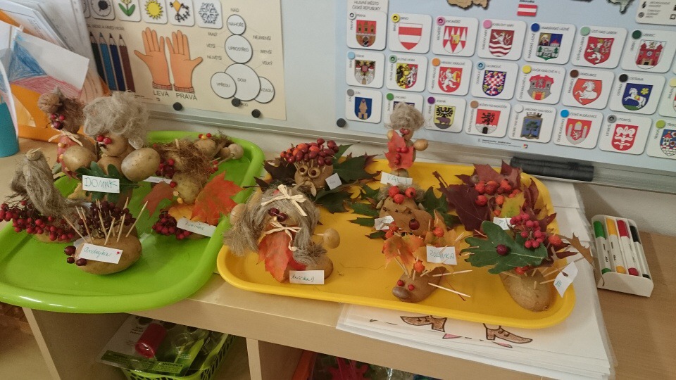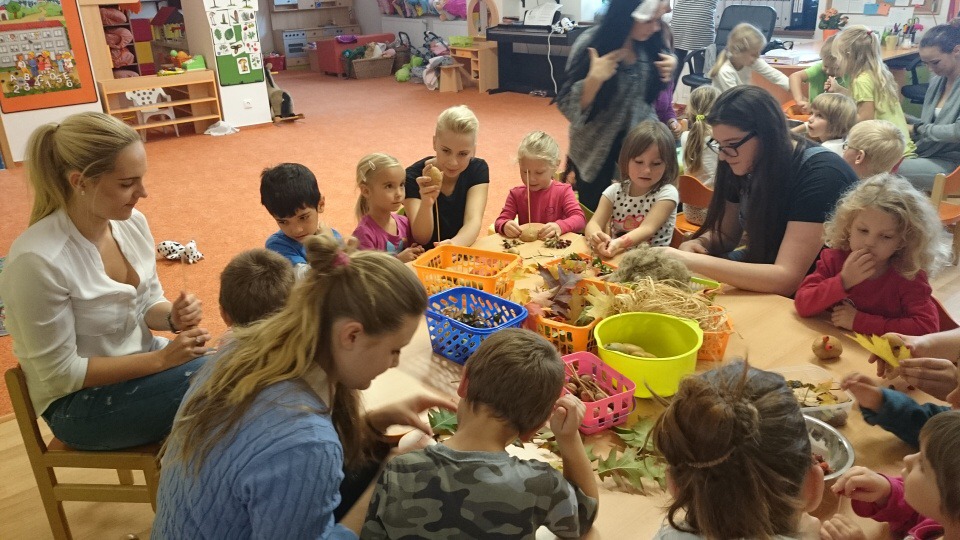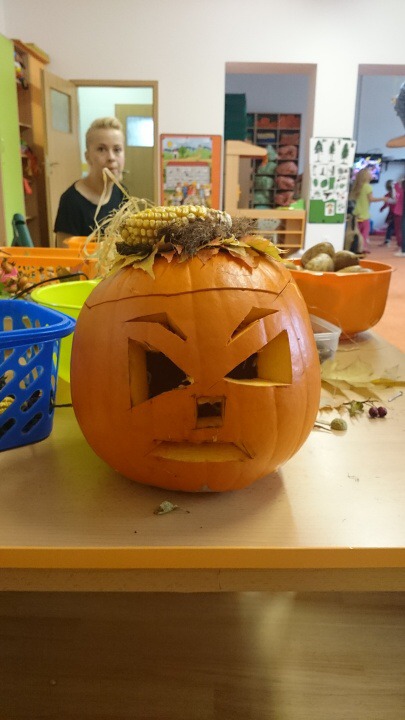 Hned při příchodu do školky jsme si s dětmi padly do oka. Po krátkém seznámení nás děti překvapily módní přehlídkou. Dále nás naučily jejich velmi oblíbenou hru jménem Padák. Podstata hry byla co nejrychleji si ve dvojici pod padákem vyměnit svá místa, což nás, paní učitelku Křivskou i děti hodně bavilo. Následovala tvořící hodinka, kdy jsme si spolu s dětmi vytvářely postavičky z brambor a přírodních materiálů a nechybělo také vyřezávání dýní. Abychom netrávily celý den ve školce, připravily jsme si pro děti hledání pokladu. I když nám počasí nepřálo, všichni z nalezeného pokladu měli obrovskou radost. Po návratu do školky nás čekalo milé překvapení v podobě dobrého oběda od paní kuchařky Jarušky. Jak už to ve školkách bývá, po obědě následuje zasloužilý odpočinek se čtením pohádky. Nečekaly jsme, že nás děti vyčerpají natolik, že jsme usnuly rychleji než ony.
