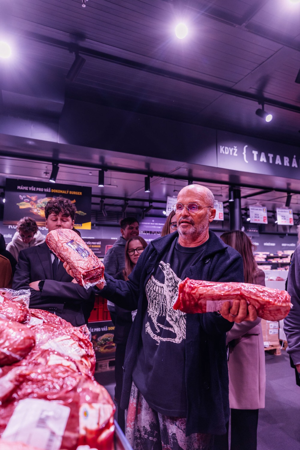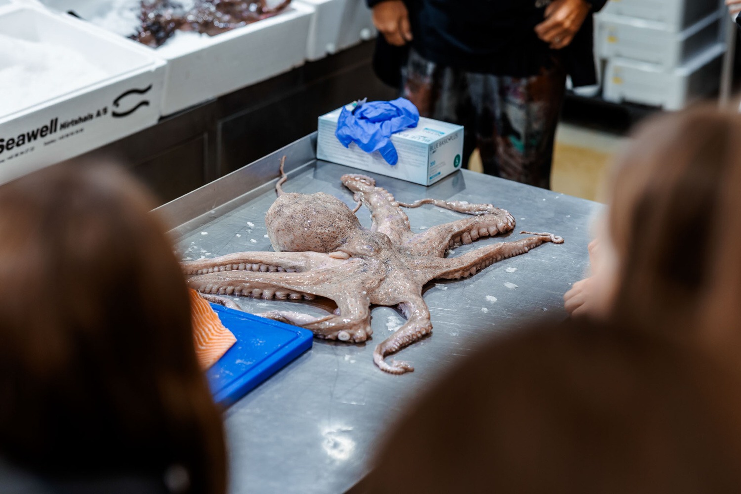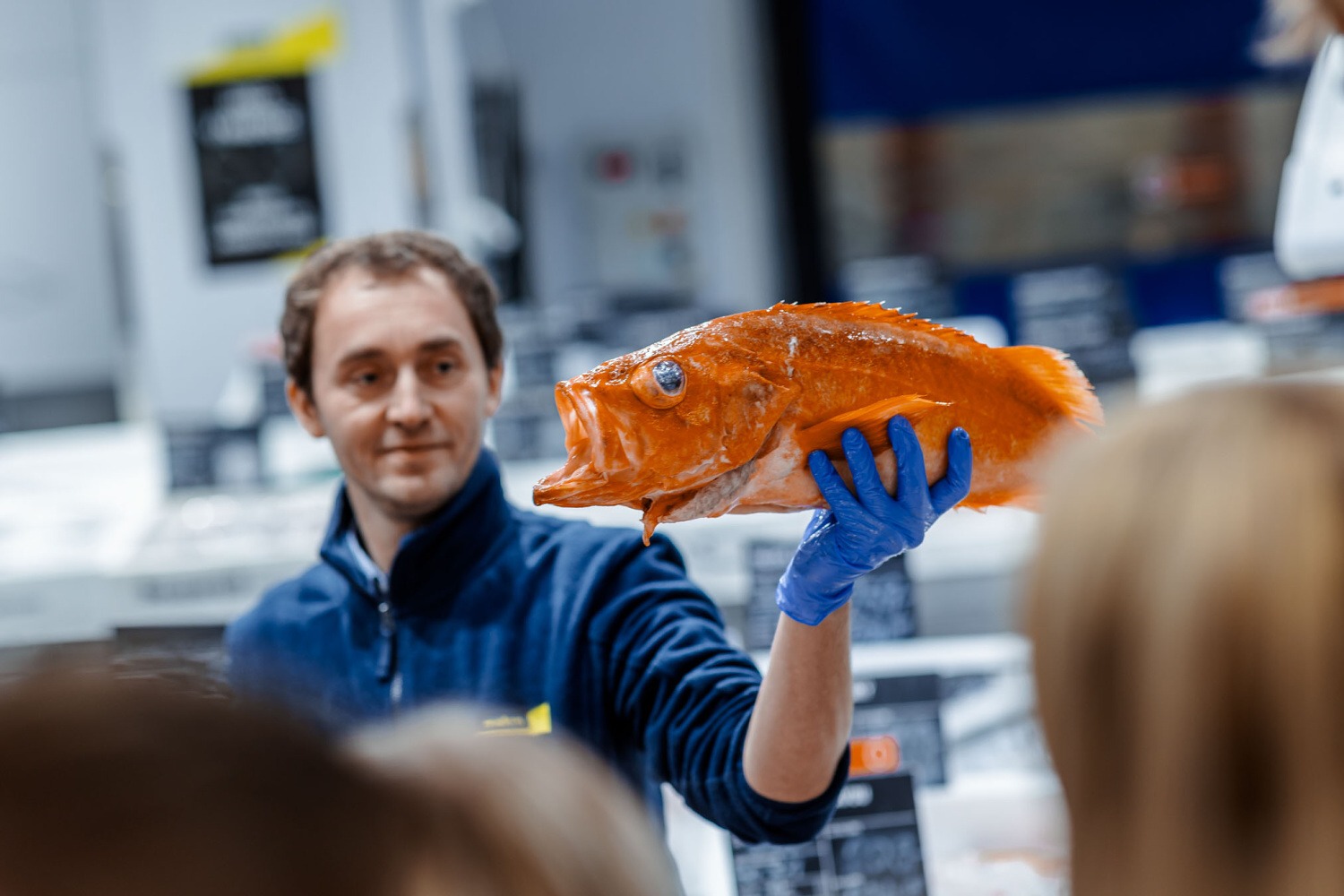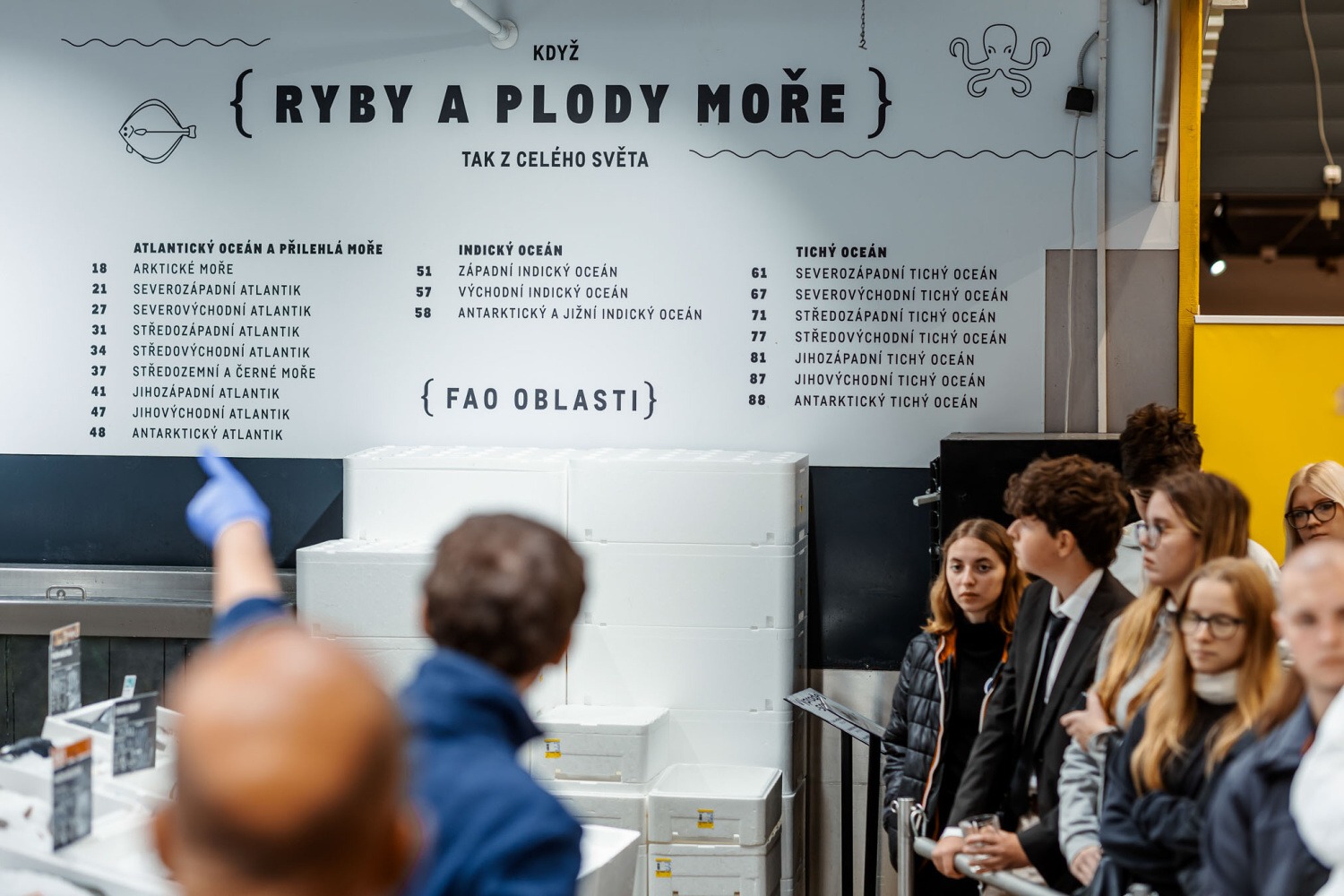 Následovala prohlídka prodejny Makro. Prošli jsme jednotlivé úseky: první s ovocem a zeleninou, kde jsme se dozvěděli zajímavosti o pěstování a dovozu různých druhů ovoce. Druhým úsekem byly ryby, kde na nás čekala ukázka porcování lososa, debata o mořských i říčních rybách a prohlédnutí chobotnice, krevet a dalších mořských plodů. Třetím úsekem byl mrazící box s masem, kde jsme mohli najít vše, na co si vzpomeneme, od líček až po kýtu. Když už nám všem byla opravdu zima, došli jsme k sekci s dochucovadly a podle složení na etiketách jsme porovnávali kvalitu produktů ostatních značek s produkty značky Makro. Posledním úsekem na prodejně bylo povídání o spotřebičích a restauračním inventáři vhodném pro gastronomické provozovny.
