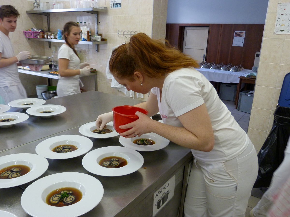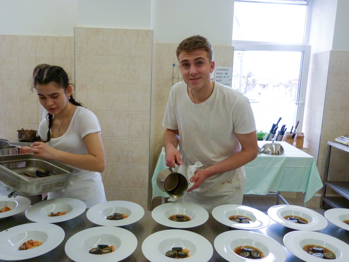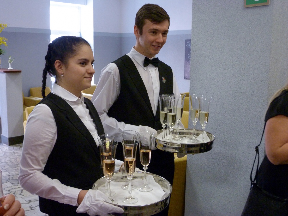 Ve čtvrtek obsluhovala 1. skupina. Téměř od rána probíhaly finální úpravy tabule a nacvičování obsluhy. Když rodiče po 14. hodině dorazili, u vchodu jsme je přivítali welcome-drinkem. Poté už si mohli užívat slavnostní atmosféru a naše slavnostní menu. Jako předkrm se podával jarní řez s hráškovou a květákovou pěnou s washabi a špenátovým želé. Následovalo hovězí consommé se sépiovou palačinkou a glazovanou zeleninou. Hlavním chodem bylo kuřecí supreme s černou čočkou, kořenovou zeleninou, omáčkou z pečených paprik a rozmarýnovým demi - glace. Jako sladkou tečku jsme servírovali brownie s pěnou z mléčné čokolády, s malinami a banánem, čokoládovou omáčkou a mango salátkem. Na závěr přišlo poděkování všem vedoucím, rodičům, ale i učitelům, což se neobešlo i bez slz štěstí a radosti. V pátek jsme si role vyměnili, a tak obsluhovala 2. skupina.