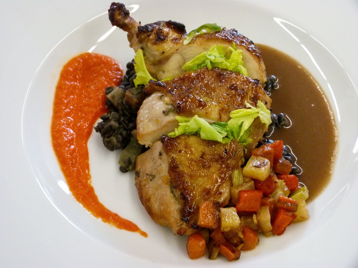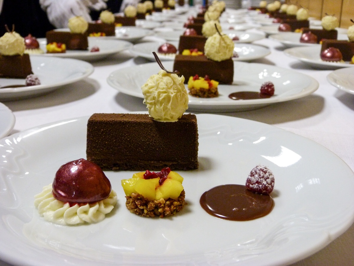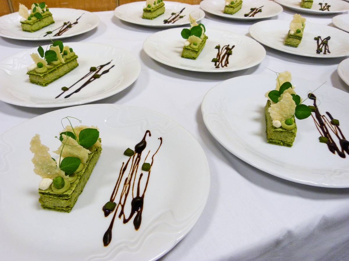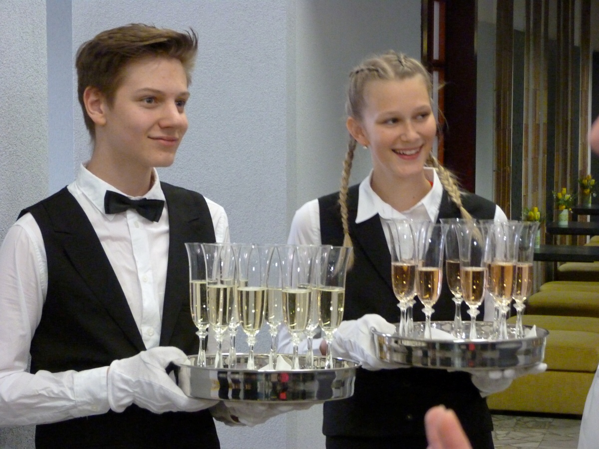 Ve čtvrtek obsluhovala 1. skupina. Téměř od rána probíhaly finální úpravy tabule a nacvičování obsluhy. Když rodiče po 14. hodině dorazili, u vchodu jsme je přivítali welcome-drinkem. Poté už si mohli užívat slavnostní atmosféru a naše slavnostní menu. Jako předkrm se podával jarní řez s hráškovou a květákovou pěnou s washabi a špenátovým želé. Následovalo hovězí consommé se sépiovou palačinkou a glazovanou zeleninou. Hlavním chodem bylo kuřecí supreme s černou čočkou, kořenovou zeleninou, omáčkou z pečených paprik a rozmarýnovým demi - glace. Jako sladkou tečku jsme servírovali brownie s pěnou z mléčné čokolády, s malinami a banánem, čokoládovou omáčkou a mango salátkem. Na závěr přišlo poděkování všem vedoucím, rodičům, ale i učitelům, což se neobešlo i bez slz štěstí a radosti. V pátek jsme si role vyměnili, a tak obsluhovala 2. skupina.