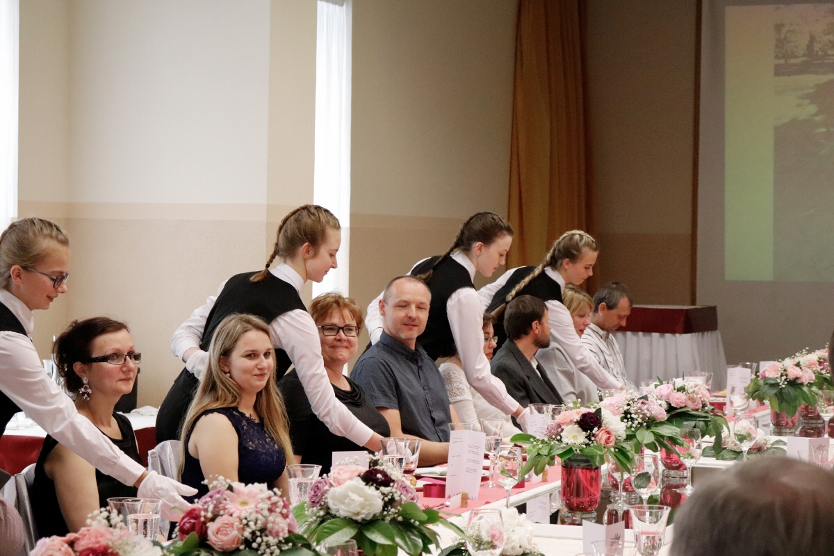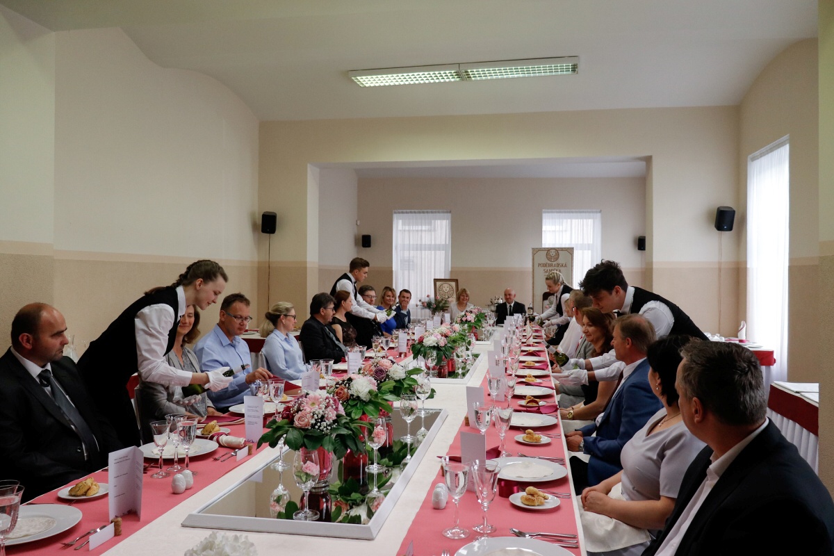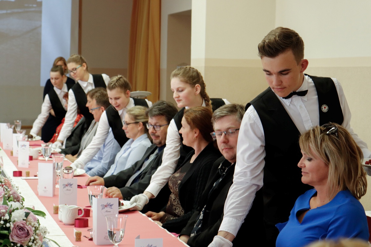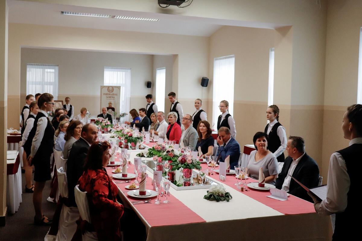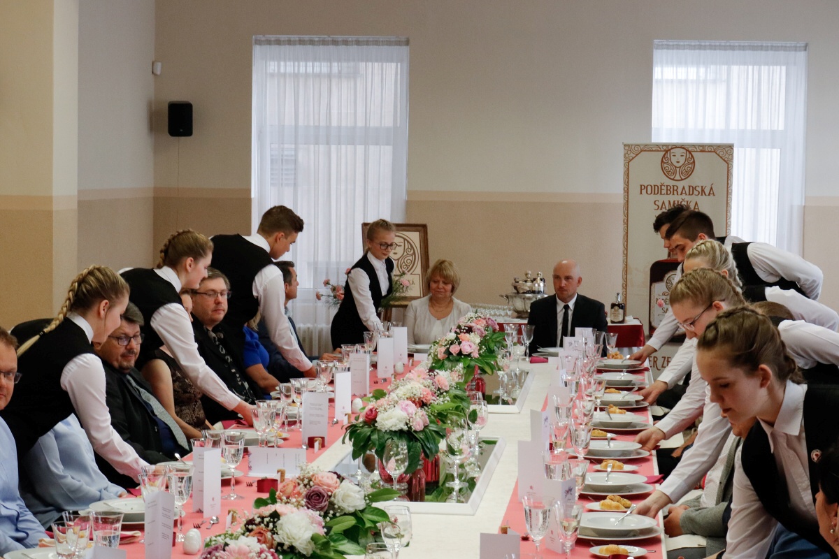 Od čtvrtečního rána jsme byli v jednom kole. První skupina připravovala tabuli, vázala mašle na židlích a dolaďovala veškeré detaily. Druhá skupina pilně pracovala v kuchyni, aby všechny pokrmy byly perfektní. Ve dvě hodiny přijeli naši hosté a my je přivítali welcome drinkem. Poté jsme je odvedli na jejich místo u slavnostní tabule a banket mohl začít.