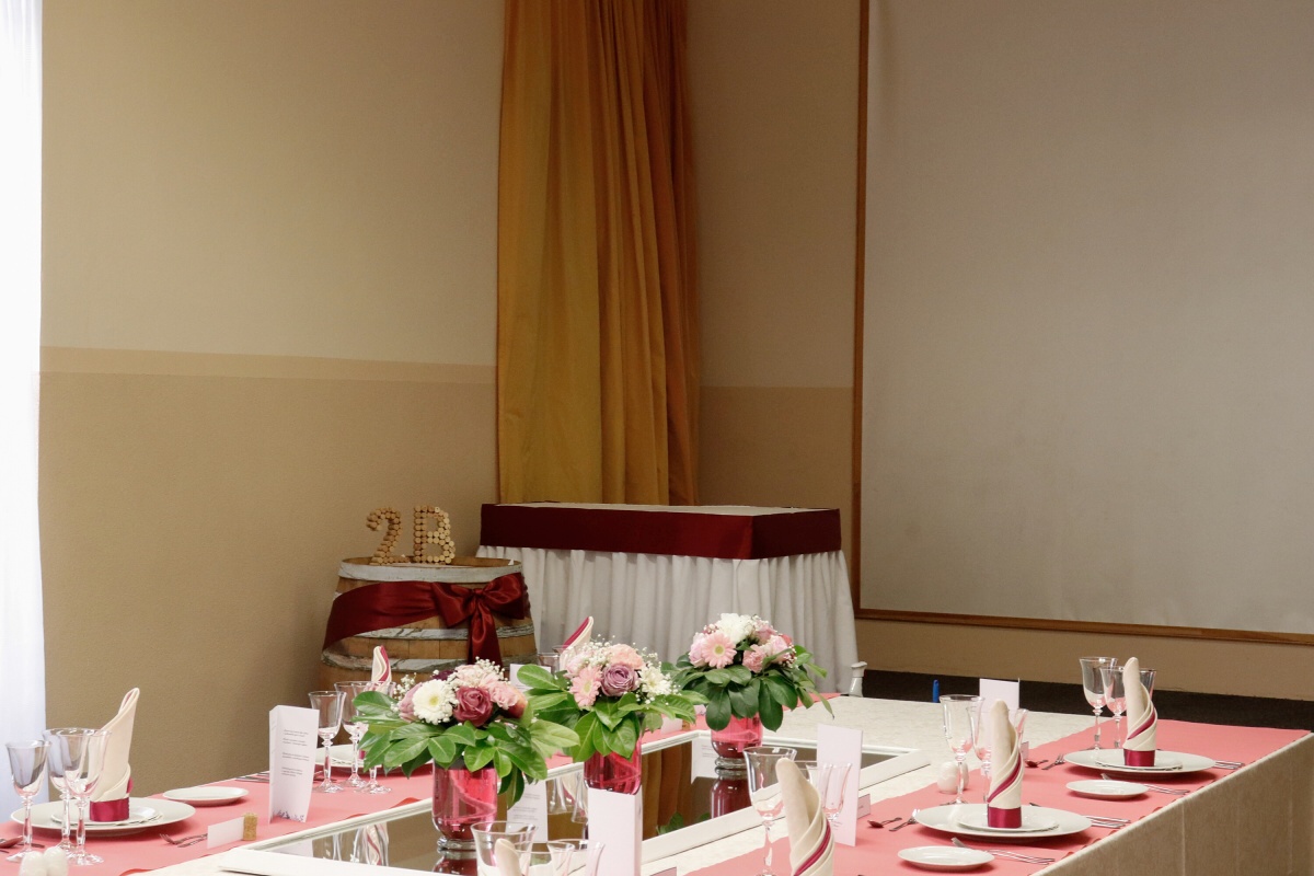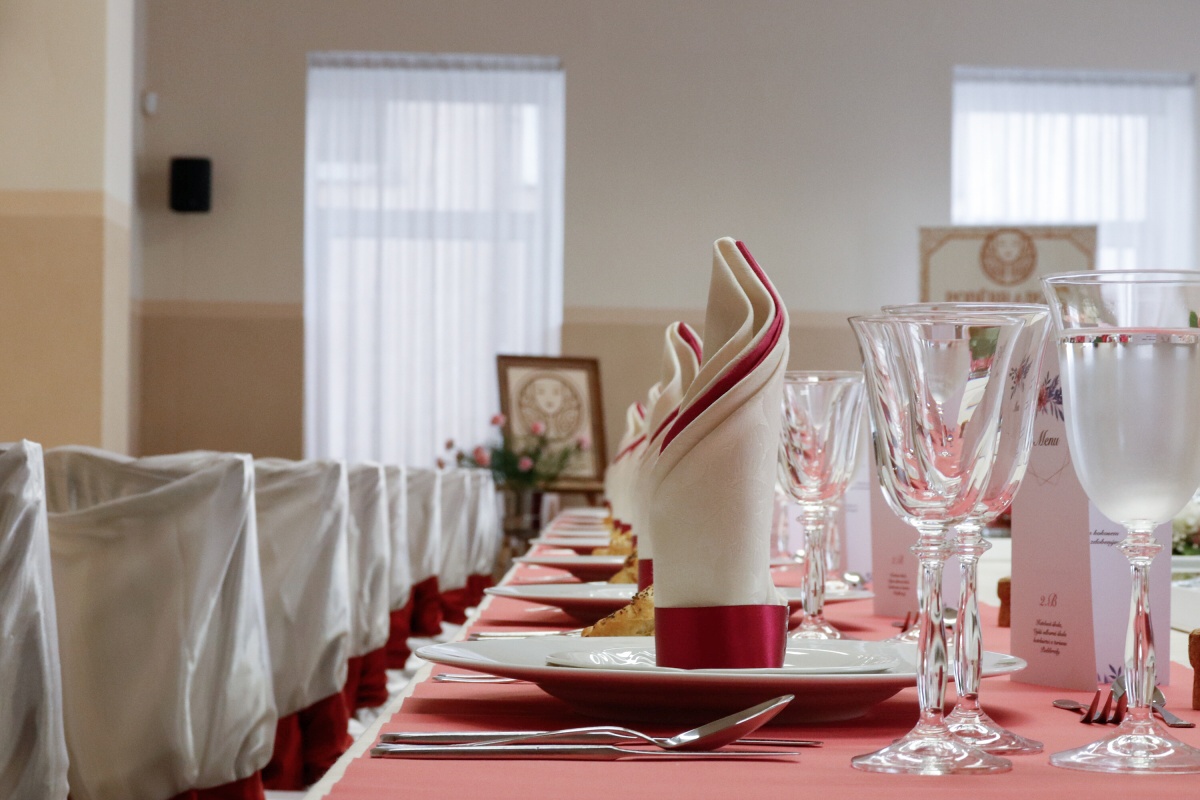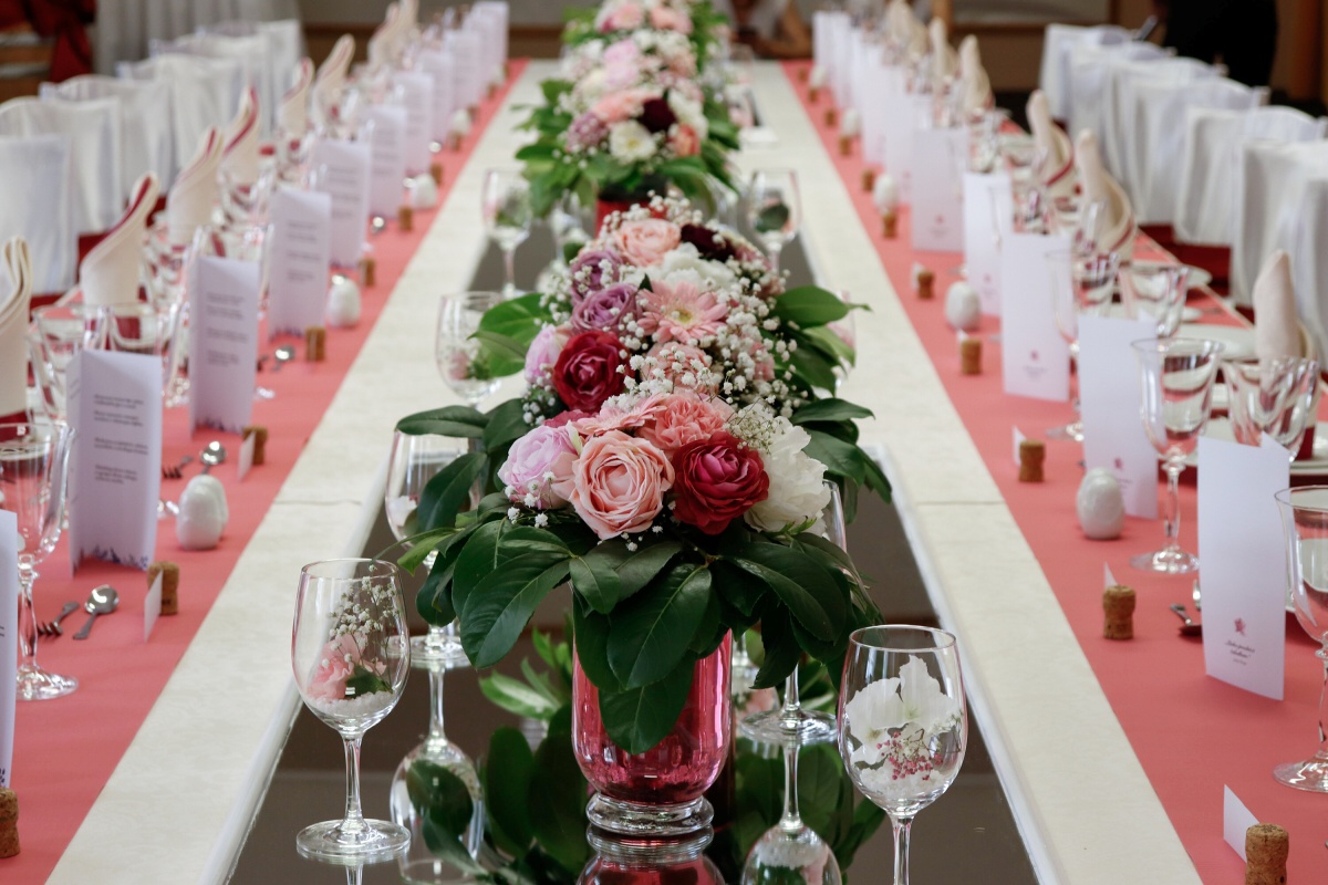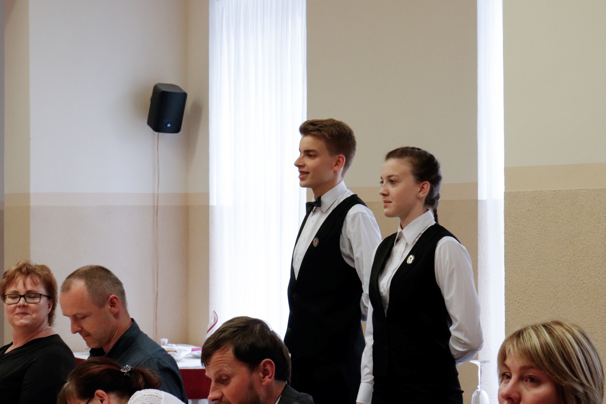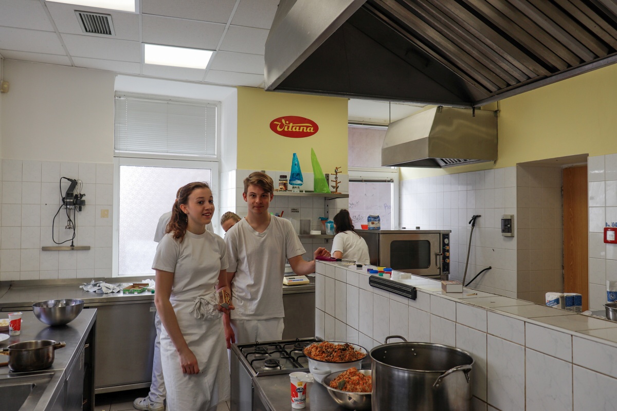 Od čtvrtečního rána jsme byli v jednom kole. První skupina připravovala tabuli, vázala mašle na židlích a dolaďovala veškeré detaily. Druhá skupina pilně pracovala v kuchyni, aby všechny pokrmy byly perfektní. Ve dvě hodiny přijeli naši hosté a my je přivítali welcome drinkem. Poté jsme je odvedli na jejich místo u slavnostní tabule a banket mohl začít.