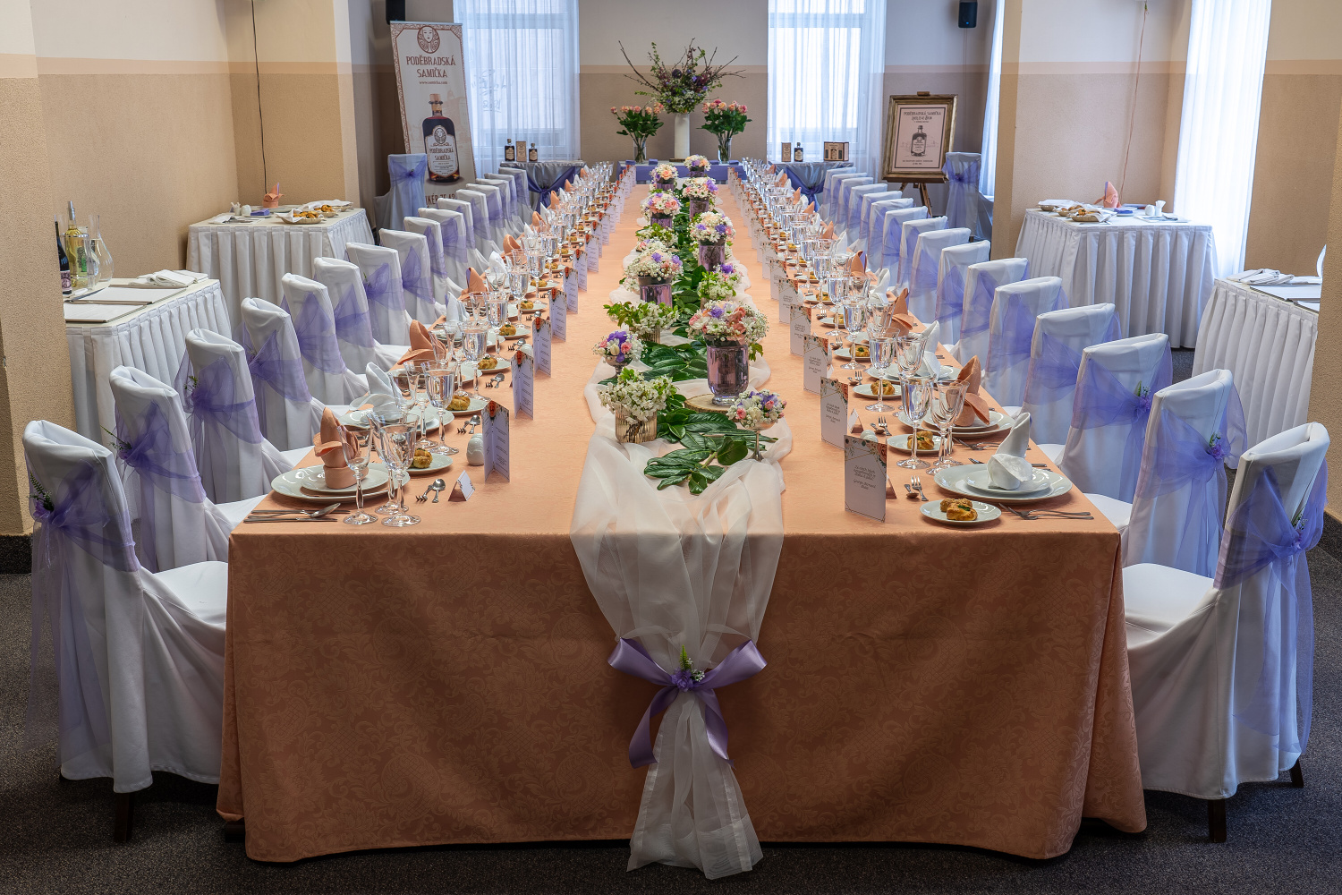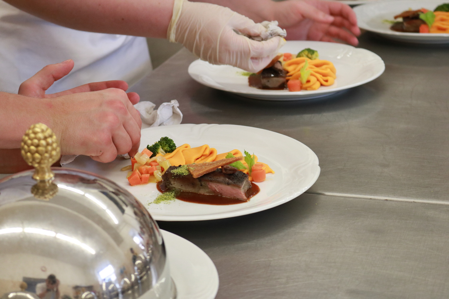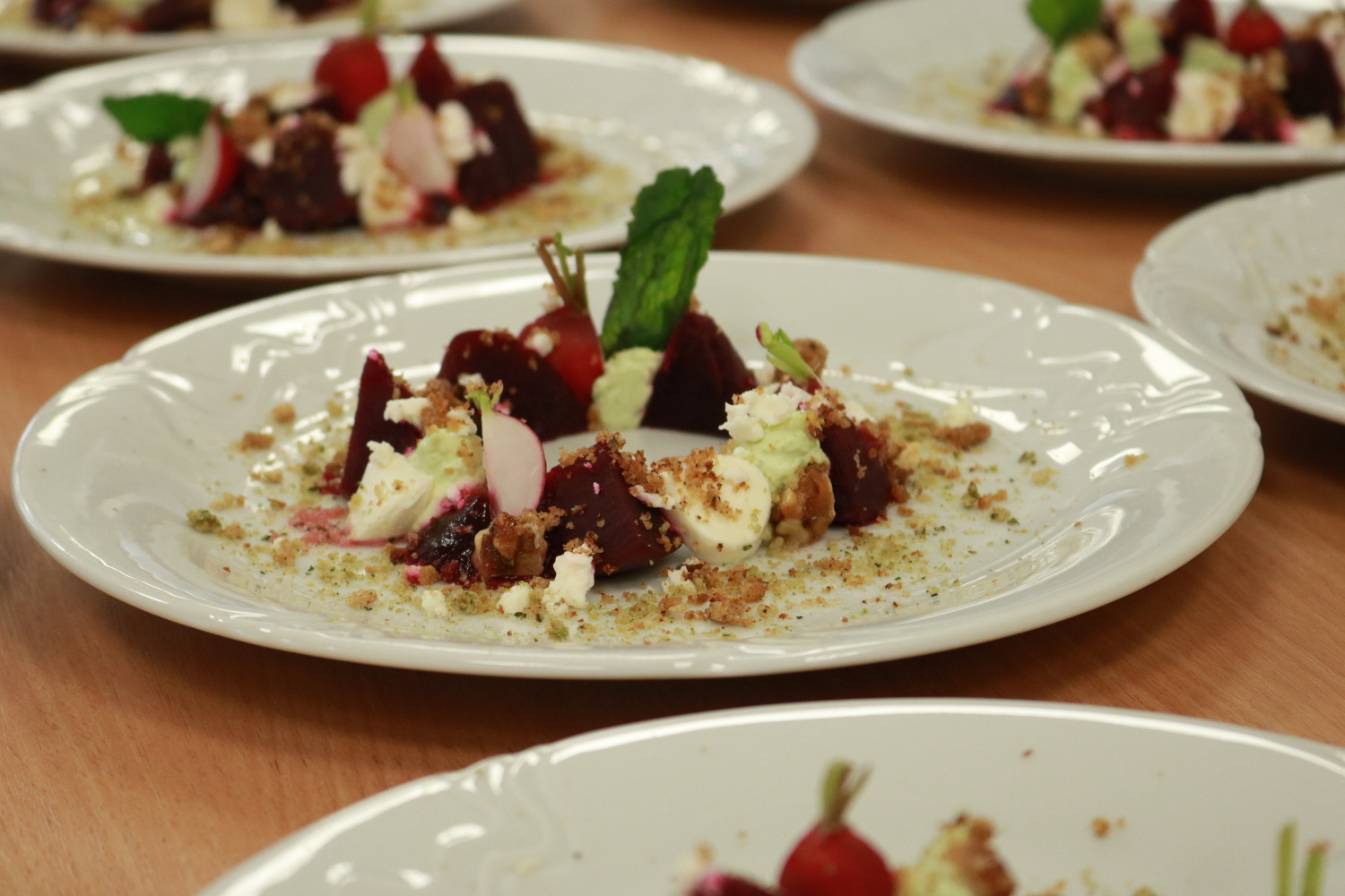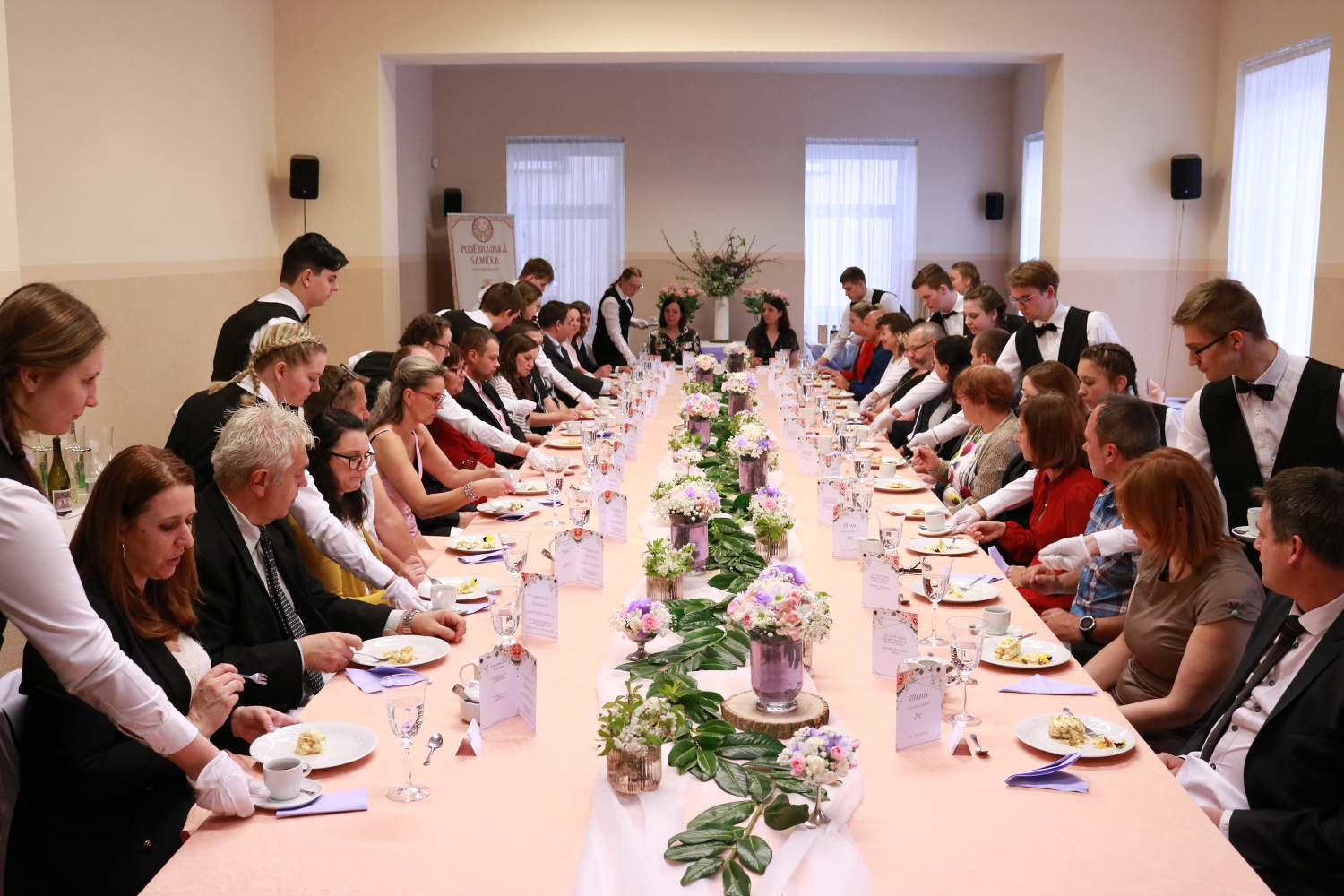 Jako předkrm jsme podávali marinovanou řepu s feta sýrem, ředkvičkami, wasabi pěnou a karamelizovanými ořechy. Dále následovala polévka – hráškový krém s mátou, pošírovaným křepelčím vejcem a slaninou. K polévce a předkrmu se servírovaly dva druhy banketního pečiva – s rozmarýnem a s česnekem. Jako hlavní chod jsme rodičům připravili kachní prso sous vide s batátovým pyré, zeleninou a omáčkou z portského vína. A jako sladkou tečku na konec jsme podávali rozložený štrúdl s vanilkovým krémem, meruňkové compoté a anglický krém s ořechovým likérem. Během banketu bylo hostům naléváno víno z vinařství Klučov a k dezertu dostali šálek kávy z Amáres coffee.
