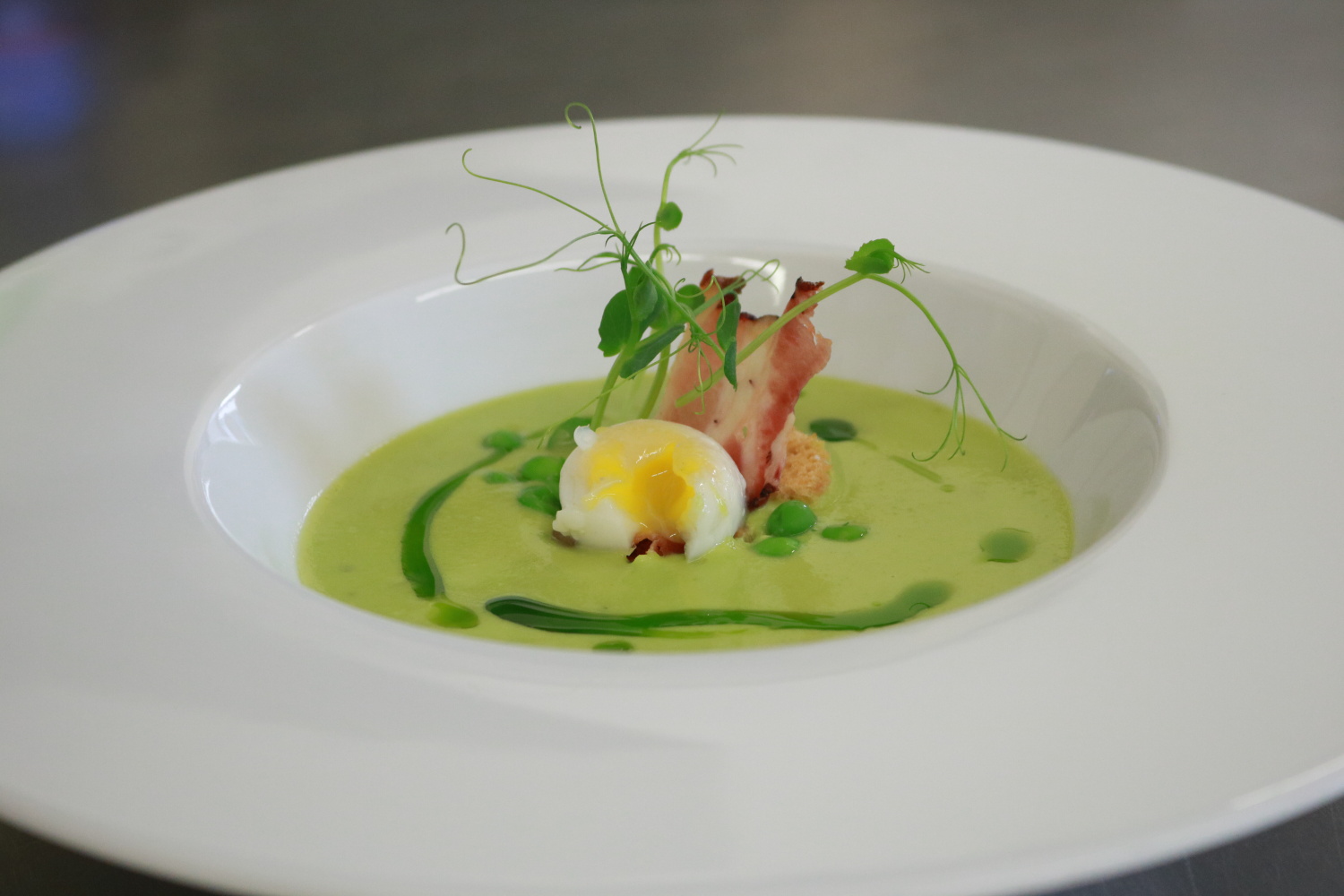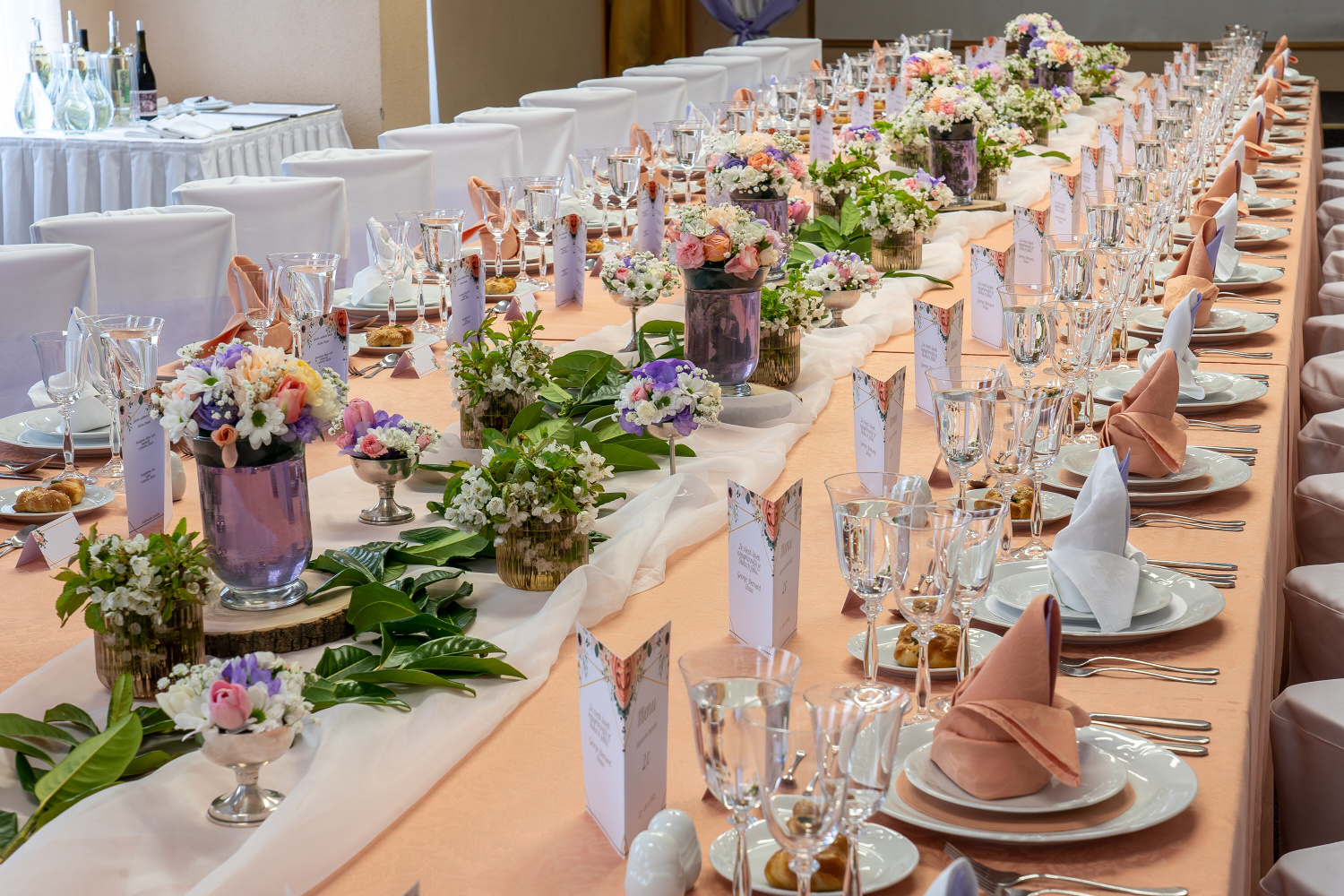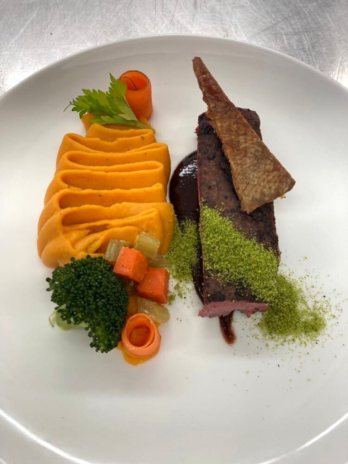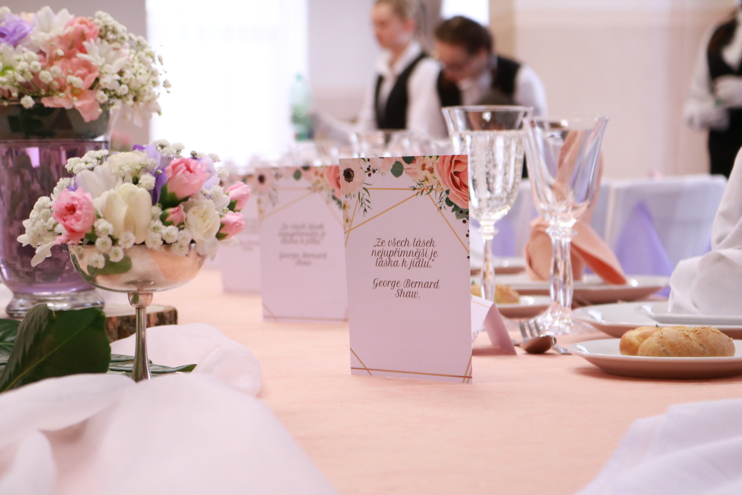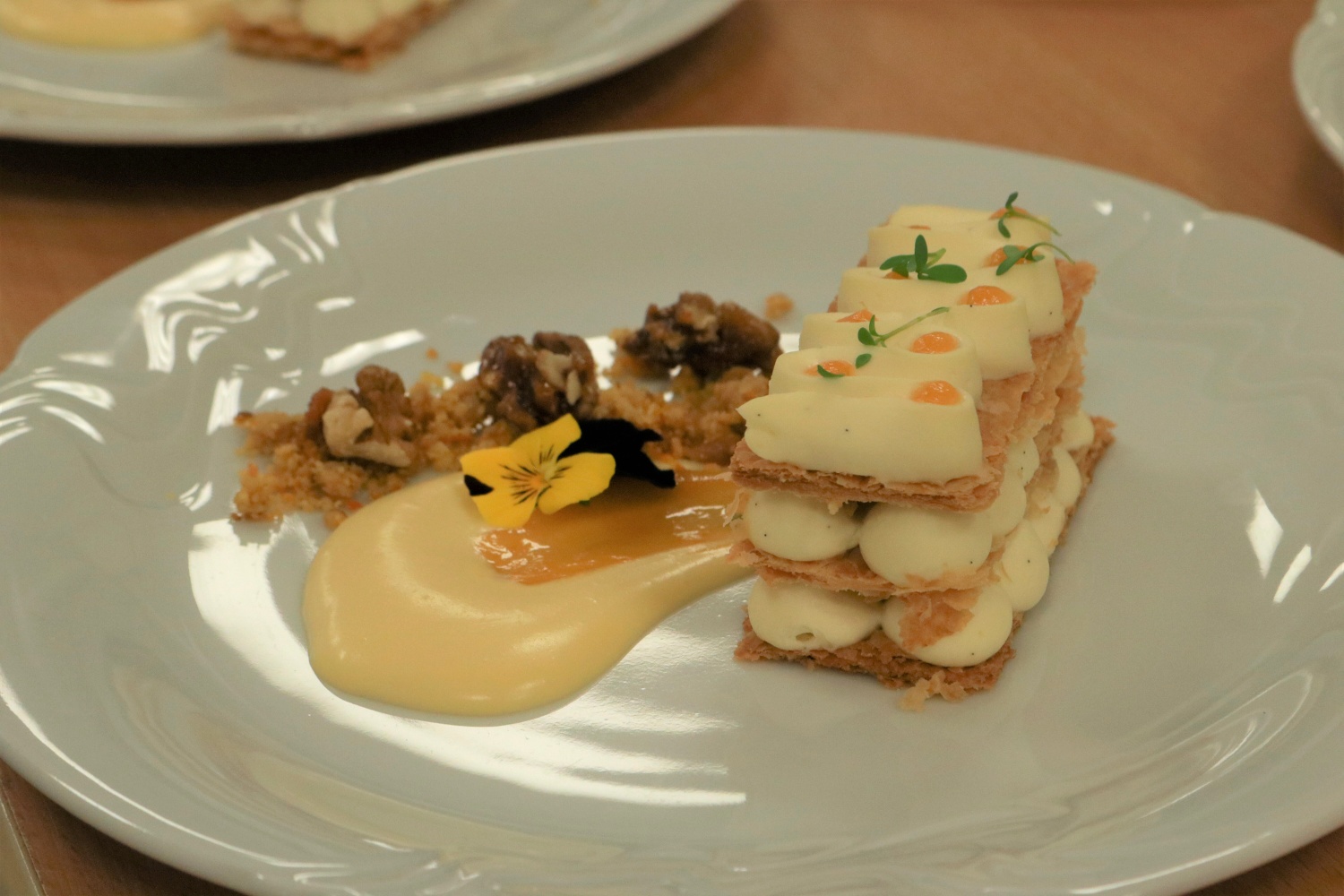 Jako předkrm jsme podávali marinovanou řepu s feta sýrem, ředkvičkami, wasabi pěnou a karamelizovanými ořechy. Dále následovala polévka – hráškový krém s mátou, pošírovaným křepelčím vejcem a slaninou. K polévce a předkrmu se servírovaly dva druhy banketního pečiva – s rozmarýnem a s česnekem. Jako hlavní chod jsme rodičům připravili kachní prso sous vide s batátovým pyré, zeleninou a omáčkou z portského vína. A jako sladkou tečku na konec jsme podávali rozložený štrúdl s vanilkovým krémem, meruňkové compoté a anglický krém s ořechovým likérem. Během banketu bylo hostům naléváno víno z vinařství Klučov a k dezertu dostali šálek kávy z Amáres coffee.