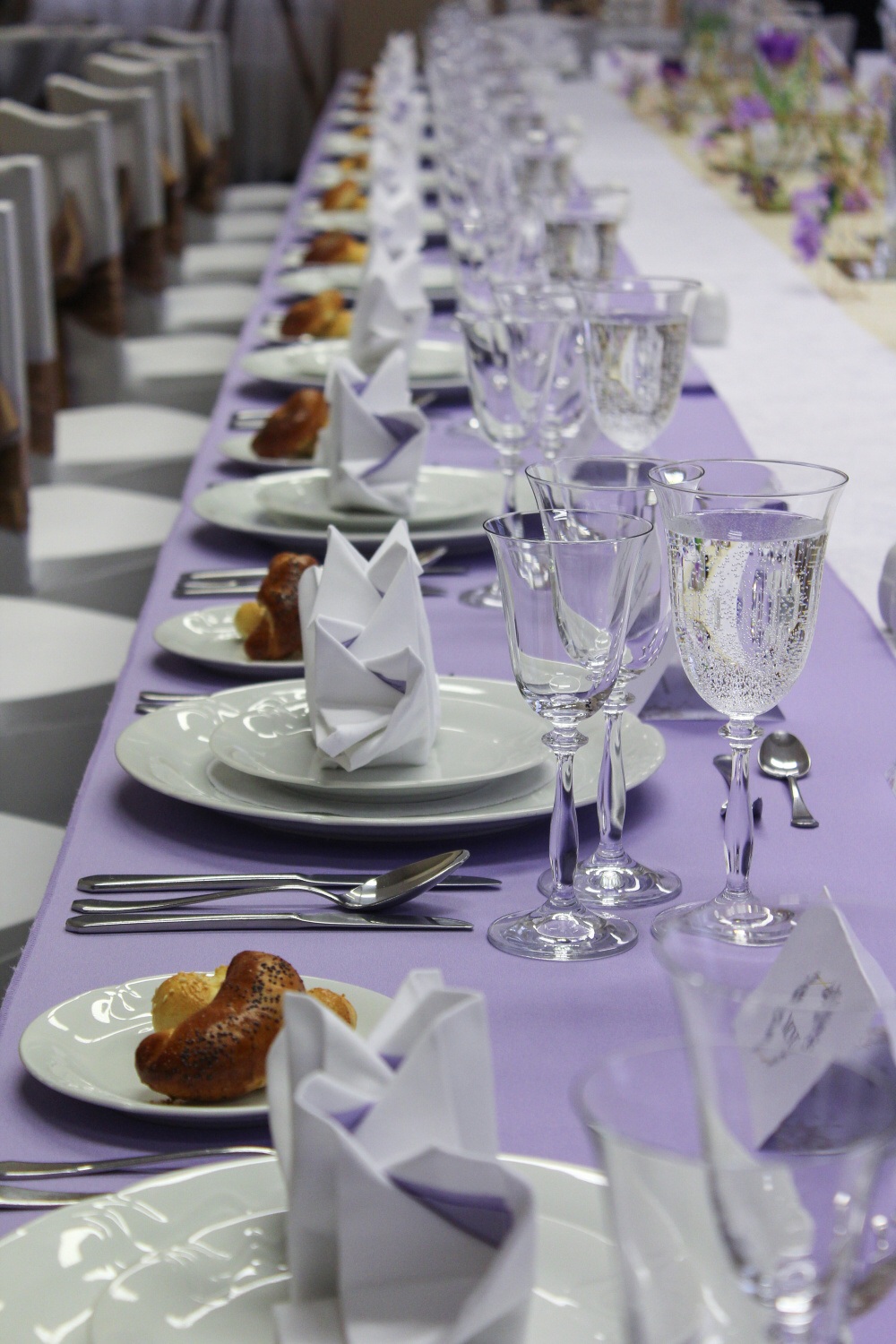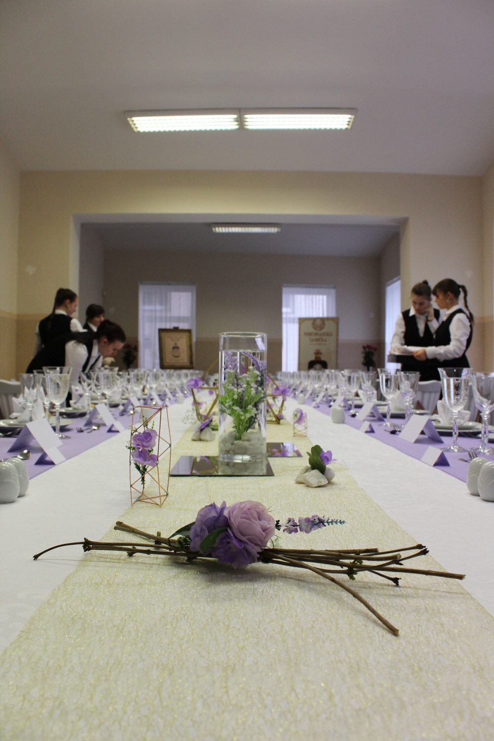 Vše jsme ladili do světle fialové a zlaté barvy. Jako dekorace jsme vybrali ostré tvary – obdélníková zrcadla, pentagony a geometrická kola. Většina našich dekorací byla ručně vyráběna a tím se naše osobnosti mohly přenést do naší slavnostní tabule.