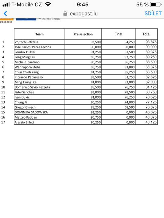 Pro mne to bylo neuvěřitelné, jelikož na prestižní mezinárodní soutěži se sejdou ti nejlepší z celého světa a uspět mezi nimi je velký úspěch. Nicméně nebyl čas na oslavy, protože jsem se hned zapojil do přípravy studené kuchyně. Náš tým pracoval celou noc, aby mohl prezentovat své výrobky. V pět hodin jsme unavení skončili, vše naaranžovali, připravili pro porotce a čekali na výsledek. Po vyhlášení jsme se dostali do stříbrného pásma, což je sám o sobě úspěch, a až po celkovém vyhlášení jsme zjistili, že jsme se probojovali na celkové 4. místo z 36 týmů celého světa.