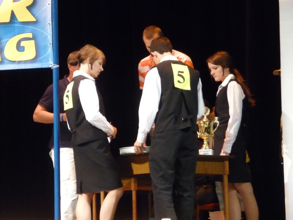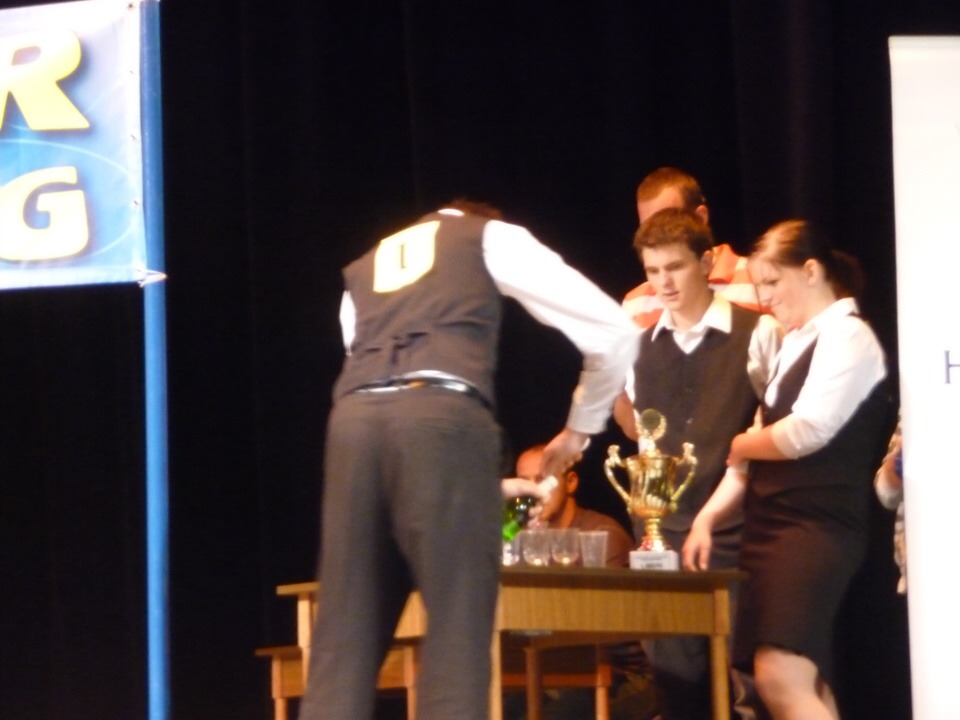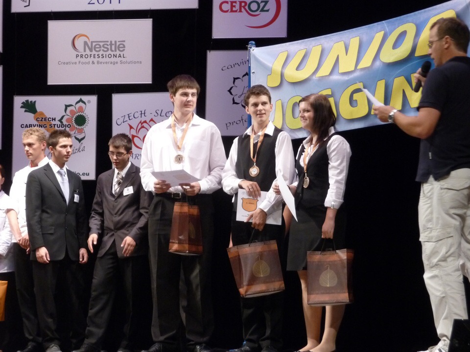 Naši školu pilně zastupovali i studenti v junior joggingu, což je běh číšníků s vínem. Této soutěže se od nás účastnili 2 týmy po třech. První tým se skládal z Jana Krčmaříka, Péti Kožíškové a Lukáše Rozkydala. Druhý tým tvořil Adam Glemba, Verča Vaisová a Zuzka Hoskovcová. Úkolem číšníků bylo v co nejkratším čase otevřít láhev vína, zdolat překážky s plným kelímkem a rozlít minimální množství vína.. I zde jsme uspěli a umístili se na třetím místě.