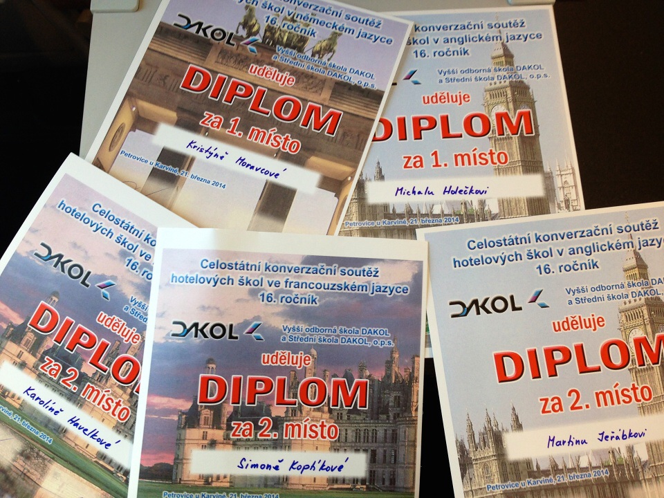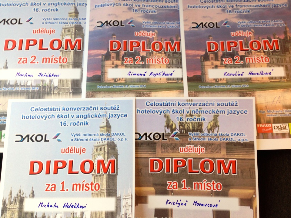 20. a 21. března se soutěžní tým naší školy zúčastnil již šestnáctého ročníku celostátní konverzační soutěže hotelových škol České republiky, kterou letos pořádala Hotelová škola DAKOL v Petrovicích u Karviné. Mezi soutěžními týmy hotelových a gastronomických škol z celé České republiky potvrdili poděbradští prioritní pozici cizojazyčného vzdělávání ve své škole a obhájili prestižní postavení poděbradské hotelovky v této soutěži. Ve francouzském jazyce vybojovala děvčata v obou kategoriích druhé místo, Karolína Havelková v mladší kategorii a Simona Koptíková v kategorii starší, maturantské. V němčině v mladší kategorii zvítězila naše soutěžící Kristýna Moravcová, v němčině starší kategorie se Lukáš Teňak umístil jako čtvrtý. V nejpočetněji zastoupené angličtině si Martin Jeřábek odvezl z mladší kategorie druhé místo, zatímco v kategorii maturantů znamenalo vystoupení Michala Holečka jednoznačné vítězství.