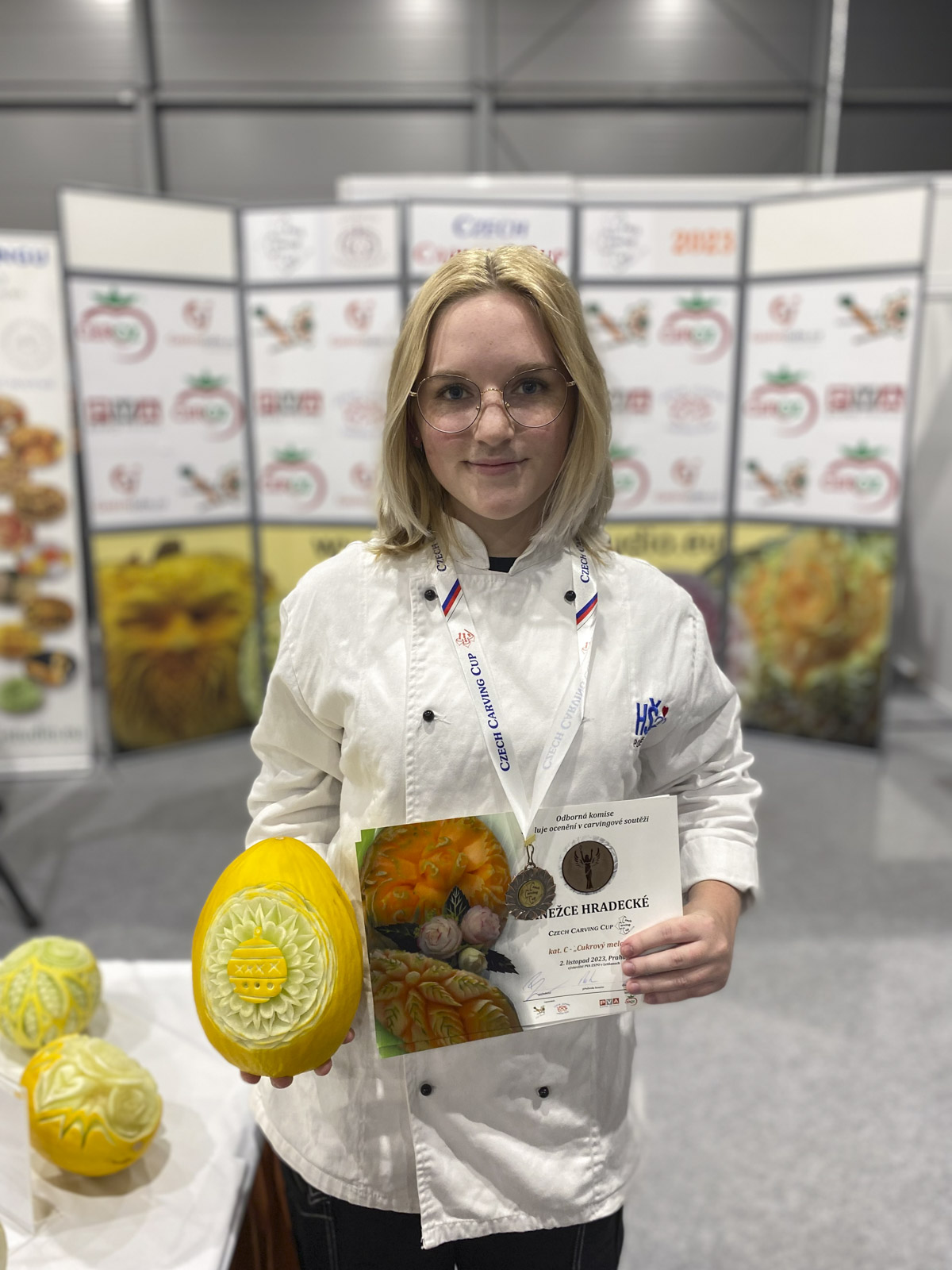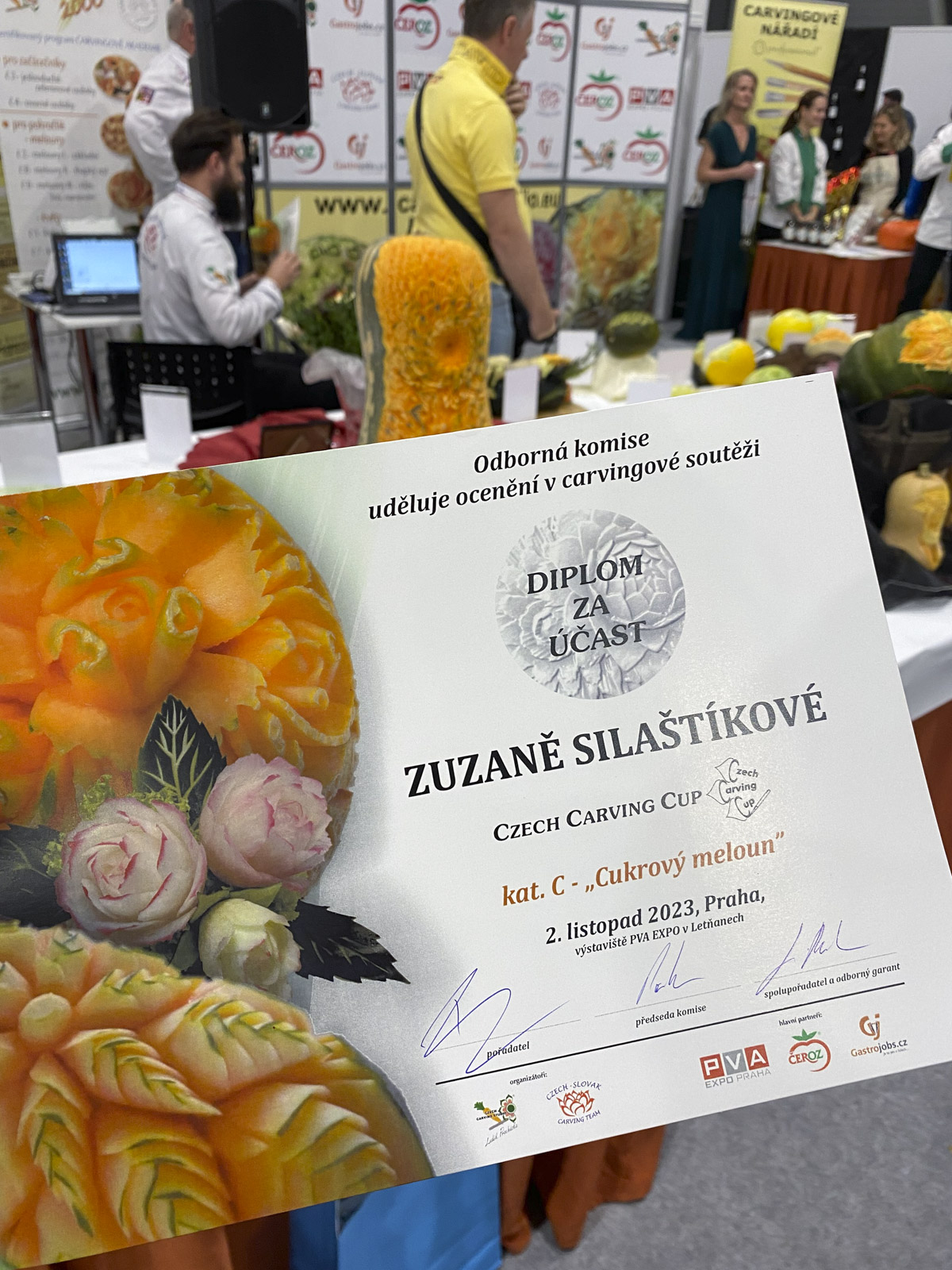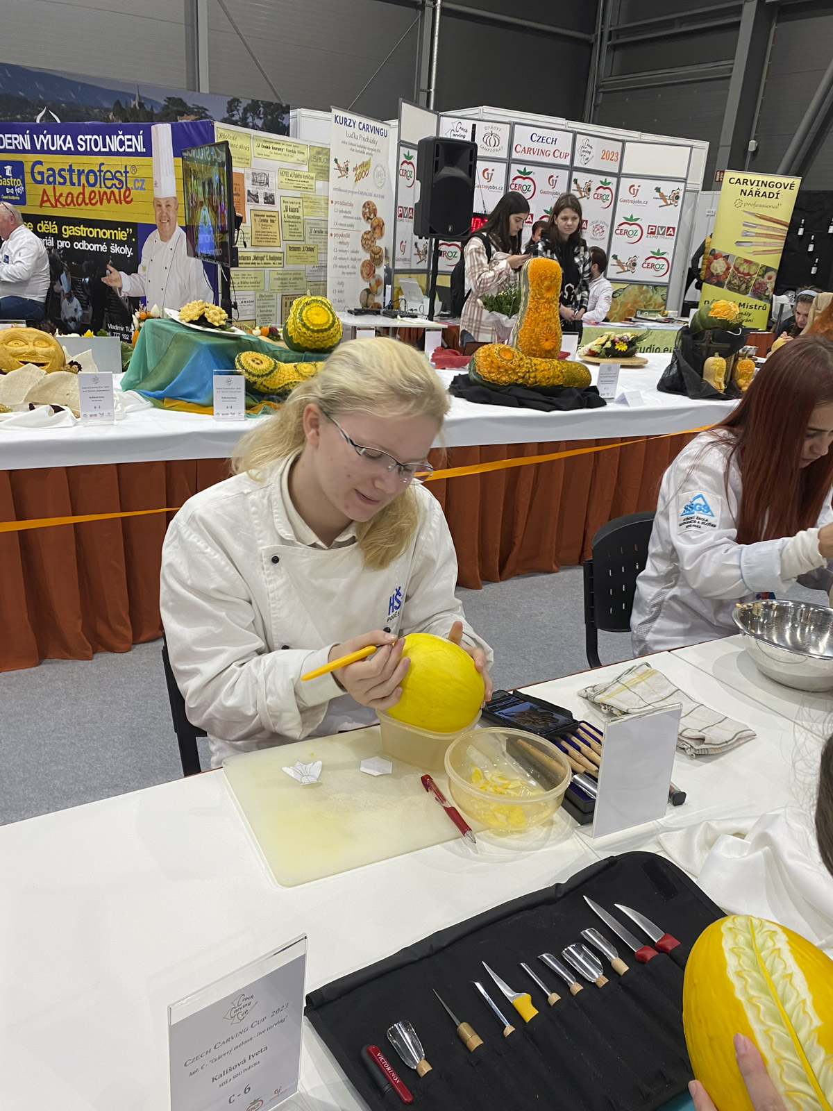 Soutěž se konala v areálu PVA Letňany v Praze v rámci festivalu FOR GASTRO & HOTEL. Ráno po příjezdu na místo jsme se zaregistrovaly a připravily si pomůcky na vyřezávání.