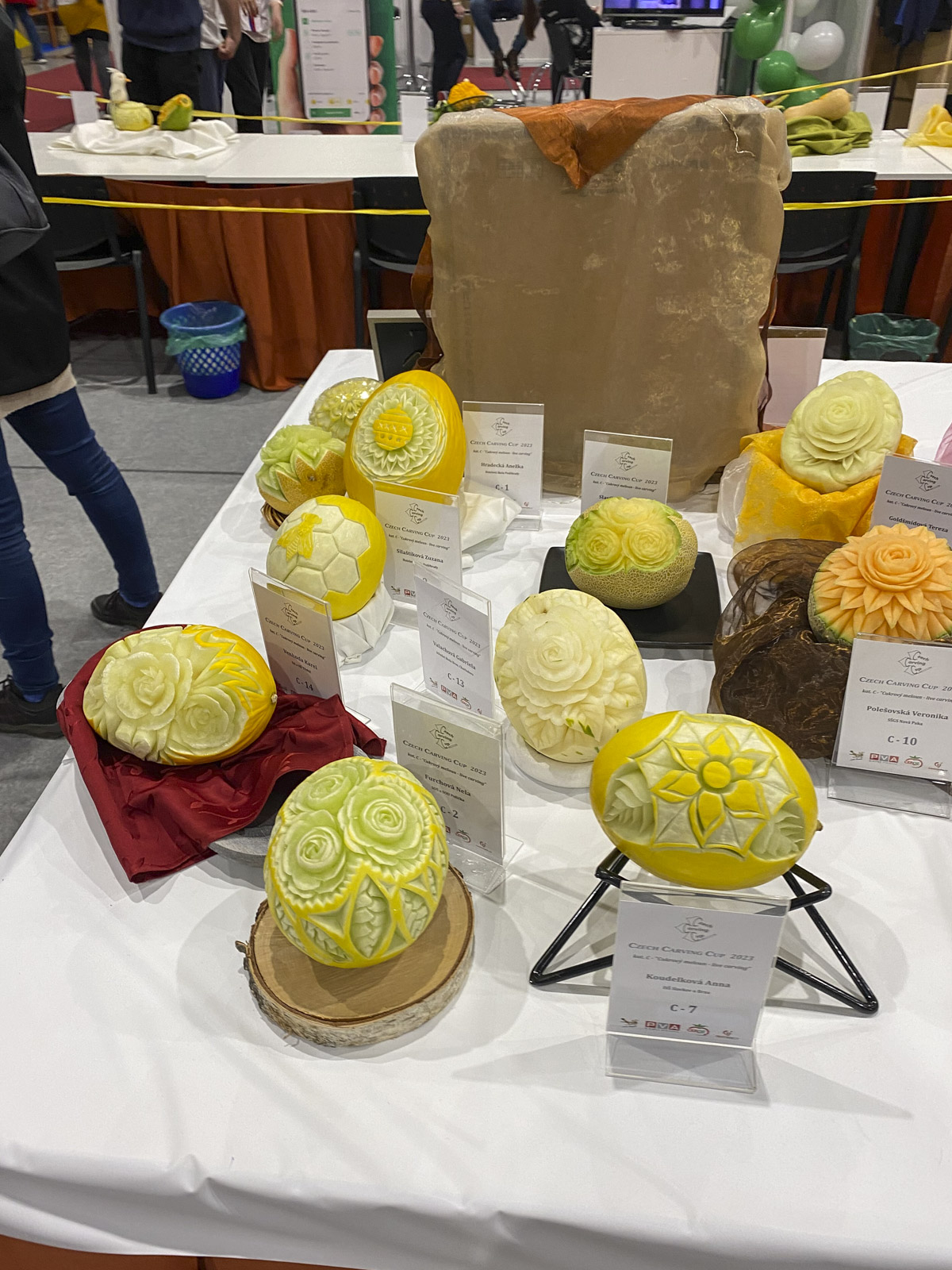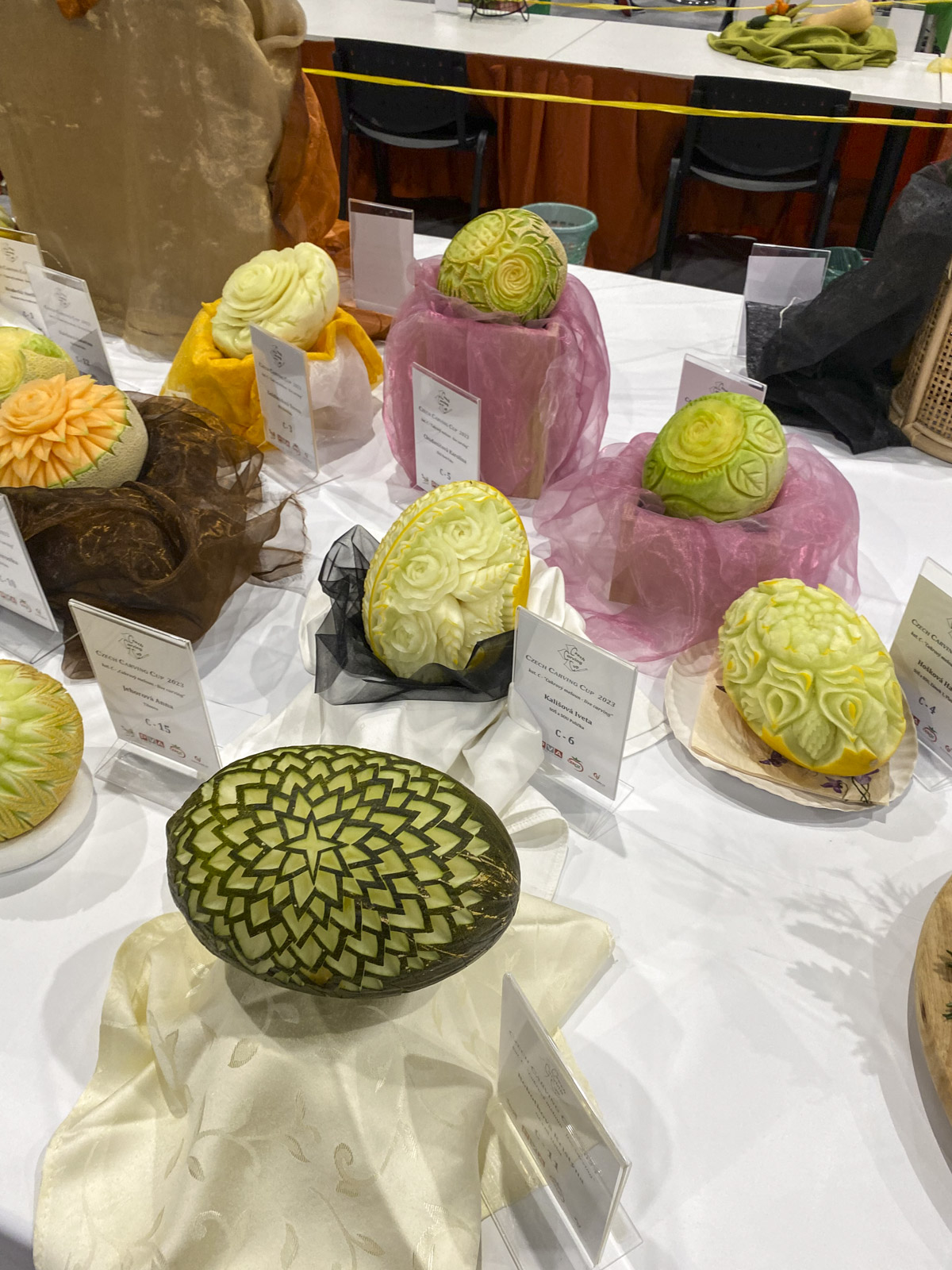 Po vypršení časového limitu jsme si uklidily na svých pracovních místech a přesunuly naše melouny na výstavní stůl. Poté začala live soutěž kategorie pokročilých řezbářů, která pro nás byla velkou inspirací.