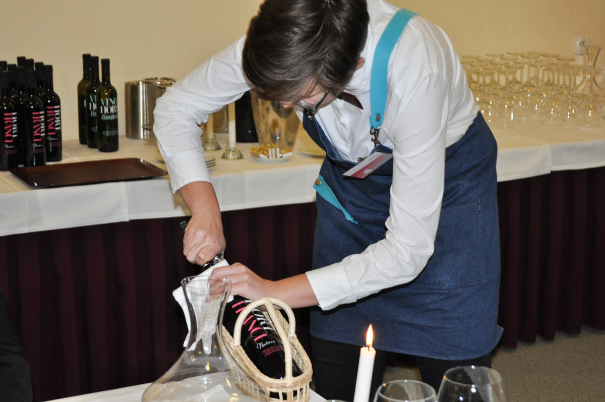 Po obědě přišel na řadu servis červeného vína. V časovém limitu sedmi minut museli soutěžící prezentovat víno, provést dekantaci a servis vína. Servíroval se francouzský Merlot z vinařství Hort.