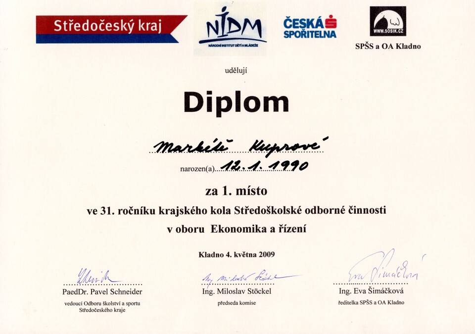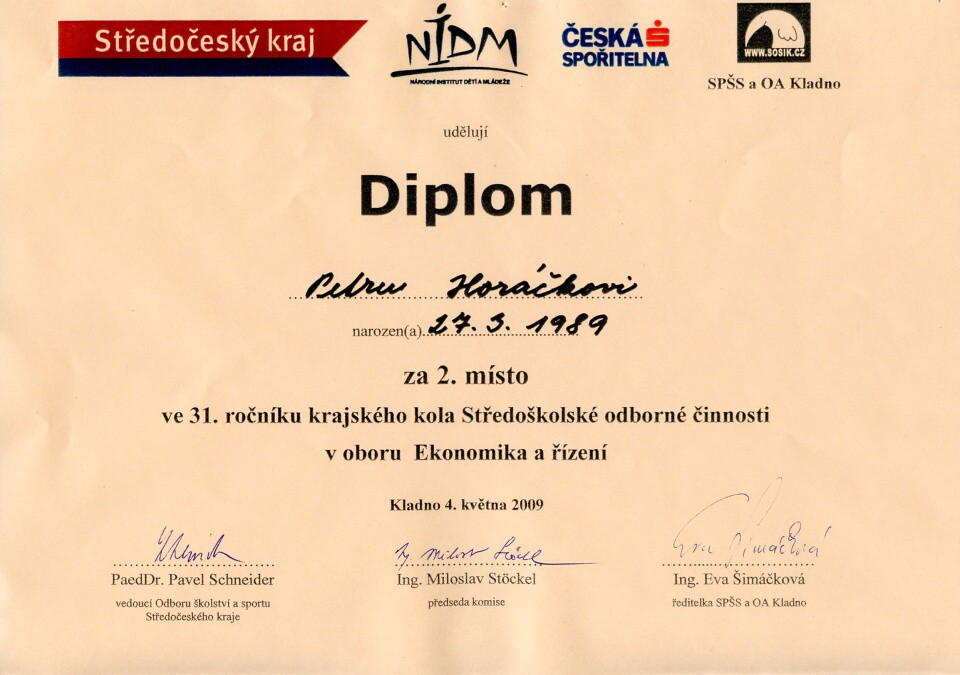 V rámci oboru Ekonomika jsme zaslali dvě práce, které získaly 1. a 2. místo a postupují do celostátní soutěže konané dne 15. – 17. 6. 2009 ve Dvoře Králové nad Labem.