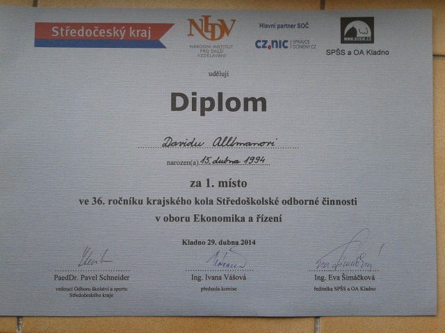 V rámci oboru Ekonomika jsme zaslali dvě práce, které získaly 1. a 2. místo a 1. práce postupuje do celostátní soutěže konané dne 13. – 15. 6. 2014 v Plzni.