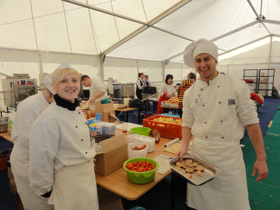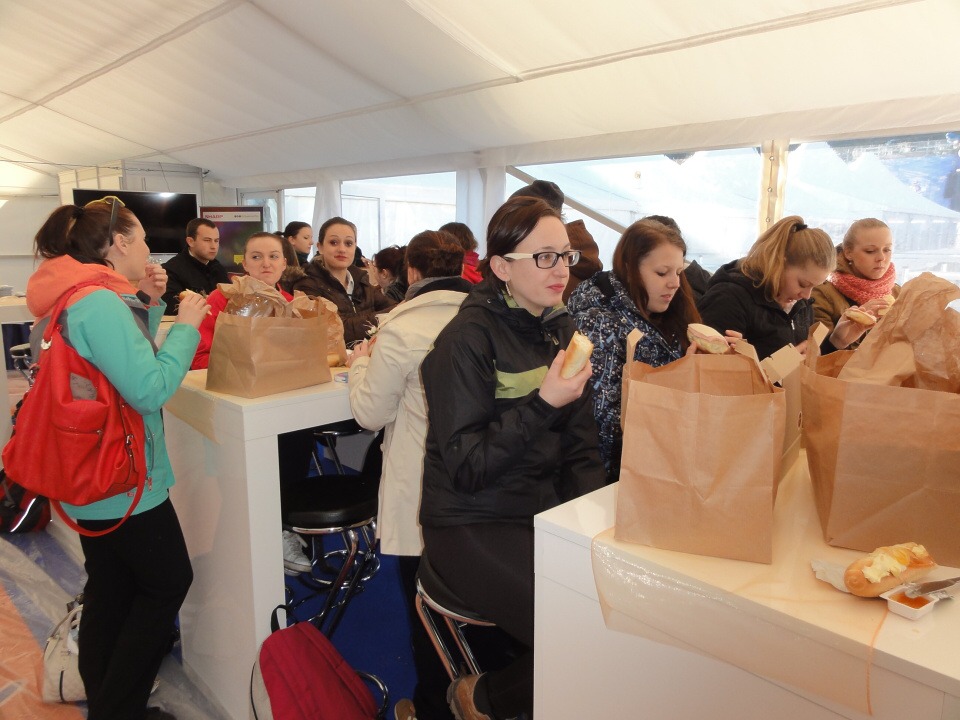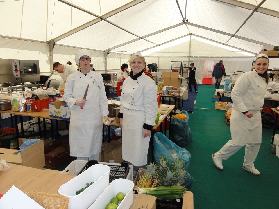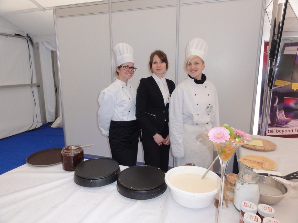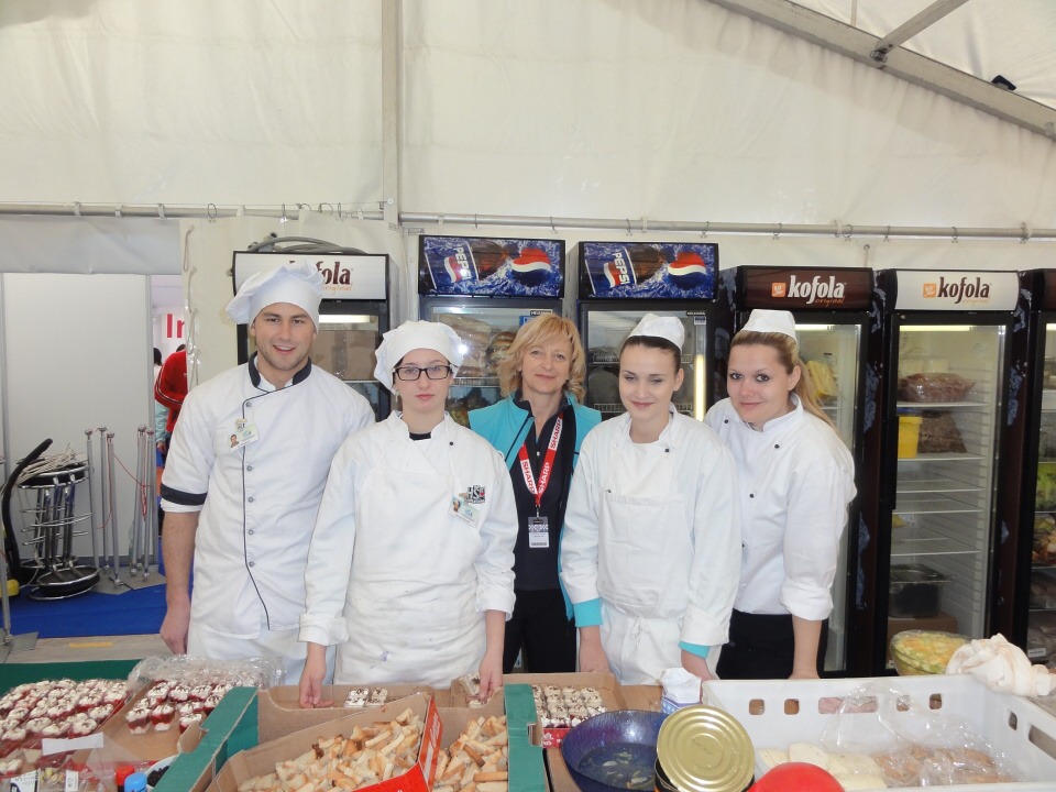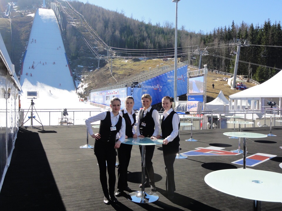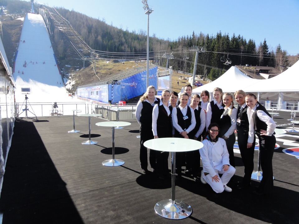 Od 12. – 16. 3. 2014 se 27 studentů všech ročníků vyšší odborné školy vydalo na Mistrovství světa v letech na lyžích do Harrachova zajišťovat catering. Popravdě nikdo z nás netušil, jak náročné to bude a kolik hodin denně budeme muset stát s úsměvem na nohou a obsluhovat VIP hosty. Ale přesto jsme do toho šli. Cateringová společnost nám zajistila krásné ubytování v dřevěných apartmánech s bohatou snídaní a odvozem na stanoviště luxusními automobily. Každý den začínal přípravami jednotlivých pracovišť, po kterých následoval meeting, kde byl zhodnocen předchozí den. Někteří z nás obsluhovali VIP salónky, jiní připravovali občerstvení v kuchyni a další prodávali venku ve stáncích občerstvení a nápoje. Pan Lahoda, majitel cateringové společnosti, byl s námi velice spokojen a nešetřil slovy chvály. Celkově na akci vládla přátelská atmosféra, nejen mezi námi obsluhujícími a šéfy, ale hlavně mezi hosty a námi. To se nám hned pracovalo mnohem lépe, když jsme viděli, že naši snahu dokázal někdo ocenit.