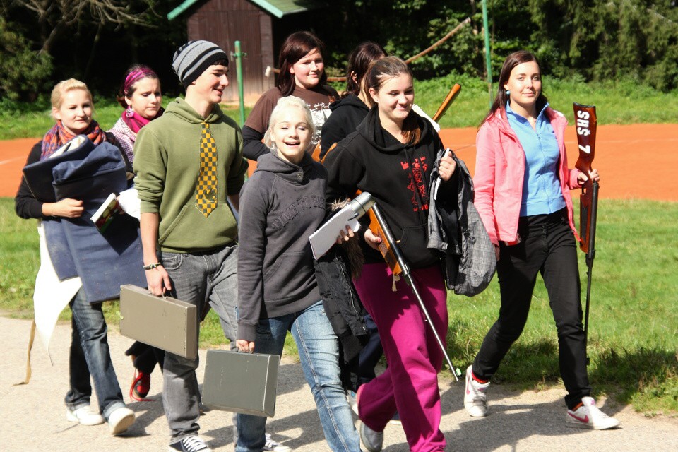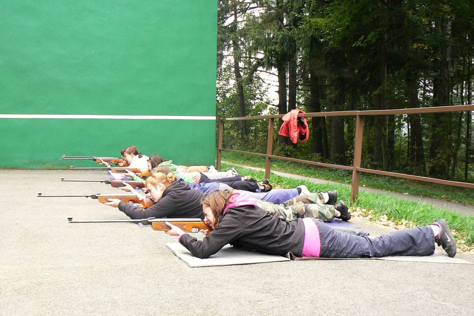 Pro dopolední program byla připravená stanoviště a na každém z nich byl připraven jeden učitel, který nás „prakticky připravil“ na odpoledne. Od pana Kupra jsme se naučili vázat uzle a základy slaňovaní, práci s mapou a buzolou nám objasnil pan Skořepa, výše zmíněnou ochranu obyvatelstva nám vysvětlila paní Procházková, pádlování nás naučil pan Formánek a se střelbou nás seznámil pan Bártl.