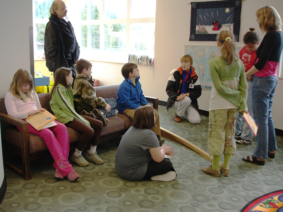 V jedenáct zastavujeme v Charter School. Dřevěná, zajímavě řešená škola je postavená na pilotech, pod budovami jsou hřiště, takže za deštivého počasí se děti mají kde proběhnout. Uprostřed areálu je knihovna obklopená třídami, z každé třídy je okamžitý přístup do knihovny, která je srdcem školy. Třídy jsou vlastně jen větší kóje oddělené jen skříněmi, závěsem, či jinak. Nejsem si úplně jistá, zda se při výuce neruší, ale asi jsou tady na to zvyklí. Každá třída je přehlídkou výsledků kreativní práce dětí, na zdech jsou výkresy, koláže, básničky třeba na téma: Kdo není z Aljašky, neví co je…sníh, medvěd, orel, velryba…a následuje popis, případně výčet vlastností sněhu, medvěda a tak. Děti se ve třídě převlékají na tělocvik = z kecek to tam trochu zavání a naše školní hygieničky by asi spustily povyk. Připouštím, že naše šatny mají své opodstatnění. V jedné ze tříd předvádí mladý muž techniku bulharského hrdelního zpěvu. Je to zajímavé, chvíli mám pocit, že slyším i několik hudebních nástrojů. Děti reagují, spontánně, bez ostychu se ptají na to, co je zajímá. Tak tady se rodí ta sebevědomá populace…